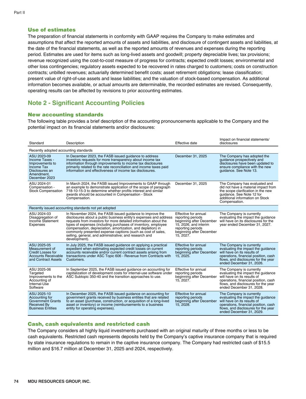 Part II MDU RESOURCES GROUP, INC.74 Use of estimates The preparation of financial statements in conformity with GAAP requires the Company to make estimates and assumptions that affect the reported amounts of assets and liabilities, and disclosure of contingent assets and liabilities, at the date of the financial statements, as well as the reported amounts of revenues and expenses during the reporting period. Estimates are used for items such as long-lived assets and goodwill; property depreciable lives; tax provisions; revenue recognized using the cost-to-cost measure of progress for contracts; expected credit losses; environmental and other loss contingencies; regulatory assets expected to be recovered in rates charged to customers; costs on construction contracts; unbilled revenues; actuarially determined benefit costs; asset retirement obligations; lease classification; present value of right-of-use assets and lease liabilities; and the valuation of stock-based compensation. As additional information becomes available, or actual amounts are determinable, the recorded estimates are revised. Consequently, operating results can be affected by revisions to prior accounting estimates. Note 2 - Significant Accounting Policies New accounting standards The following table provides a brief description of the accounting pronouncements applicable to the Company and the potential impact on its financial statements and/or disclosures: Standard Description Effective date Impact on financial statements/ disclosures Recently adopted accounting standards ASU 2023-09 Income Taxes - Improvements to Income Tax Disclosures an Amendment, December 2023 In December 2023, the FASB issued guidance to address investors requests for more transparency about income tax information through improvements to income tax disclosures primarily related to the rate reconciliation and income taxes paid information and effectiveness of income tax disclosures. December 31, 2025 The Company has adopted the guidance prospectively and disclosures have been updated to ensure compliance with the new guidance. See Note 13. ASU 2024-01 Compensation - Stock Compensation In March 2024, the FASB issued Improvements to GAAP through an example to demonstrate application of the scope of paragraph 718-10-15-3 to determine whether profits interest and similar awards should be accounted in Compensation - Stock Compensation. December 31, 2025 The Company has evaluated and did not have a material impact from the scope clarification in the new guidance. See Note 12 for additional information on Stock Compensation. Recently issued accounting standards not yet adopted ASU 2024-03 Disaggregation of Income Statement Expenses In November 2024, the FASB issued guidance to improve the disclosures about a public business entity's expenses and address requests from investors for more detailed information about the types of expenses (including purchases of inventory, employee compensation, depreciation, amortization, and depletion) in commonly presented expense captions (such as cost of sales, selling, general, and administrative; and research and development). Effective for annual reporting periods beginning after December 15, 2026, and interim reporting periods beginning after December 15, 2027. The Company is currently evaluating the impact the guidance will have on its disclosures for the year ended December 31, 2027. ASU 2025-05 Measurement of Credit Losses for Accounts Receivable and Contract Assets In July 2025, the FASB issued guidance on applying a practical expedient when estimating expected credit losses on current accounts receivable and/or current contract assets arising from transactions under ASC Topic 606 - Revenue from Contracts with Customers. Effective for annual reporting periods beginning after December 15, 2025. The Company is currently evaluating the impact the guidance will have on its results of operations, financial position, cash flows, and disclosures for the year ended December 31, 2026. ASU 2025-06 Targeted Improvements to the Accounting of Internal-Use Software In September 2025, the FASB issued guidance on accounting for capitalization of development costs for internal-use software under ASC Subtopic 350-40 and the transition approaches to use. Effective for annual reporting periods beginning after December 15, 2027. The Company is currently evaluating the impact the guidance will have on its results of operations, financial position, cash flows, and disclosures for the year ended December 31, 2028. ASU 2025-10 Accounting for Government Grants Received By Business Entities In December 2025, the FASB issued guidance on accounting for government grants received by business entities that are related to an asset (purchase, construction, or acquisition of a long-lived asset or inventory) or income (reimbursements to a business entity for operating expenses). Effective for annual reporting periods beginning after December 15, 2028. The Company is currently evaluating the impact the guidance will have on its results of operations, financial position, cash flows, and disclosures for the year ended December 31, 2029. Cash, cash equivalents and restricted cash The Company considers all highly liquid investments purchased with an original maturity of three months or less to be cash equivalents. Restricted cash represents deposits held by the Company’s captive insurance company that is required by state insurance regulations to remain in the captive insurance company. The Company had restricted cash of $15.5 million and $16.7 million at December 31, 2025 and 2024, respectively. Index Part II 74 MDU Resources Group, Inc. Form 10-K