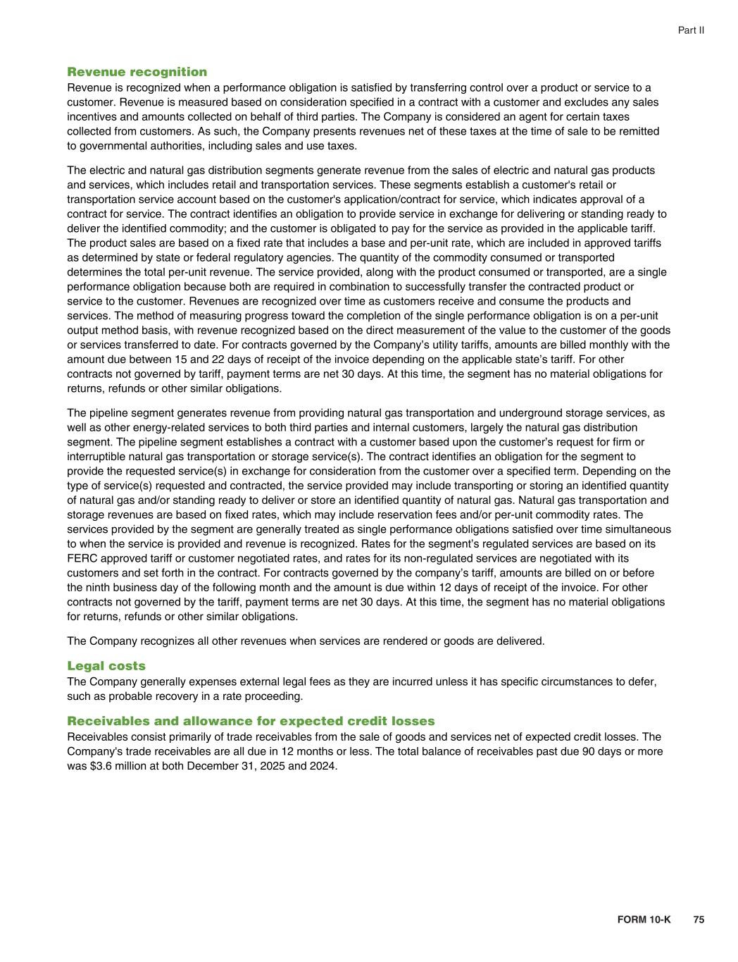 Part II 75FORM 10-K Revenue recognition Revenue is recognized when a performance obligation is satisfied by transferring control over a product or service to a customer. Revenue is measured based on consideration specified in a contract with a customer and excludes any sales incentives and amounts collected on behalf of third parties. The Company is considered an agent for certain taxes collected from customers. As such, the Company presents revenues net of these taxes at the time of sale to be remitted to governmental authorities, including sales and use taxes. The electric and natural gas distribution segments generate revenue from the sales of electric and natural gas products and services, which includes retail and transportation services. These segments establish a customer's retail or transportation service account based on the customer's application/contract for service, which indicates approval of a contract for service. The contract identifies an obligation to provide service in exchange for delivering or standing ready to deliver the identified commodity; and the customer is obligated to pay for the service as provided in the applicable tariff. The product sales are based on a fixed rate that includes a base and per-unit rate, which are included in approved tariffs as determined by state or federal regulatory agencies. The quantity of the commodity consumed or transported determines the total per-unit revenue. The service provided, along with the product consumed or transported, are a single performance obligation because both are required in combination to successfully transfer the contracted product or service to the customer. Revenues are recognized over time as customers receive and consume the products and services. The method of measuring progress toward the completion of the single performance obligation is on a per-unit output method basis, with revenue recognized based on the direct measurement of the value to the customer of the goods or services transferred to date. For contracts governed by the Company’s utility tariffs, amounts are billed monthly with the amount due between 15 and 22 days of receipt of the invoice depending on the applicable state’s tariff. For other contracts not governed by tariff, payment terms are net 30 days. At this time, the segment has no material obligations for returns, refunds or other similar obligations. The pipeline segment generates revenue from providing natural gas transportation and underground storage services, as well as other energy-related services to both third parties and internal customers, largely the natural gas distribution segment. The pipeline segment establishes a contract with a customer based upon the customer’s request for firm or interruptible natural gas transportation or storage service(s). The contract identifies an obligation for the segment to provide the requested service(s) in exchange for consideration from the customer over a specified term. Depending on the type of service(s) requested and contracted, the service provided may include transporting or storing an identified quantity of natural gas and/or standing ready to deliver or store an identified quantity of natural gas. Natural gas transportation and storage revenues are based on fixed rates, which may include reservation fees and/or per-unit commodity rates. The services provided by the segment are generally treated as single performance obligations satisfied over time simultaneous to when the service is provided and revenue is recognized. Rates for the segment’s regulated services are based on its FERC approved tariff or customer negotiated rates, and rates for its non-regulated services are negotiated with its customers and set forth in the contract. For contracts governed by the company’s tariff, amounts are billed on or before the ninth business day of the following month and the amount is due within 12 days of receipt of the invoice. For other contracts not governed by the tariff, payment terms are net 30 days. At this time, the segment has no material obligations for returns, refunds or other similar obligations. The Company recognizes all other revenues when services are rendered or goods are delivered. Legal costs The Company generally expenses external legal fees as they are incurred unless it has specific circumstances to defer, such as probable recovery in a rate proceeding. Receivables and allowance for expected credit losses Receivables consist primarily of trade receivables from the sale of goods and services net of expected credit losses. The Company's trade receivables are all due in 12 months or less. The total balance of receivables past due 90 days or more was $3.6 million at both December 31, 2025 and 2024. Index Part II MDU Resources Group, Inc. Form 10-K 75
