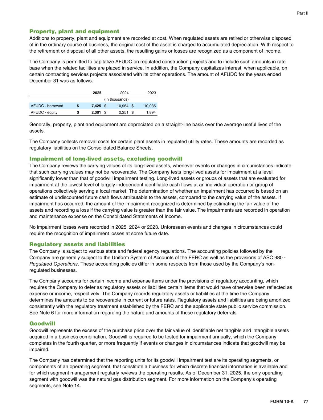 Part II 77FORM 10-K Property, plant and equipment Additions to property, plant and equipment are recorded at cost. When regulated assets are retired or otherwise disposed of in the ordinary course of business, the original cost of the asset is charged to accumulated depreciation. With respect to the retirement or disposal of all other assets, the resulting gains or losses are recognized as a component of income. The Company is permitted to capitalize AFUDC on regulated construction projects and to include such amounts in rate base when the related facilities are placed in service. In addition, the Company capitalizes interest, when applicable, on certain contracting services projects associated with its other operations. The amount of AFUDC for the years ended December 31 was as follows: 2025 2024 2023 (In thousands) AFUDC - borrowed $ 7,425 $ 10,964 $ 10,035 AFUDC - equity $ 2,301 $ 2,251 $ 1,894 Generally, property, plant and equipment are depreciated on a straight-line basis over the average useful lives of the assets. The Company collects removal costs for certain plant assets in regulated utility rates. These amounts are recorded as regulatory liabilities on the Consolidated Balance Sheets. Impairment of long-lived assets, excluding goodwill The Company reviews the carrying values of its long-lived assets, whenever events or changes in circumstances indicate that such carrying values may not be recoverable. The Company tests long-lived assets for impairment at a level significantly lower than that of goodwill impairment testing. Long-lived assets or groups of assets that are evaluated for impairment at the lowest level of largely independent identifiable cash flows at an individual operation or group of operations collectively serving a local market. The determination of whether an impairment has occurred is based on an estimate of undiscounted future cash flows attributable to the assets, compared to the carrying value of the assets. If impairment has occurred, the amount of the impairment recognized is determined by estimating the fair value of the assets and recording a loss if the carrying value is greater than the fair value. The impairments are recorded in operation and maintenance expense on the Consolidated Statements of Income. No impairment losses were recorded in 2025, 2024 or 2023. Unforeseen events and changes in circumstances could require the recognition of impairment losses at some future date. Regulatory assets and liabilities The Company is subject to various state and federal agency regulations. The accounting policies followed by the Company are generally subject to the Uniform System of Accounts of the FERC as well as the provisions of ASC 980 - Regulated Operations. These accounting policies differ in some respects from those used by the Company's non- regulated businesses. The Company accounts for certain income and expense items under the provisions of regulatory accounting, which requires the Company to defer as regulatory assets or liabilities certain items that would have otherwise been reflected as expense or income, respectively. The Company records regulatory assets or liabilities at the time the Company determines the amounts to be recoverable in current or future rates. Regulatory assets and liabilities are being amortized consistently with the regulatory treatment established by the FERC and the applicable state public service commission. See Note 6 for more information regarding the nature and amounts of these regulatory deferrals. Goodwill Goodwill represents the excess of the purchase price over the fair value of identifiable net tangible and intangible assets acquired in a business combination. Goodwill is required to be tested for impairment annually, which the Company completes in the fourth quarter, or more frequently if events or changes in circumstances indicate that goodwill may be impaired. The Company has determined that the reporting units for its goodwill impairment test are its operating segments, or components of an operating segment, that constitute a business for which discrete financial information is available and for which segment management regularly reviews the operating results. As of December 31, 2025, the only operating segment with goodwill was the natural gas distribution segment. For more information on the Company's operating segments, see Note 14. Index Part II MDU Resources Group, Inc. Form 10-K 77