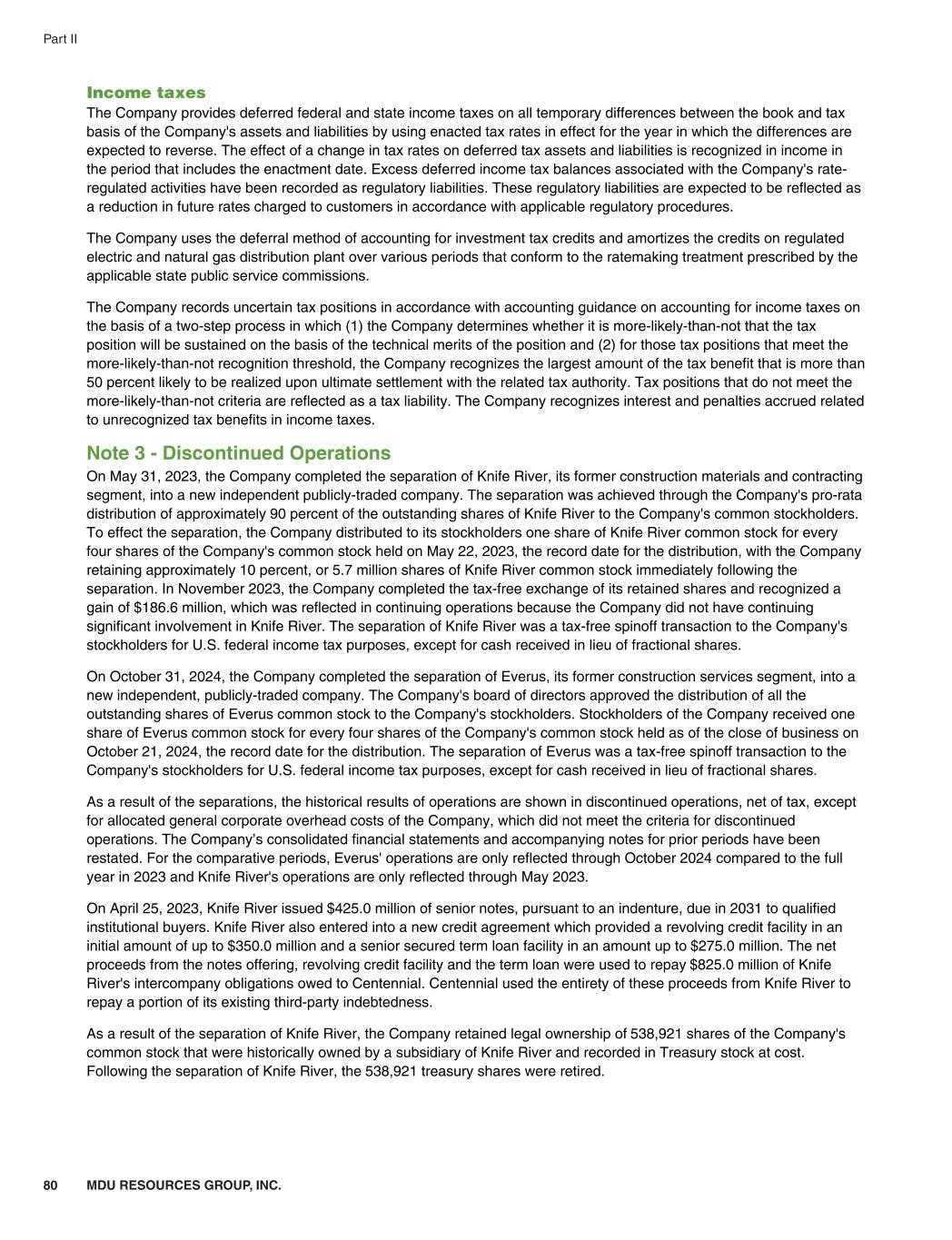 Part II MDU RESOURCES GROUP, INC.80 Income taxes The Company provides deferred federal and state income taxes on all temporary differences between the book and tax basis of the Company's assets and liabilities by using enacted tax rates in effect for the year in which the differences are expected to reverse. The effect of a change in tax rates on deferred tax assets and liabilities is recognized in income in the period that includes the enactment date. Excess deferred income tax balances associated with the Company's rate- regulated activities have been recorded as regulatory liabilities. These regulatory liabilities are expected to be reflected as a reduction in future rates charged to customers in accordance with applicable regulatory procedures. The Company uses the deferral method of accounting for investment tax credits and amortizes the credits on regulated electric and natural gas distribution plant over various periods that conform to the ratemaking treatment prescribed by the applicable state public service commissions. The Company records uncertain tax positions in accordance with accounting guidance on accounting for income taxes on the basis of a two-step process in which (1) the Company determines whether it is more-likely-than-not that the tax position will be sustained on the basis of the technical merits of the position and (2) for those tax positions that meet the more-likely-than-not recognition threshold, the Company recognizes the largest amount of the tax benefit that is more than 50 percent likely to be realized upon ultimate settlement with the related tax authority. Tax positions that do not meet the more-likely-than-not criteria are reflected as a tax liability. The Company recognizes interest and penalties accrued related to unrecognized tax benefits in income taxes. Note 3 - Discontinued Operations On May 31, 2023, the Company completed the separation of Knife River, its former construction materials and contracting segment, into a new independent publicly-traded company. The separation was achieved through the Company's pro-rata distribution of approximately 90 percent of the outstanding shares of Knife River to the Company's common stockholders. To effect the separation, the Company distributed to its stockholders one share of Knife River common stock for every four shares of the Company's common stock held on May 22, 2023, the record date for the distribution, with the Company retaining approximately 10 percent, or 5.7 million shares of Knife River common stock immediately following the separation. In November 2023, the Company completed the tax-free exchange of its retained shares and recognized a gain of $186.6 million, which was reflected in continuing operations because the Company did not have continuing significant involvement in Knife River. The separation of Knife River was a tax-free spinoff transaction to the Company's stockholders for U.S. federal income tax purposes, except for cash received in lieu of fractional shares. On October 31, 2024, the Company completed the separation of Everus, its former construction services segment, into a new independent, publicly-traded company. The Company's board of directors approved the distribution of all the outstanding shares of Everus common stock to the Company's stockholders. Stockholders of the Company received one share of Everus common stock for every four shares of the Company's common stock held as of the close of business on October 21, 2024, the record date for the distribution. The separation of Everus was a tax-free spinoff transaction to the Company's stockholders for U.S. federal income tax purposes, except for cash received in lieu of fractional shares. As a result of the separations, the historical results of operations are shown in discontinued operations, net of tax, except for allocated general corporate overhead costs of the Company, which did not meet the criteria for discontinued operations. The Company’s consolidated financial statements and accompanying notes for prior periods have been restated. For the comparative periods, Everus' operations are only reflected through October 2024 compared to the full year in 2023 and Knife River's operations are only reflected through May 2023. On April 25, 2023, Knife River issued $425.0 million of senior notes, pursuant to an indenture, due in 2031 to qualified institutional buyers. Knife River also entered into a new credit agreement which provided a revolving credit facility in an initial amount of up to $350.0 million and a senior secured term loan facility in an amount up to $275.0 million. The net proceeds from the notes offering, revolving credit facility and the term loan were used to repay $825.0 million of Knife River's intercompany obligations owed to Centennial. Centennial used the entirety of these proceeds from Knife River to repay a portion of its existing third-party indebtedness. As a result of the separation of Knife River, the Company retained legal ownership of 538,921 shares of the Company's common stock that were historically owned by a subsidiary of Knife River and recorded in Treasury stock at cost. Following the separation of Knife River, the 538,921 treasury shares were retired. Index Part II 80 MDU Resources Group, Inc. Form 10-K