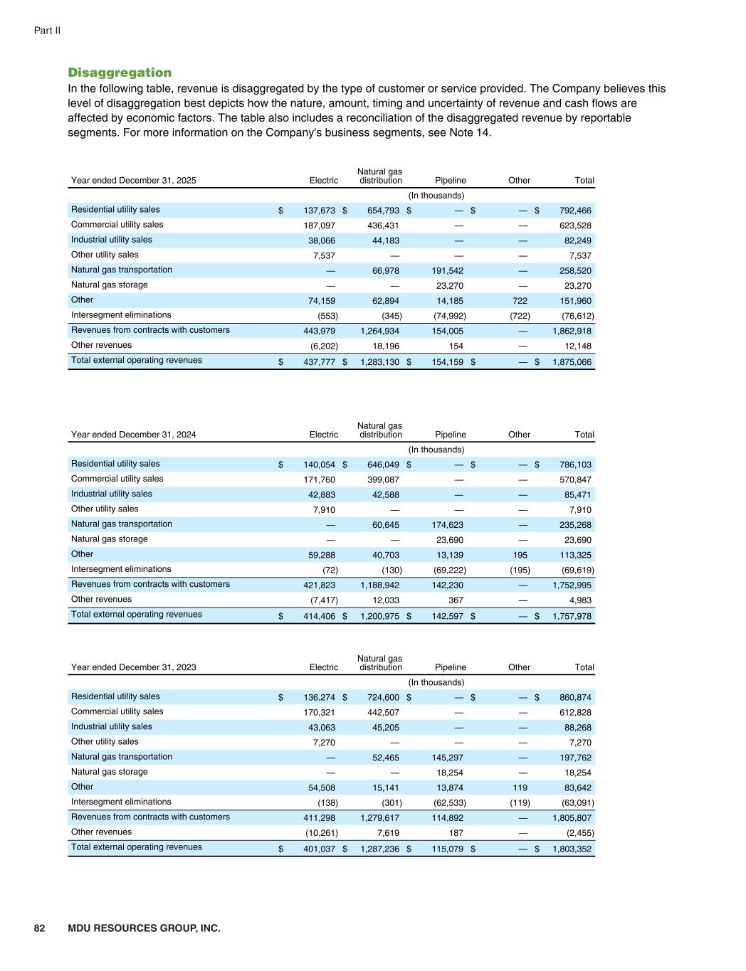 Part II MDU RESOURCES GROUP, INC.82 Disaggregation In the following table, revenue is disaggregated by the type of customer or service provided. The Company believes this level of disaggregation best depicts how the nature, amount, timing and uncertainty of revenue and cash flows are affected by economic factors. The table also includes a reconciliation of the disaggregated revenue by reportable segments. For more information on the Company's business segments, see Note 14. Year ended December 31, 2025 Electric Natural gas distribution Pipeline Other Total (In thousands) Residential utility sales $ 137,673 $ 654,793 $ — $ — $ 792,466 Commercial utility sales 187,097 436,431 — — 623,528 Industrial utility sales 38,066 44,183 — — 82,249 Other utility sales 7,537 — — — 7,537 Natural gas transportation — 66,978 191,542 — 258,520 Natural gas storage — — 23,270 — 23,270 Other 74,159 62,894 14,185 722 151,960 Intersegment eliminations (553) (345) (74,992) (722) (76,612) Revenues from contracts with customers 443,979 1,264,934 154,005 — 1,862,918 Other revenues (6,202) 18,196 154 — 12,148 Total external operating revenues $ 437,777 $ 1,283,130 $ 154,159 $ — $ 1,875,066 Year ended December 31, 2024 Electric Natural gas distribution Pipeline Other Total (In thousands) Residential utility sales $ 140,054 $ 646,049 $ — $ — $ 786,103 Commercial utility sales 171,760 399,087 — — 570,847 Industrial utility sales 42,883 42,588 — — 85,471 Other utility sales 7,910 — — — 7,910 Natural gas transportation — 60,645 174,623 — 235,268 Natural gas storage — — 23,690 — 23,690 Other 59,288 40,703 13,139 195 113,325 Intersegment eliminations (72) (130) (69,222) (195) (69,619) Revenues from contracts with customers 421,823 1,188,942 142,230 — 1,752,995 Other revenues (7,417) 12,033 367 — 4,983 Total external operating revenues $ 414,406 $ 1,200,975 $ 142,597 $ — $ 1,757,978 Year ended December 31, 2023 Electric Natural gas distribution Pipeline Other Total (In thousands) Residential utility sales $ 136,274 $ 724,600 $ — $ — $ 860,874 Commercial utility sales 170,321 442,507 — — 612,828 Industrial utility sales 43,063 45,205 — — 88,268 Other utility sales 7,270 — — — 7,270 Natural gas transportation — 52,465 145,297 — 197,762 Natural gas storage — — 18,254 — 18,254 Other 54,508 15,141 13,874 119 83,642 Intersegment eliminations (138) (301) (62,533) (119) (63,091) Revenues from contracts with customers 411,298 1,279,617 114,892 — 1,805,807 Other revenues (10,261) 7,619 187 — (2,455) Total external operating revenues $ 401,037 $ 1,287,236 $ 115,079 $ — $ 1,803,352 Index Part II 82 MDU Resources Group, Inc. Form 10-K