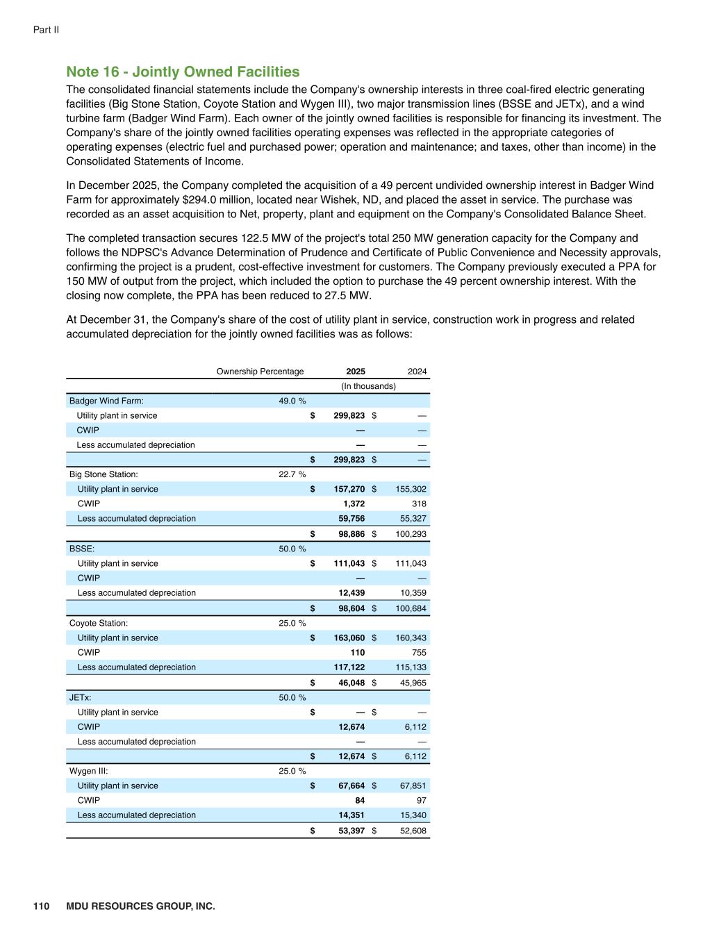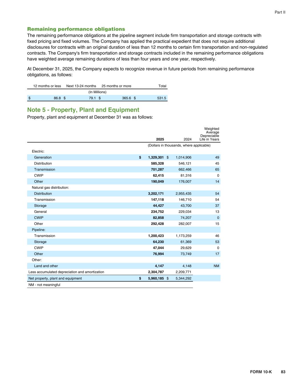 Part II 83FORM 10-K Remaining performance obligations The remaining performance obligations at the pipeline segment include firm transportation and storage contracts with fixed pricing and fixed volumes. The Company has applied the practical expedient that does not require additional disclosures for contracts with an original duration of less than 12 months to certain firm transportation and non-regulated contracts. The Company's firm transportation and storage contracts included in the remaining performance obligations have weighted average remaining durations of less than four years and one year, respectively. At December 31, 2025, the Company expects to recognize revenue in future periods from remaining performance obligations, as follows: 12 months or less Next 13-24 months 25 months or more Total (In Millions) $ 86.8 $ 79.1 $ 365.6 $ 531.5 Note 5 - Property, Plant and Equipment Property, plant and equipment at December 31 was as follows: 2025 2024 Weighted Average Depreciable Life in Years (Dollars in thousands, where applicable) Electric: Generation $ 1,329,301 $ 1,014,906 49 Distribution 585,328 546,121 45 Transmission 701,287 662,466 65 CWIP 62,415 81,316 0 Other 190,049 176,007 14 Natural gas distribution: Distribution 3,202,171 2,955,435 54 Transmission 147,118 146,710 54 Storage 44,427 43,700 37 General 234,752 229,034 13 CWIP 82,858 74,207 0 Other 292,428 282,007 15 Pipeline: Transmission 1,200,423 1,173,259 46 Storage 64,230 61,369 53 CWIP 47,044 29,629 0 Other 76,994 73,749 17 Other: Land and other 4,147 4,148 NM Less accumulated depreciation and amortization 2,304,787 2,209,771 Net property, plant and equipment $ 5,960,185 $ 5,344,292 NM - not meaningful Index Part II MDU Resources Group, Inc. Form 10-K 83