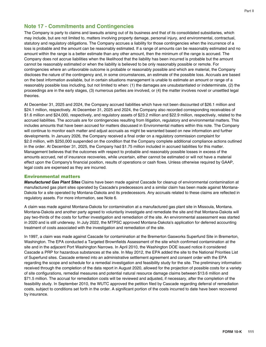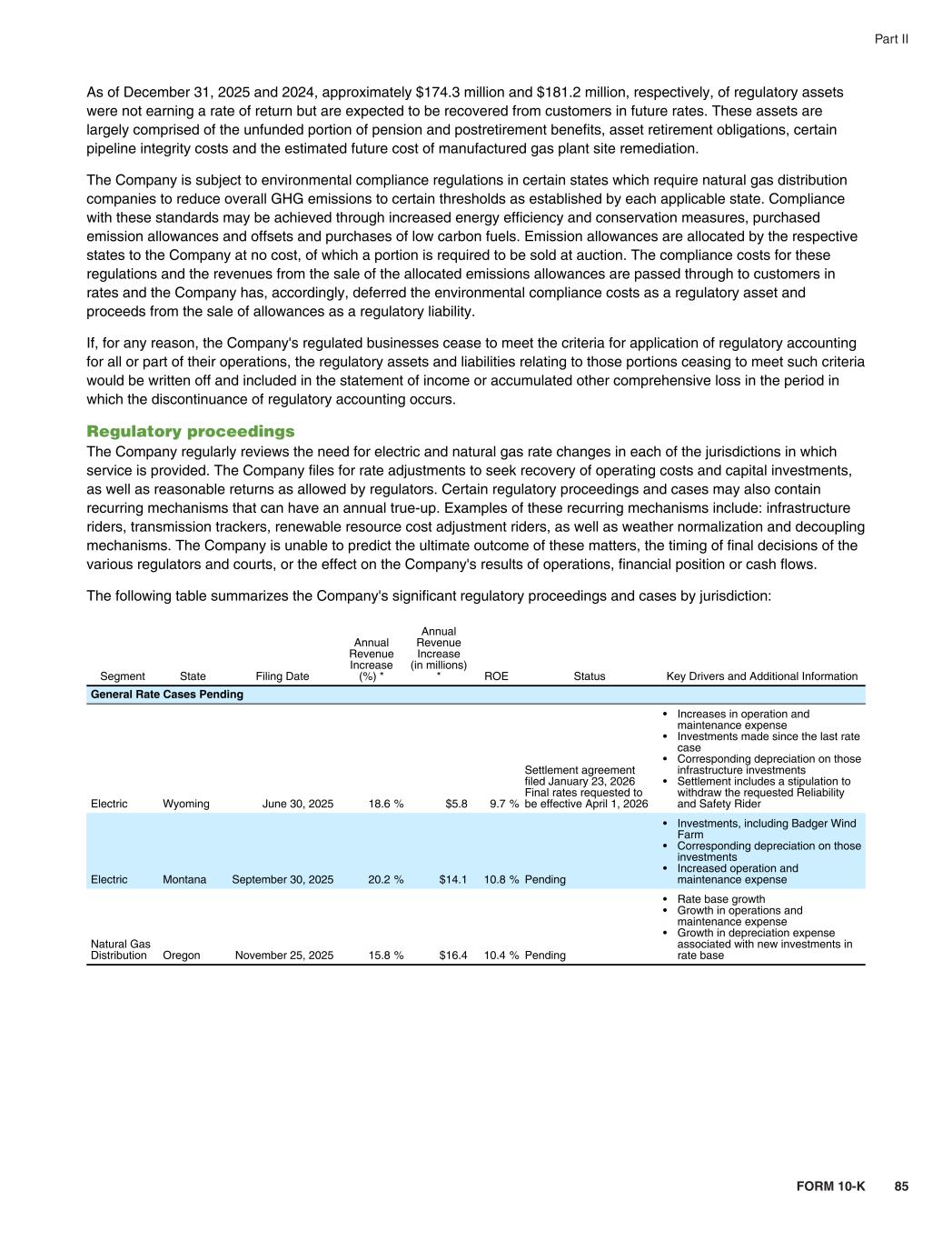 Part II 85FORM 10-K As of December 31, 2025 and 2024, approximately $174.3 million and $181.2 million, respectively, of regulatory assets were not earning a rate of return but are expected to be recovered from customers in future rates. These assets are largely comprised of the unfunded portion of pension and postretirement benefits, asset retirement obligations, certain pipeline integrity costs and the estimated future cost of manufactured gas plant site remediation. The Company is subject to environmental compliance regulations in certain states which require natural gas distribution companies to reduce overall GHG emissions to certain thresholds as established by each applicable state. Compliance with these standards may be achieved through increased energy efficiency and conservation measures, purchased emission allowances and offsets and purchases of low carbon fuels. Emission allowances are allocated by the respective states to the Company at no cost, of which a portion is required to be sold at auction. The compliance costs for these regulations and the revenues from the sale of the allocated emissions allowances are passed through to customers in rates and the Company has, accordingly, deferred the environmental compliance costs as a regulatory asset and proceeds from the sale of allowances as a regulatory liability. If, for any reason, the Company's regulated businesses cease to meet the criteria for application of regulatory accounting for all or part of their operations, the regulatory assets and liabilities relating to those portions ceasing to meet such criteria would be written off and included in the statement of income or accumulated other comprehensive loss in the period in which the discontinuance of regulatory accounting occurs. Regulatory proceedings The Company regularly reviews the need for electric and natural gas rate changes in each of the jurisdictions in which service is provided. The Company files for rate adjustments to seek recovery of operating costs and capital investments, as well as reasonable returns as allowed by regulators. Certain regulatory proceedings and cases may also contain recurring mechanisms that can have an annual true-up. Examples of these recurring mechanisms include: infrastructure riders, transmission trackers, renewable resource cost adjustment riders, as well as weather normalization and decoupling mechanisms. The Company is unable to predict the ultimate outcome of these matters, the timing of final decisions of the various regulators and courts, or the effect on the Company's results of operations, financial position or cash flows. The following table summarizes the Company's significant regulatory proceedings and cases by jurisdiction: General Rate Cases Pending Electric Wyoming June 30, 2025 18.6 % $5.8 9.7 % Settlement agreement filed January 23, 2026 Final rates requested to be effective April 1, 2026 • Increases in operation and maintenance expense • Investments made since the last rate case • Corresponding depreciation on those infrastructure investments • Settlement includes a stipulation to withdraw the requested Reliability and Safety Rider Electric Montana September 30, 2025 20.2 % $14.1 10.8 % Pending • Investments, including Badger Wind Farm • Corresponding depreciation on those investments • Increased operation and maintenance expense Natural Gas Distribution Oregon November 25, 2025 15.8 % $16.4 10.4 % Pending • Rate base growth • Growth in operations and maintenance expense • Growth in depreciation expense associated with new investments in rate base Segment State Filing Date Annual Revenue Increase (%) * Annual Revenue Increase (in millions) * ROE Status Key Drivers and Additional Information Index Part II MDU Resources Group, Inc. Form 10-K 85
