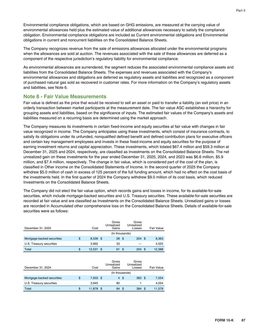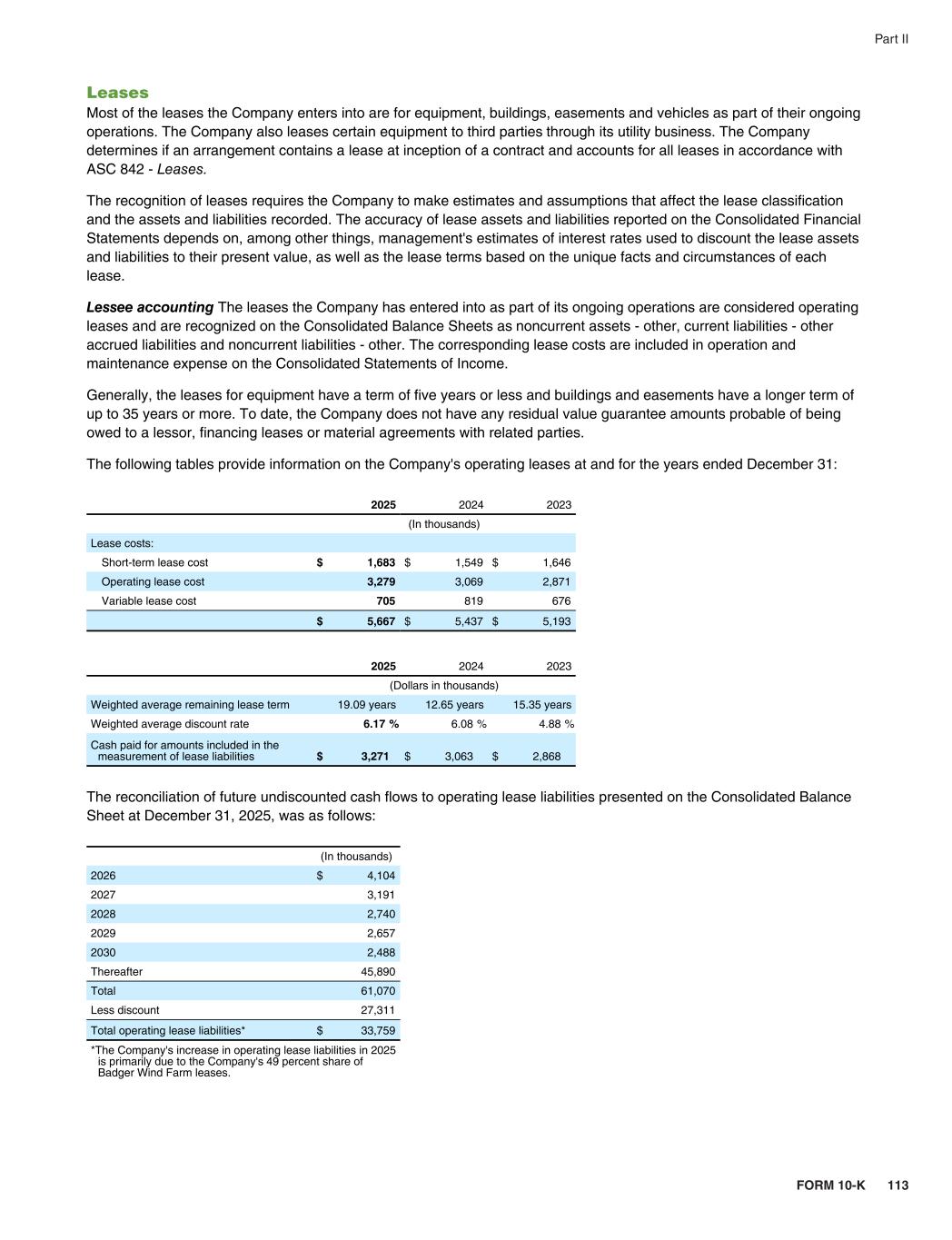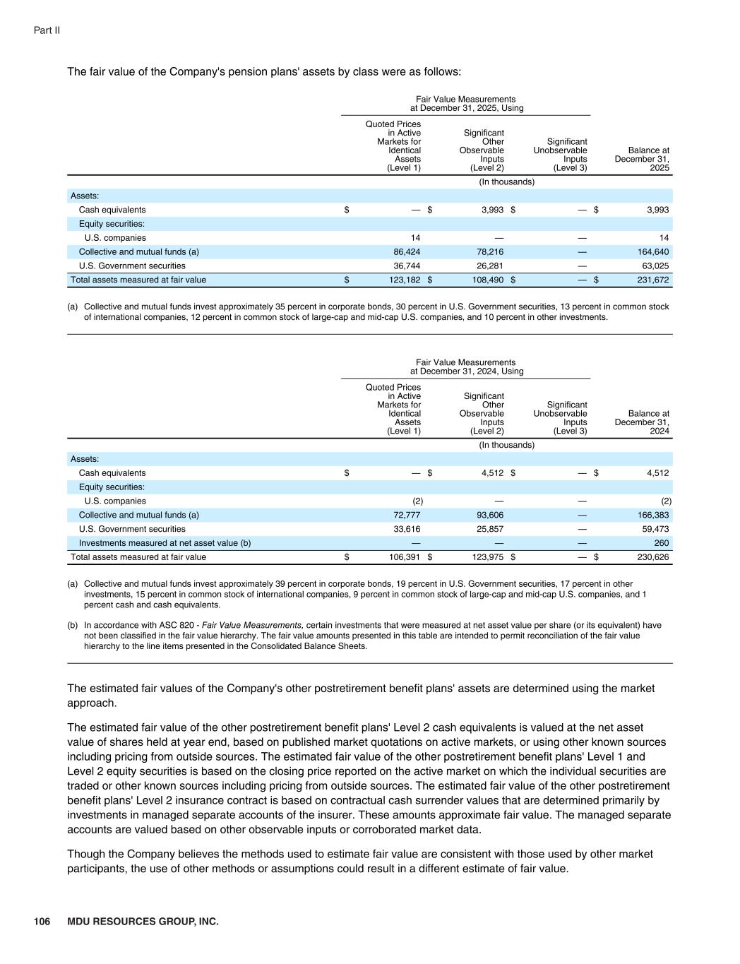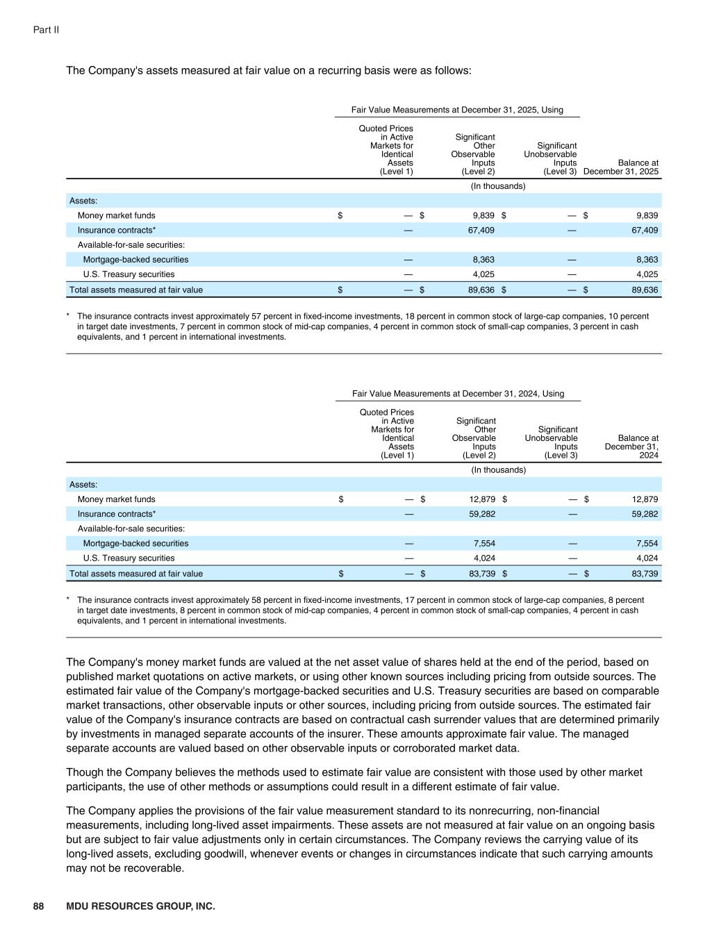Part II MDU RESOURCES GROUP, INC.78 Goodwill impairment, if any, is measured by comparing the fair value of each reporting unit to its carrying value. If the fair value of a reporting unit exceeds its carrying value, the goodwill of the reporting unit is not impaired. If the carrying value of a reporting unit exceeds its fair value, the Company must record an impairment loss for the amount that the carrying value of the reporting unit, including goodwill, exceeds the fair value of the reporting unit. For the years ended December 31, 2025, 2024 and 2023, the carrying amount of goodwill at the natural gas distribution segment, was $345.7 million. There have been no impairment losses recorded. Investments The Company's investments include the cash surrender value of life insurance policies, insurance contracts, mortgage- backed securities and U.S. Treasury securities. The Company measures its investment in the insurance contracts at fair value with any unrealized gains and losses recorded on the Consolidated Statements of Income. The Company has not elected the fair value option for its mortgage-backed securities and U.S. Treasury securities and, as a result, the unrealized gains and losses on these investments are recorded in accumulated other comprehensive loss. For more information, see Notes 8 and 15. Variable interest entities The Company evaluates its arrangements and contracts with other entities to determine if they are VIEs and if so, if the Company is the primary beneficiary. GAAP provides a framework for identifying VIEs and determining when a company should include the assets, liabilities, noncontrolling interest and results of activities of a VIE in its consolidated financial statements. A VIE should be consolidated if a party with an ownership, contractual or other financial interest in the VIE (a variable interest holder) has the power to direct the VIE's most significant activities and the obligation to absorb losses or right to receive benefits of the VIE that could be significant to the VIE. A variable interest holder that consolidates the VIE is called the primary beneficiary. Upon consolidation, the primary beneficiary generally must initially record all of the VIE's assets, liabilities and noncontrolling interests at fair value and subsequently account for the VIE as if it were consolidated. The Company's evaluation of whether it qualifies as the primary beneficiary of a VIE involves significant judgments, estimates and assumptions and includes a qualitative analysis of the activities that most significantly impact the VIE's economic performance and whether the Company has the power to direct those activities, the design of the entity, the rights of the parties and the purpose of the arrangement. Derivative instruments The Company enters into commodity price derivative contracts in order to minimize the price volatility associated with customer natural gas costs at its natural gas distribution segment. These derivatives are not designated as hedging instruments and are recorded in the Consolidated Balance Sheets at fair value. Changes in the fair value of these derivatives along with any contract settlements are recorded each period in regulatory assets or liabilities in accordance with regulatory accounting. The Company does not enter into any derivatives for trading or other speculative purposes. The Company did not have any material commodity price derivative contracts at December 31, 2025 or 2024. Leases Lease liabilities and their corresponding right-of-use assets are recorded based on the present value of lease payments over the expected lease term. The Company recognizes leases with an original lease term of 12 months or less in income on a straight-line basis over the term of the lease and does not recognize a corresponding right-of-use asset or lease liability. The Company determines the lease term based on the non-cancelable and cancelable periods in each contract. The non-cancelable period consists of the term of the contract that is legally enforceable and cannot be canceled by either party without incurring a significant penalty. The cancelable period is determined by various factors that are based on who has the right to cancel a contract. If only the lessor has the right to cancel the contract, the Company will assume the contract will continue. If the lessee is the only party that has the right to cancel the contract, the Company looks to asset, entity and market-based factors. If both the lessor and the lessee have the right to cancel the contract, the Company assumes the contract will not continue. The discount rate used to calculate the present value of the lease liabilities is based upon the implied rate within each contract. If the rate is unknown or cannot be determined, the Company uses an incremental borrowing rate, which is determined by the length of the contract, asset class and the Company's borrowing rates, as of the commencement date of the contract. Index Part II 78 MDU Resources Group, Inc. Form 10-K