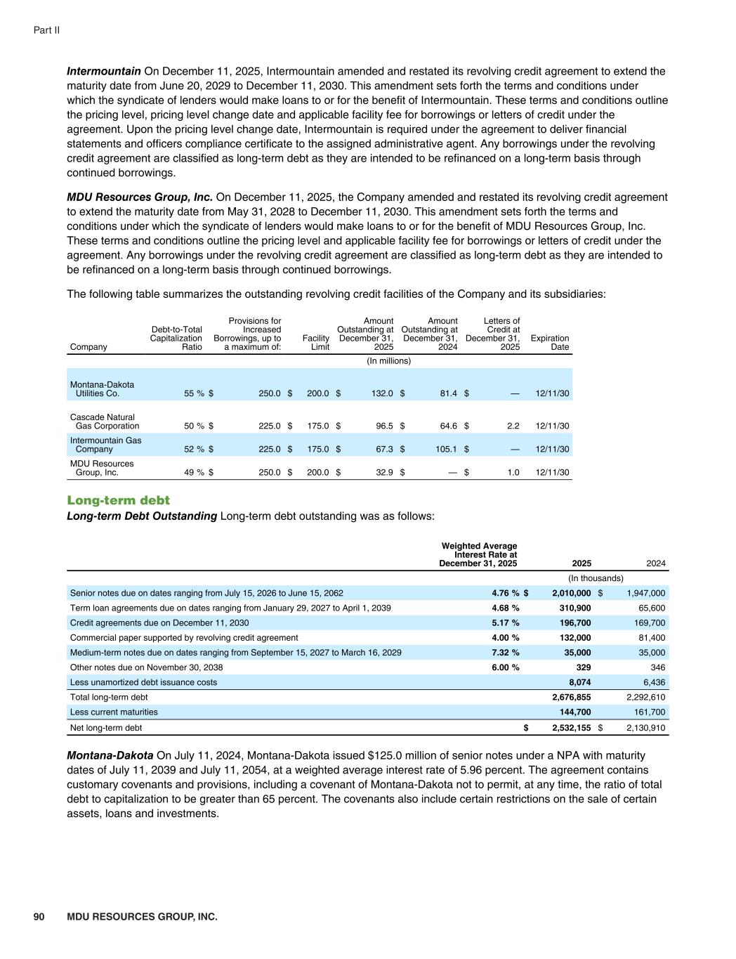 Part II 57FORM 10-K Capital resources The Company requires significant cash to support and grow its businesses. The primary sources of cash other than cash generated from operating activities are cash from revolving credit facilities, the issuance of long-term debt and the sale of equity securities. Debt resources Certain debt instruments of the Company and its subsidiaries contain restrictive and financial covenants and cross-default provisions. In order to borrow under the respective debt agreements, the Company and its subsidiaries must be in compliance with the applicable covenants and certain other conditions. Intermountain was not in compliance with its minimum interest coverage ratio for the period ended September 30, 2025, which constituted an event of default under the terms of the Intermountain NPAs. In addition, the event of default under the terms of the Intermountain NPAs constituted a cross-default under the terms of certain NPAs of MDU Energy Capital and revolving credit agreements held by the Company and Intermountain. Subsequent to September 30, 2025, Intermountain and MDU Energy Capital obtained waivers for this non-compliance from the holders of a majority of their respective outstanding notes, and Intermountain and the Company obtained waivers from the lenders of the revolving credit agreements, which collectively cured the impact of any events of default. The Company and its subsidiaries were in compliance with applicable covenants at December 31, 2025. In the event the Company or its subsidiaries do not comply with the applicable covenants and other conditions, alternative sources of funding may need to be pursued. As of December 31, 2025, the Company had investment grade credit ratings at all entities issuing debt which carried public ratings. For more information on the covenants, certain other conditions and cross-default provisions, outstanding revolving credit facilities, and new long-term debt issuances, see Item 8 - Note 9. Equity offerings In August 2025, the Company entered into an EDA pursuant to which it may issue, offer, and sell, from time to time, up to an aggregate gross sales price of $400.0 million of shares of its common stock through an ATM offering program, which includes the ability to enter into FSAs. Since the establishment of the ATM offering program, the Company did not issue common stock pursuant to the EDA nor enter into any FSAs related to the EDA. On December 5, 2025, the Company completed a follow-on public offering of 10,152,284 of shares of the Company's common stock at a public offering price of $19.70 per share. In addition, on December 23, 2025, the underwriters exercised their option to purchase 1,522,842 additional shares of the Company's common stock. Pursuant to the FSAs entered into in connection with the offering, the Company has discretion to settle the FSAs on one or more settlement dates prior to December 6, 2027, subject to certain price adjustments as set forth in the FSAs as well as adjustments for transaction and other associated fees. The FSAs will be physically settled with shares of common stock issued by the Company, unless the Company elects to settle the FSAs in net cash or net shares, subject to certain conditions. If the Company elects to physically settle the FSAs, the Company will physically issue shares of common stock to the banking counterparties at the then-applicable forward sale price and receive proceeds at that time. Actual cash proceeds, if any, for settlement of FSAs will depend on the method and timing the Company elects for settlement. Prior to settlement, the potentially issuable shares pursuant to the FSAs will be reflected in the Company's diluted earnings per share calculation using the treasury stock method. For more detailed information about the Company's equity transactions, see Item 8 - Note 11. Dividend restrictions For information on the Company's dividends and dividend restrictions, see Item 8 - Note 11. Index Part II MDU Resources Group, Inc. Form 10-K 57