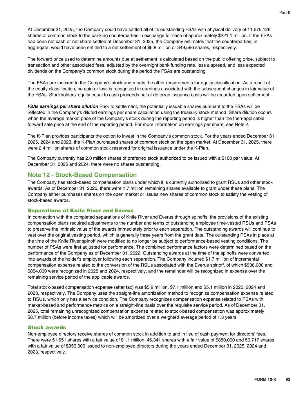 Part II 79FORM 10-K Asset retirement obligations The Company records the fair value of a liability for an asset retirement obligation in the period in which it is incurred. When the liability is initially recorded, the Company capitalizes a cost by increasing the carrying amount of the related long-lived asset. Over time, the liability is accreted to its present value each period and the capitalized cost is depreciated over the useful life of the related asset. Upon settlement of the liability, the Company either settles the obligation for the recorded amount or incurs a regulatory asset or liability. Stock-based compensation The Company determines compensation expense for stock-based awards based on the estimated fair values at the grant date and recognizes the related compensation expense over the vesting period. The Company uses the straight-line amortization method to recognize compensation expense related to RSUs, which only has a service condition. This method recognizes stock compensation expense on a straight-line basis over the requisite service period for the entire award. The Company recognized compensation expense related to PSAs that vest based on performance metrics and service conditions on a straight-line basis over the service period. Inception-to-date expense was adjusted based upon the determination of the potential achievement of the performance target at each reporting date. The Company recognizes compensation expense related to PSAs with market-based performance metrics on a straight-line basis over the requisite service period. Outstanding PSAs were converted to RSUs in connection with the completed separation of Knife River through the spinoff. The Company records the compensation expense for RSUs and PSAs using an estimated forfeiture rate. The estimated forfeiture rate is calculated based on an average of actual historical forfeitures. The Company also performs an analysis of any known factors at the time of the calculation to identify any necessary adjustments to the average historical forfeiture rate. At the time actual forfeitures become more than estimated forfeitures, the Company records compensation expense using actual forfeitures. Earnings per share Basic earnings per share is computed by dividing net income by the weighted average number of shares of common stock outstanding during the year. Diluted earnings per share is computed by dividing net income by the total of the weighted average number of shares of common stock outstanding during the year, plus the effect of nonvested PSAs and RSUs, as well as potentially issuable shares pursuant to FSAs using the treasury stock method. Common stock outstanding includes issued shares less shares held in treasury. As a result of the 2023 Knife River separation, the Company retained legal ownership of 538,921 shares of the Company's common stock that were historically owned by a subsidiary of Knife River and recorded in Treasury stock at cost. Following the separation, the 538,921 treasury shares were retired. The 538,921 shares of treasury stock did not have an impact on weighted-average shares outstanding, as they were not outstanding prior to being retired. Net income was the same for both the basic and diluted earnings per share calculations. A reconciliation of the weighted average common shares outstanding used in the basic and diluted earnings per share calculations follows: 2025 2024 2023 (In thousands, except per share amounts) Weighted average common shares outstanding - basic 204,291 203,867 203,640 Effect of dilutive PSAs, RSUs, and FSAs 1,009 786 298 Weighted average common shares outstanding - diluted 205,300 204,653 203,938 Earnings per share - basic: Income from continuing operations $ .94 $ .89 $ 1.62 Discontinued operations, net of tax (.01) .49 .42 Earnings per share - basic $ 0.93 $ 1.38 $ 2.04 Earnings per share - diluted: Income from continuing operations $ .93 $ .88 $ 1.62 Discontinued operations, net of tax — .49 .41 Earnings per share - diluted $ 0.93 $ 1.37 $ 2.03 Shares excluded from the calculation of diluted earnings per share — — — Dividends declared per common share $ .5400 $ .5100 $ .6950 Index Part II MDU Resources Group, Inc. Form 10-K 79