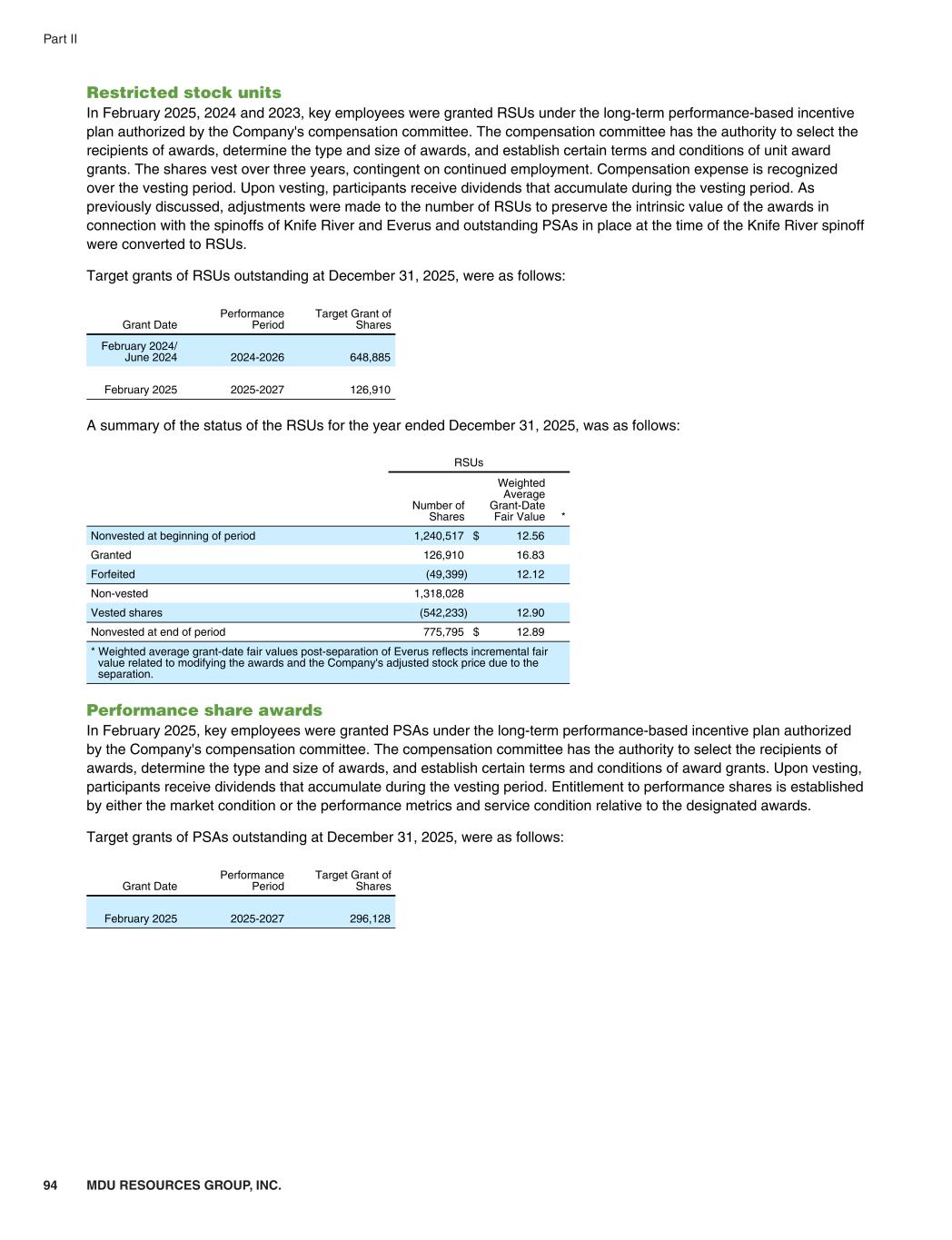 Grants of Plan-Based Awards in 2025 The following table presents the awards made to the NEOs in 2025: (a) (b) (c) (d) (e) (f) (g) (h) (I) (j) Estimated Future Payouts Under Non-Equity Incentive Plan Awards Estimated Future Payouts Under Equity Incentive Plan Awards All Other Stock Awards: Number of Shares of Stock or Units (#) Grant Date Fair Value of Stock Awards ($)Name Award Type Grant Date Threshold ($) Target ($) Maximum ($) Threshold (#) Target (#) Maximum (#) Kivisto EICP 2/12/2025 (1) 462,500 925,000 1,850,000 — — — — — PSA 2/12/2025 (2) — — — 26,815 53,631 107,262 — 924,062 PSA 2/12/2025 (3) — — — 26,815 53,630 107,260 — 902,593 RSU 2/12/2025 (4) — — — — — — 45,969 773,658 Vollmer EICP 2/12/2025 (1) 229,125 458,250 916,500 — — — — — PSA 2/12/2025 (2) — — — 9,742 19,484 38,968 — 335,709 PSA 2/12/2025 (3) — — — 9,742 19,484 38,968 — 327,916 RSU 2/12/2025 (4) — — — — — — 16,700 281,061 Senger EICP 2/12/2025 (1) 151,200 302,400 604,800 — — — — — PSA 2/12/2025 (2) — — — 4,383 8,766 17,532 — 151,038 PSA 2/12/2025 (3) — — — 4,383 8,766 17,532 — 147,532 RSU 2/12/2025 (4) — — — — — — 7,514 126,461 Foti EICP 2/12/2025 (1) 151,125 302,250 604,500 — — — — — PSA 2/12/2025 (2) — — — 4,943 9,886 19,772 — 170,336 PSA 2/12/2025 (3) — — — 4,942 9,885 19,770 — 166,365 RSU 2/12/2025 (4) — — — — — — 8,473 142,600 Johnson EICP 2/12/2025 (1) 130,950 261,900 523,800 — — — — — PSA 2/12/2025 (2) — — — 3,374 6,749 13,498 — 116,285 PSA 2/12/2025 (3) — — — 3,374 6,748 13,496 — 113,569 RSU 2/12/2025 (4) — — — — — — 5,785 97,362 (1) The awards at threshold, target, and maximum are reflected in columns (c), (d), and (e), respectively. The actual amount paid with respect to 2025 performance is reflected in column (e) of the SCT beginning on page 63. As described in the CD&A beginning on page 46, payment of EICP awards is dependent upon the achievement of performance measures and actual payout may range from 0% to 200% of the target. (2) The awards at threshold, target, and maximum are reflected in columns (f), (g), and (h), respectively. The value of the PSA award based on the grant date fair value is reflected in column (j). As described in CD&A beginning on page 46, vesting of PSAs is dependent upon achievement of the Company’s rTSR performance measure at the end of the three-year performance period ending December 31, 2027. Actual vesting may range from 0% to 200% of target. (3) The awards at threshold, target, and maximum are reflected in columns (f), (g), and (h), respectively. The value of the PSA award based on the grant date fair value is reflected in column (j). As described in CD&A beginning on page 46, vesting of PSAs is dependent upon achievement of the Company’s cumulative adjusted EPS performance measure at the end of the three-year performance period ending December 31, 2027. Actual vesting may range from 0% to 200% of target. (4) The number of shares and grant date fair values of RSUs are reflected in columns (i) and (j), respectively. As described in CD&A beginning on page 46, vesting of RSUs is dependent upon the executive’s continued employment with the Company through December 31, 2027. Executive Compensation 65 MDU RESOURCES GROUP, INC.