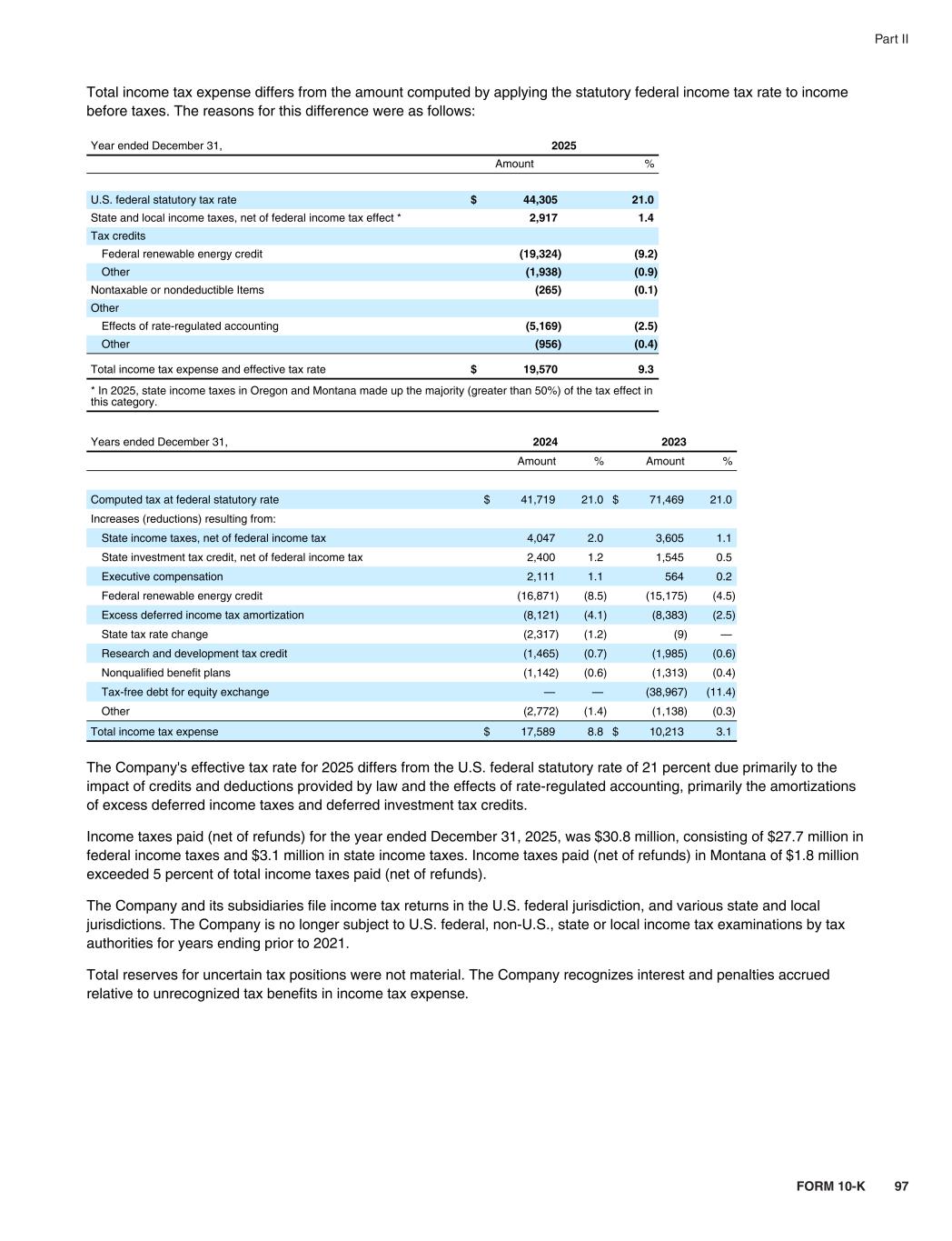 Part II MDU RESOURCES GROUP, INC.44 2025 compared to 2024 Electric earnings decreased $9.9 million as a result of: • Revenue increased $23.8 million. ◦ Largely attributable to: ▪ Higher fuel and purchased power costs of $17.8 million recovered in customer rates and offset in expense, as described below. ▪ Higher net transmission revenue of $3.5 million, including data center revenue. ▪ Higher retail sales volumes of $1.2 million, driven primarily by higher residential volumes, largely due to colder weather in the first quarter of the year, and higher commercial volumes from the data center as further discussed in the Outlook section. ◦ Partially offset by lower renewable tracker revenues, partially associated with higher production tax credits offset in income tax benefit, as described below. • Electric fuel and purchased power increased $17.8 million, largely the result of higher retail sales volumes and higher commodity prices. • Operation and maintenance increased $16.3 million. ◦ Largely the result of: ▪ Higher payroll-related costs of $5.7 million. ▪ Higher contract services related to Coyote generating station planned outage-related costs of $3.5 million. ▪ Increased software expense of $3.2 million. ▪ Higher insurance expense. ◦ Also reflected are higher costs associated with services provided to Everus as part of the transition services agreement, offset in other income, as described below. The transition services are expected to be complete as of March 2026. • Depreciation and amortization increased $3.1 million, largely due to increased property, plant and equipment balances, as a result of transmission projects placed in service to improve reliability and update aging infrastructure. • Taxes, other than income increased $1.2 million, largely as a result of higher property tax, primarily in Montana. • Other income decreased $800,000, primarily due to lower interest income related to a data center project and lower regulatory deferral balances, partially offset by higher transition services agreement income, as described above. • Interest expense increased $1.7 million, largely the result of lower AFUDC due to lower interest rates and average CWIP balances. • Income tax benefit increased $7.2 million, largely due to lower income before income taxes, and higher production tax credits of $2.5 million driven by higher wind production and wind farm repowers. Index Part II 44 MDU Resources Group, Inc. Form 10-K