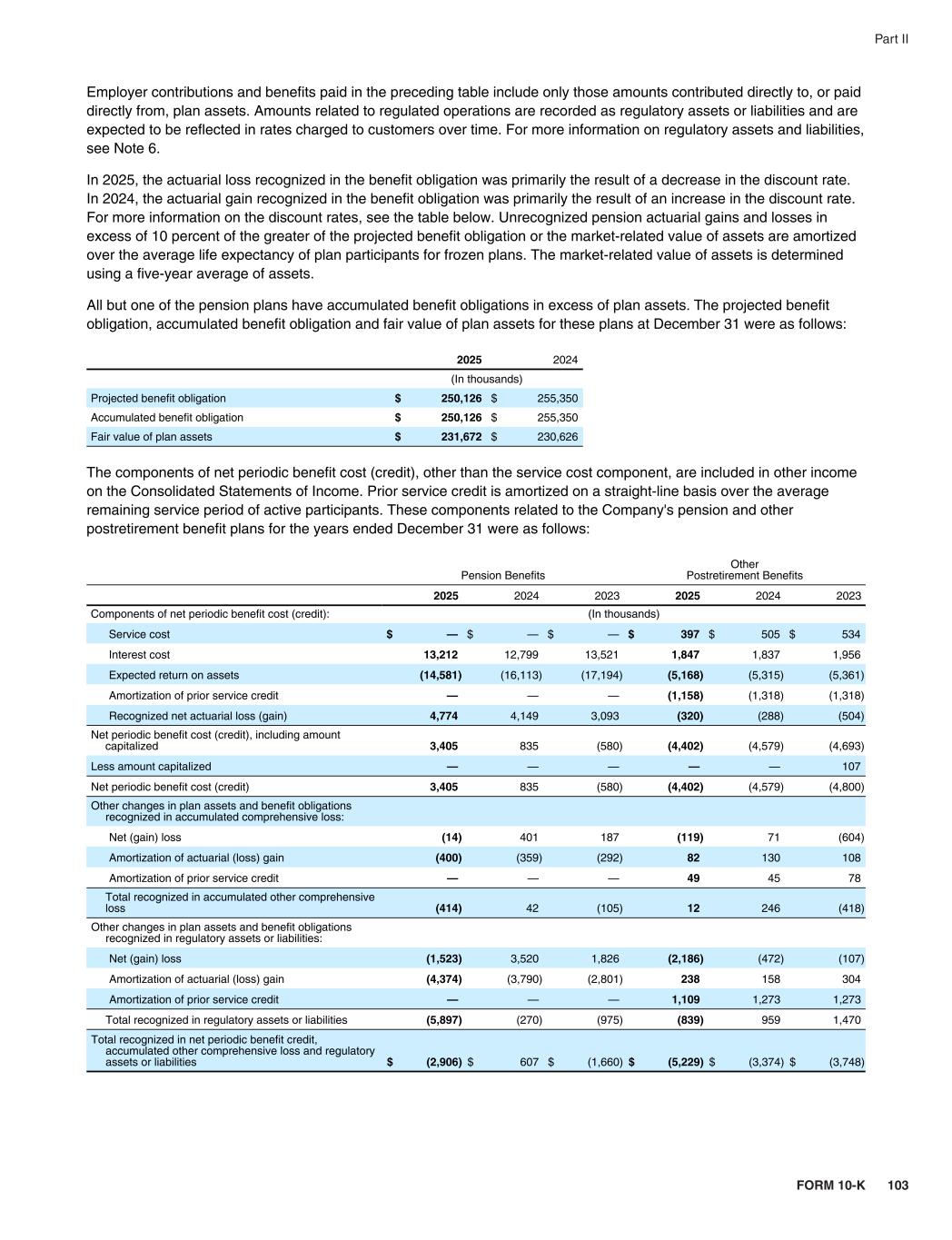 (5) The amounts in column (f) represent the actuarial change in value of the Pension Plan and SISP and above-market earnings on deferred EICP balances for the designated years for each of Ms. Kivisto and Messrs. Vollmer, Senger, and Johnson. Mr. Foti does not participate in the Pension Plans or SISP. Where the change in accumulated benefits is negative, executive compensation rules require disclosure of the negative amount by footnote, but the negative amount is not be reflected in column (f). Name Change in Pension Plans ($) Change in SISP ($) Above-Market Earnings ($) Total Accumulated Change ($) Kivisto 18,832 48,097 936 67,865 Vollmer 1,938 — — 1,938 Senger (1,146) 51,967 — 50,821 Johnson (1,715) — — (1,715) See Pension Benefits in 2025 on page 67 for more information on the Pension Plans and SISP. (6) The amounts in column (g) represent other compensation attributable to the NEOs for 2025. Name 401(k) Plan Match ($)(a) DCP Company Contribution ($)(b) Life Insurance Premiums ($) Matching Charitable Contributions ($) Relocation ($)(c) Total ($) Kivisto 45,500 — 774 3,600 — 49,874 Vollmer 38,500 91,650 774 4,350 — 135,274 Senger 54,250 4,025 774 600 — 59,649 Foti 31,500 46,500 720 1,200 13,312 93,232 Johnson 54,250 47,675 676 2,400 — 105,001 (a) Represents Company contributions to the 401(k) Plan, which include matching contributions and retirement contributions. Matching contributions are 4% of eligible plan compensation, and retirement contributions are tiered based on the employee’s age as of December 31, 2009 when the pension plans were frozen for non-bargaining employees hired prior to 2006 who were participants in the Pension Plans and 5% for employees hired on or after 2006. Retirement contributions for the NEOs were as follows: Ms. Kivisto (9%), and Messrs. Vollmer (7%), Senger (11.5%), Foti (5%), and Johnson (11.5%). (b) Represents Company contributions to the DCP for Messrs. Vollmer (15%), Foti (10%), and Johnson (10%), as well as partial Company contributions in lieu of the 401(k) Plan contribution for Messrs. Senger and Johnson (each $4,025) that exceeded the IRS limit during 2024. (c) Mr. Foti’s offer letter included certain relocation benefits, which were paid in 2024 but extended into 2025. The amounts reflected in the table above represent temporary housing payments for January through April 2025. (7) The amounts in column (c) represent the following percentages of the NEOs’ 2025 total compensation: Ms. Kivisto (19%), Mr. Vollmer (27%), Mr. Senger (36%), Mr. Foti (33%), and Mr. Johnson (36%). (8) Mr. Foti was appointed Chief Legal Officer and Corporate Secretary, effective October 7, 2024, and is a NEO for the first time in 2025. Executive Compensation PROXY STATEMENT 64
