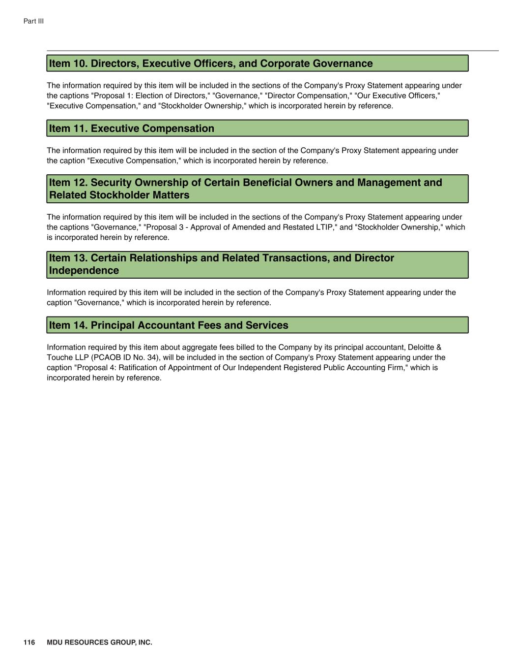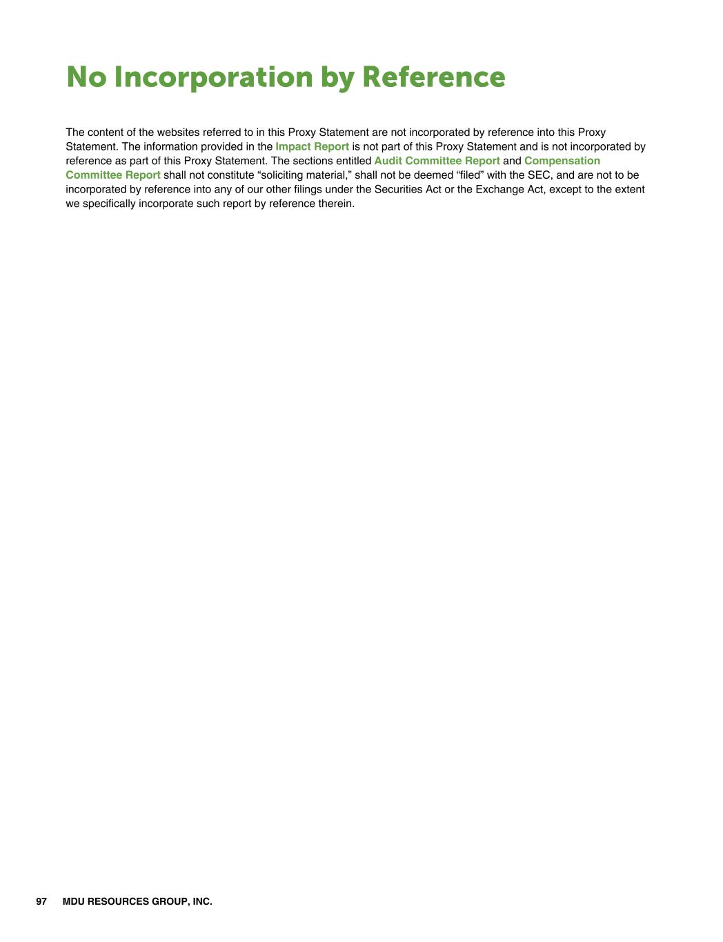 No Incorporation by Reference The content of the websites referred to in this Proxy Statement are not incorporated by reference into this Proxy Statement. The information provided in the Impact Report is not part of this Proxy Statement and is not incorporated by reference as part of this Proxy Statement. The sections entitled Audit Committee Report and Compensation Committee Report shall not constitute “soliciting material,” shall not be deemed “filed” with the SEC, and are not to be incorporated by reference into any of our other filings under the Securities Act or the Exchange Act, except to the extent we specifically incorporate such report by reference therein. 97 MDU RESOURCES GROUP, INC.
