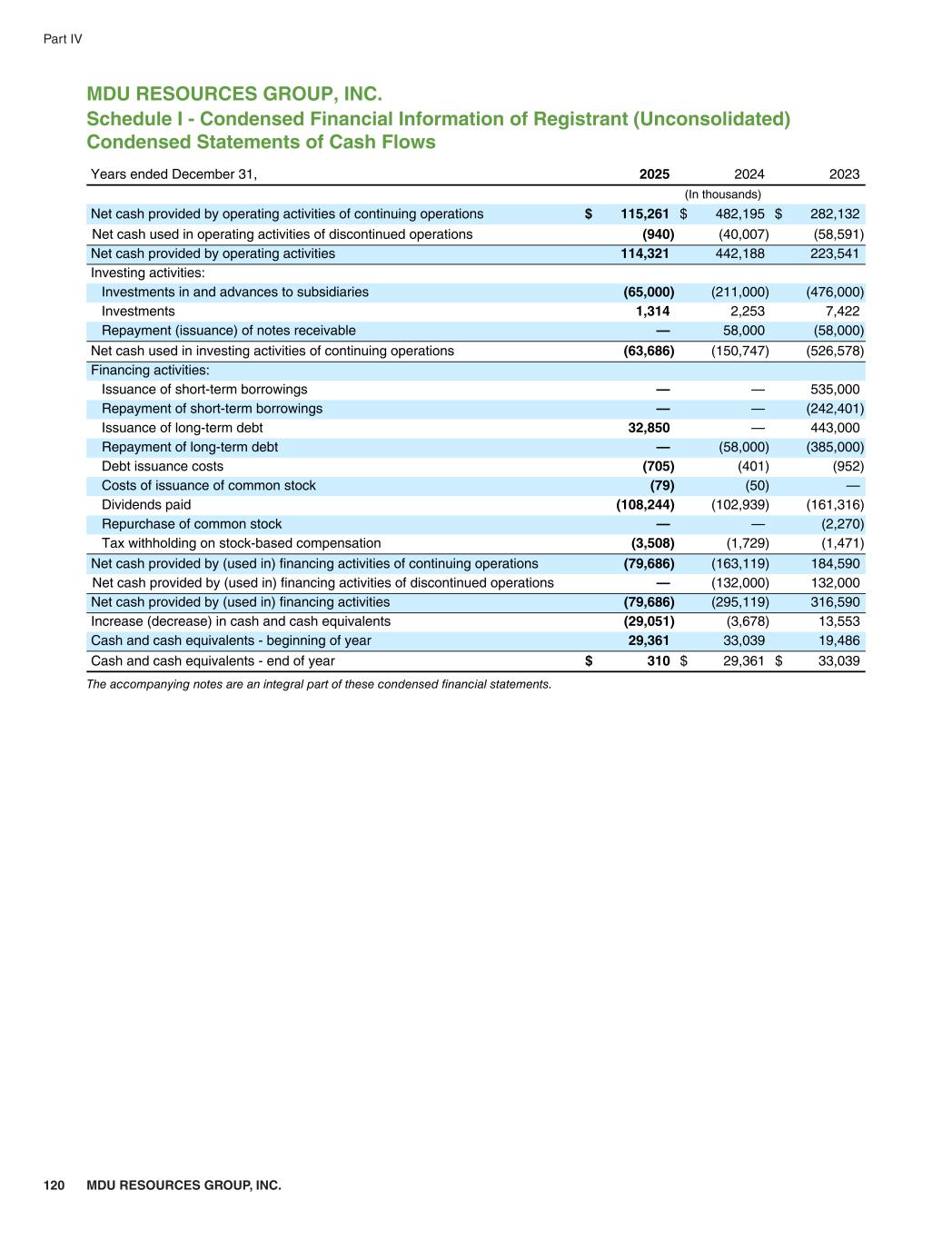 Part II 71FORM 10-K Consolidated Statements of Cash Flows Years ended December 31, 2025 2024 2023 (In thousands) Operating activities: Net income $ 190,395 $ 281,108 $ 414,707 Less: (loss) income from discontinued operations, net of tax (1,012) 100,035 84,590 Income from continuing operations 191,407 181,073 330,117 Adjustments to reconcile net income to net cash provided by operating activities: Depreciation and amortization 206,708 200,078 190,450 Deferred income taxes (8,923) (16,078) (1,309) Provision for credit losses 6,920 6,558 7,422 Amortization of debt issuance costs 1,259 1,828 1,013 Employee stock-based compensation costs 6,556 8,423 5,505 Pension and postretirement benefit plan net periodic benefit credit (1,069) (3,837) (5,380) Unrealized (gains) on investments (6,575) (5,942) (7,431) Losses (gains) on sales of assets 25 (857) (347) Gain on tax-free exchange of the retained shares in Knife River — — (186,556) Changes in current assets and liabilities, net of acquisitions: Receivables 8,353 (30,310) 79,111 Inventories 4,342 246 (21,729) Other current assets 54,459 80,977 (48,492) Accounts payable (9,618) (443) (87,209) Other current liabilities 24,446 (5,252) 73,365 Pension and postretirement benefit plan contributions (3,079) (3,000) (7,643) Other noncurrent changes (1,121) (1,651) (15,554) Net cash provided by continuing operations 474,090 411,813 305,333 Net cash (used in) provided by discontinued operations (725) 90,505 27,294 Net cash provided by operating activities 473,365 502,318 332,627 Investing activities: Capital expenditures (770,394) (522,824) (484,136) Net proceeds from sale or disposition of property — 691 260 Cost of removal, net of salvage value (11,283) (5,539) 1,170 Investments (4,182) (5,155) (2,423) Proceeds from investment excess cash and cost basis withdrawal 5,000 9,000 20,000 Net cash used in continuing operations (780,859) (523,827) (465,129) Net cash used in discontinued operations — (28,858) (75,662) Net cash used in investing activities (780,859) (552,685) (540,791) Financing activities: Issuance of short-term borrowings — — 810,000 Repayment of short-term borrowings — (95,000) (433,901) Issuance of long-term debt 565,350 308,600 594,700 Repayment of long-term debt (179,466) (182,135) (568,883) Debt issuance costs (4,283) (2,456) (2,521) Costs of issuance of common stock (79) (50) — Dividends paid (108,244) (102,939) (161,316) Repurchase of common stock — — (4,811) Tax withholding on stock-based compensation (4,476) (2,623) (3,040) Net cash provided by (used in) continuing operations 268,802 (76,603) 230,228 Net cash provided by (used in) discontinued operations — 116,899 (25,606) Net cash provided by financing activities 268,802 40,296 204,622 Decrease in cash, cash equivalents and restricted cash (38,692) (10,071) (3,542) Cash, cash equivalents and restricted cash - beginning of year 66,904 76,975 80,517 Cash, cash equivalents and restricted cash - end of year * $ 28,212 $ 66,904 $ 76,975 Index Part II MDU Resources Group, Inc. Form 10-K 71