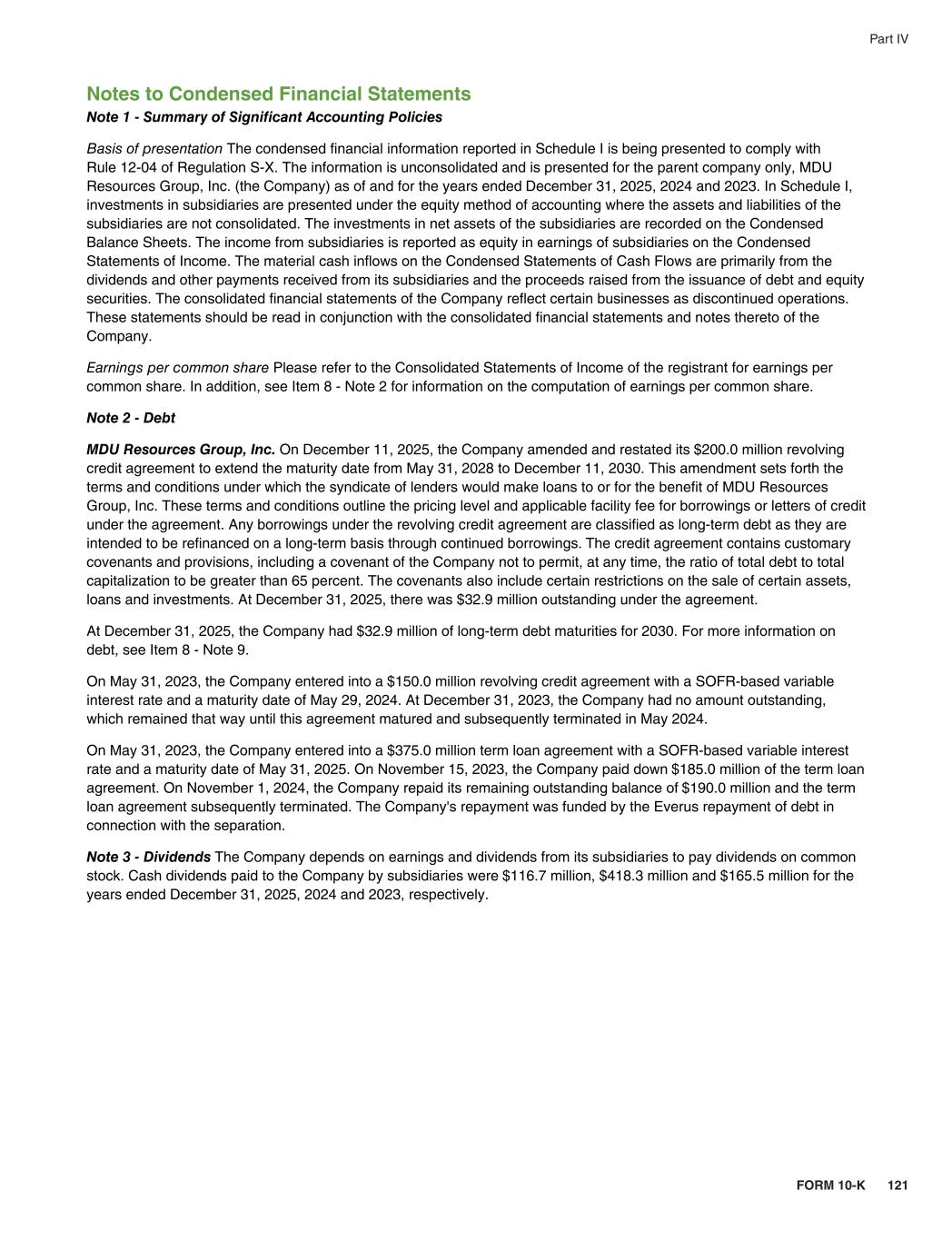 Part II 73FORM 10-K Notes to Consolidated Financial Statements Note 1 - Basis of Presentation The consolidated financial statements of the Company include the accounts of the following businesses: electric, natural gas distribution, pipeline and other. For further descriptions of the Company's businesses, see Note 14. On May 31, 2023, the Company completed the separation of Knife River, formerly the construction materials and contracting segment, resulting in Knife River becoming an independent, publicly-traded company. The Company's board of directors approved the distribution of approximately 90 percent of the issued and outstanding shares of Knife River to the Company's stockholders. Stockholders of the Company received one share of Knife River common stock for every four shares of the Company's common stock held on May 22, 2023, the record date for the distribution. The Company retained approximately 10 percent or 5.7 million shares of Knife River common stock immediately following the separation, which were disposed of in a tax-free exchange in November 2023. The separation of Knife River was a tax-free spinoff transaction to the Company's stockholders for U.S. federal income tax purposes, except for cash received in lieu of fractional shares. On October 31, 2024, the Company completed the separation of Everus, its construction services business, resulting in Everus becoming an independent, publicly-traded company. The Company's board of directors approved the distribution of all the outstanding shares of Everus common stock to the Company's stockholders. Stockholders of the Company received one share of Everus common stock for every four shares of the Company's common stock held as of the close of business on October 21, 2024, the record date for the distribution. The separation of Everus was a tax-free spinoff transaction to the Company's stockholders for U.S. federal income tax purposes, except for cash received in lieu of fractional shares. The Company's consolidated financial statements and accompanying notes for the current and prior periods have been restated to present the results of operations and the assets and liabilities of Knife River and Everus as discontinued operations, other than certain corporate overhead costs of the Company historically allocated to Knife River and Everus, which are reflected in Other. Also included in discontinued operations in the Consolidated Statements of Income are the supporting activities of Fidelity and certain interest expense related to financing activity associated with the Knife River and Everus separations. The assets and liabilities of the Company's discontinued operations are included in current assets of discontinued operations, noncurrent assets of discontinued operations, current liabilities of discontinued operations and noncurrent liabilities of discontinued operations on the Consolidated Balance Sheets. Unless otherwise indicated, the amounts presented in the accompanying notes to the consolidated financial statements relate to the Company's continuing operations. For more information on discontinued operations, see Note 3. Management has also evaluated the impact of events occurring after December 31, 2025, up to the date of issuance of these consolidated financial statements on February 20, 2026, that would require recognition or disclosure in the financial statements. Principles of consolidation The consolidated financial statements were prepared in accordance with GAAP and include the accounts of the Company and its wholly-owned subsidiaries. All intercompany balances and transactions have been eliminated in consolidation, except for certain transactions related to regulated operations in accordance with GAAP. For more information on intercompany revenues, see Note 14. The statements also include the Company's ownership interests in the assets, liabilities and expenses of jointly owned electric transmission and generating facilities. See Note 16 for additional information. Index Part II MDU Resources Group, Inc. Form 10-K 73