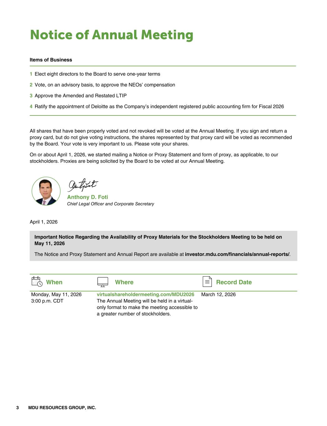 Q: How do I attend the Annual Meeting? A: We are pleased to welcome stockholders to the Annual Meeting. The Annual Meeting will be held in a virtual-only format to make the meeting accessible to a greater number of stockholders. All stockholders will be afforded the same rights they would have had at a physical meeting. The live audio webcast of the meeting will begin promptly at 3:00 p.m. CDT. Online access to the audio webcast will open shortly prior to the start of the meeting to allow time for you to log-in and test your device’s audio system. The virtual meeting platform is supported across browsers and devices running the most updated version of applicable software and plug-ins. Participants should give themselves plenty of time to log in, ensure they have a strong Internet connection, and can hear streaming audio prior to the start of the Annual Meeting. We encourage you to access the meeting in advance of the designated start time. A support line will be available on the meeting website shortly prior to, and during, the meeting to assist stockholders with any technical difficulties they may have accessing or hearing the meeting. To be admitted to the Annual Meeting, you will need to log-in to virtualshareholdermeeting.com/MDU2026 using the 16-digit control number found on your Notice, proxy card, VIF, or email previously sent to stockholders entitled to vote at the Annual Meeting. Even if you plan on attending the Annual Meeting, we encourage you to vote your shares in advance using one of the methods described in this Proxy Statement to provide that your vote will be represented at the Annual Meeting. Q: Will there be a question and answer session at the Annual Meeting? A: Live questions may be submitted online shortly prior to, and during, the Annual Meeting by logging in with the 16-digit control number at virtualshareholdermeeting.com/MDU2026. We will answer questions during the meeting that are pertinent to the Company as time permits and in accordance with our rules of conduct for the Annual Meeting, which will be available on the virtual meeting website. Questions and answers may be grouped by topic and substantially similar questions may be grouped and answered once. Answers to any pertinent questions that are not addressed during the meeting may be published following the meeting on our corporate website at investor.mdu.com. Q: Will the Annual Meeting be available for replay? A: A replay of the Annual Meeting will be made publicly available approximately 24 hours after the Annual Meeting at investor.mdu.com. The replay will be available for approximately one year. Q: Who pays the cost of this proxy solicitation? A: The Company will pay for the cost of the solicitation of proxies, including the preparation, printing, and mailing of the proxy materials. Proxies may be solicited, without additional compensation, by our directors, officers, or employees by mail, telephone, facsimile, in person, or otherwise. We will request banks, brokers, and other custodians, nominees, and fiduciaries to deliver proxy materials to the beneficial owners of the Common Stock and obtain their voting instructions, and we will reimburse those firms for their expenses under both SEC and NYSE rules. In addition, we have retained Okapi Partners, LLC to assist us in the solicitation of proxies for a fee of $10,500 plus out-of-pocket expenses. Q: Why did I receive a notice, but no proxy materials? A: We are furnishing proxy materials to our stockholders primarily over the Internet under the SEC’s notice and access rules instead of mailing full sets of the printed materials. We believe that this procedure reduces costs, provides greater flexibility to our stockholders, and decreases the environmental impact of our Annual Meeting. Our Environmental Policy is available at investor.mdu.com/governance/governance-documents. On or about April 1, 2026, we started mailing a Notice or Proxy Statement and form of proxy, as applicable, to our stockholders. Proxies are being solicited by the Board to be voted at our Annual Meeting. The Notice contains instructions on how to access our Proxy Statement and Annual Report on the Internet and vote online. If you received a Notice, you will not receive paper copies of the proxy materials, unless you request them. If you received a Notice and would like to receive paper copies of the proxy materials, please follow the instructions on the Notice for requesting the materials, and we will promptly mail the materials to you. Frequently Asked Questions 95 MDU RESOURCES GROUP, INC.