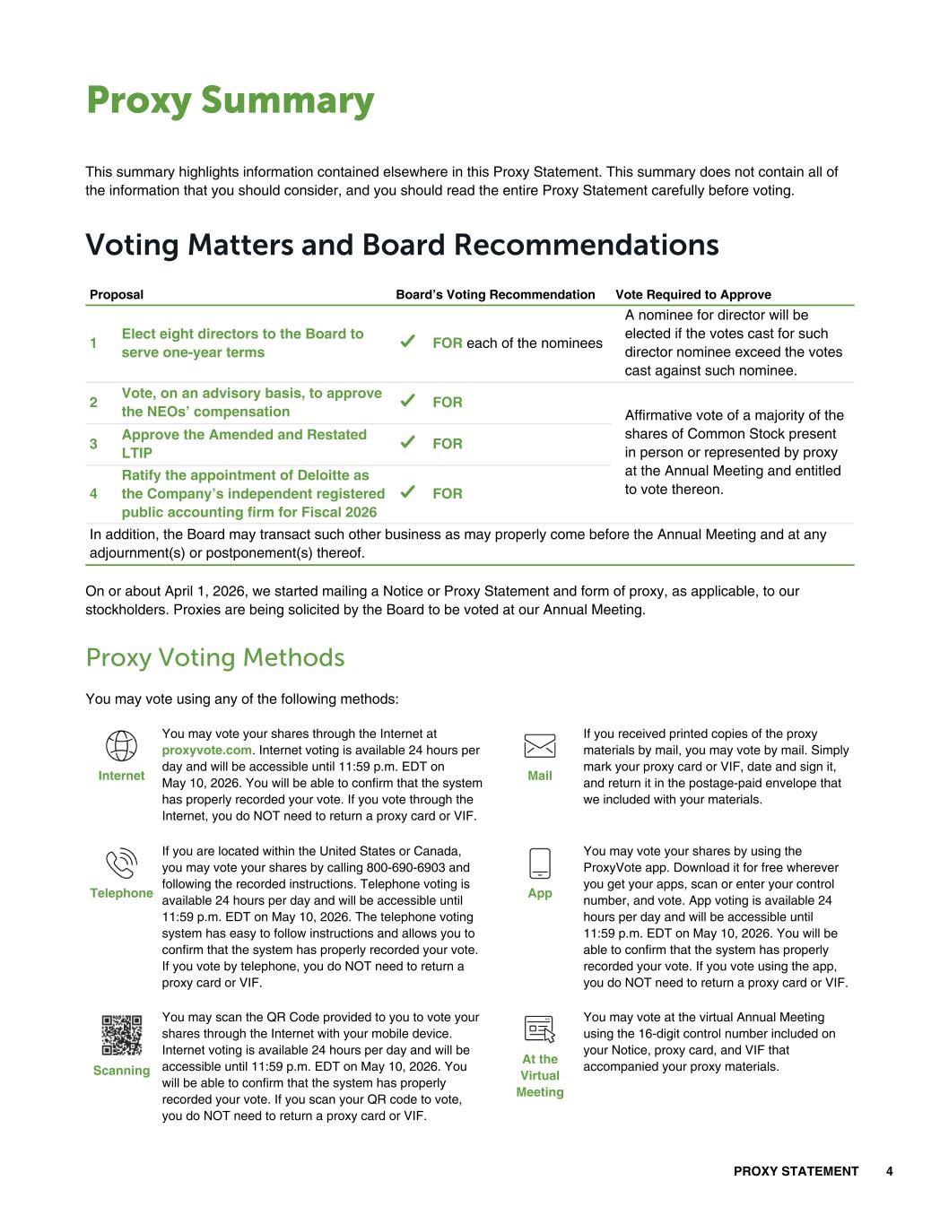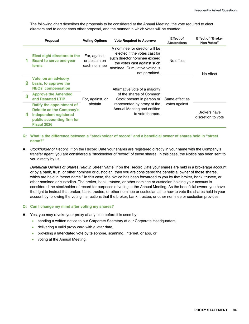The following chart describes the proposals to be considered at the Annual Meeting, the vote required to elect directors and to adopt each other proposal, and the manner in which votes will be counted: Proposal Voting Options Vote Required to Approve Effect of Abstentions Effect of “Broker Non-Votes” 1 Elect eight directors to the Board to serve one-year terms For, against, or abstain on each nominee A nominee for director will be elected if the votes cast for such director nominee exceed the votes cast against such nominee. Cumulative voting is not permitted. No effect No effect 2 Vote, on an advisory basis, to approve the NEOs’ compensation For, against, or abstain Affirmative vote of a majority of the shares of Common Stock present in person or represented by proxy at the Annual Meeting and entitled to vote thereon. Same effect as votes against 3 Approve the Amended and Restated LTIP 4 Ratify the appointment of Deloitte as the Company’s independent registered public accounting firm for Fiscal 2026 Brokers have discretion to vote Q: What is the difference between a “stockholder of record” and a beneficial owner of shares held in “street name?” A: Stockholder of Record: If on the Record Date your shares are registered directly in your name with the Company’s transfer agent, you are considered a “stockholder of record” of those shares. In this case, the Notice has been sent to you directly by us. Beneficial Owners of Shares Held in Street Name: If on the Record Date your shares are held in a brokerage account or by a bank, trust, or other nominee or custodian, then you are considered the beneficial owner of those shares, which are held in “street name.” In this case, the Notice has been forwarded to you by that broker, bank, trustee, or other nominee or custodian. The broker, bank, trustee, or other nominee or custodian holding your account is considered the stockholder of record for purposes of voting at the Annual Meeting. As the beneficial owner, you have the right to instruct that broker, bank, trustee, or other nominee or custodian as to how to vote the shares held in your account by following the voting instructions that the broker, bank, trustee, or other nominee or custodian provides. Q: Can I change my mind after voting my shares? A: Yes, you may revoke your proxy at any time before it is used by: • sending a written notice to our Corporate Secretary at our Corporate Headquarters, • delivering a valid proxy card with a later date, • providing a later-dated vote by telephone, scanning, Internet, or app, or • voting at the Annual Meeting. Frequently Asked Questions PROXY STATEMENT 94