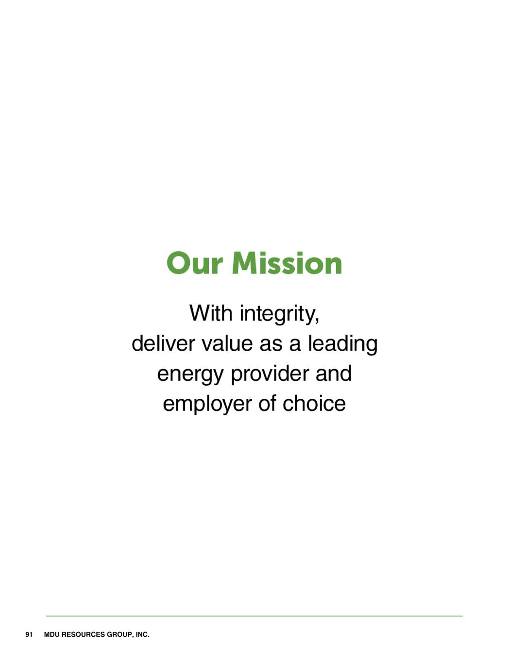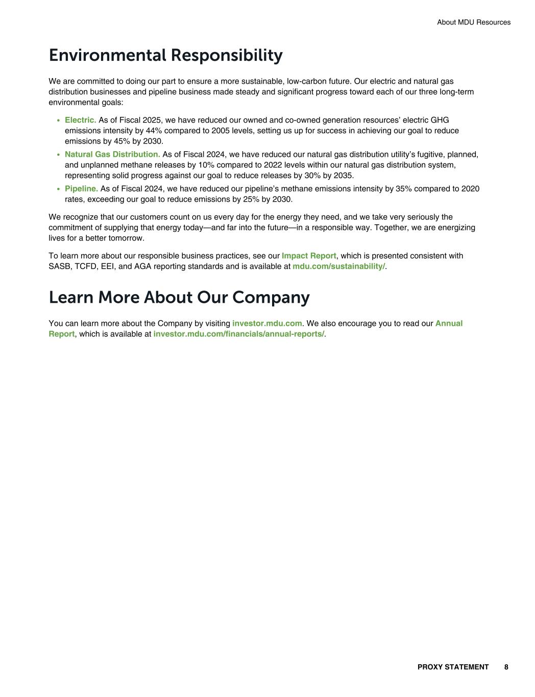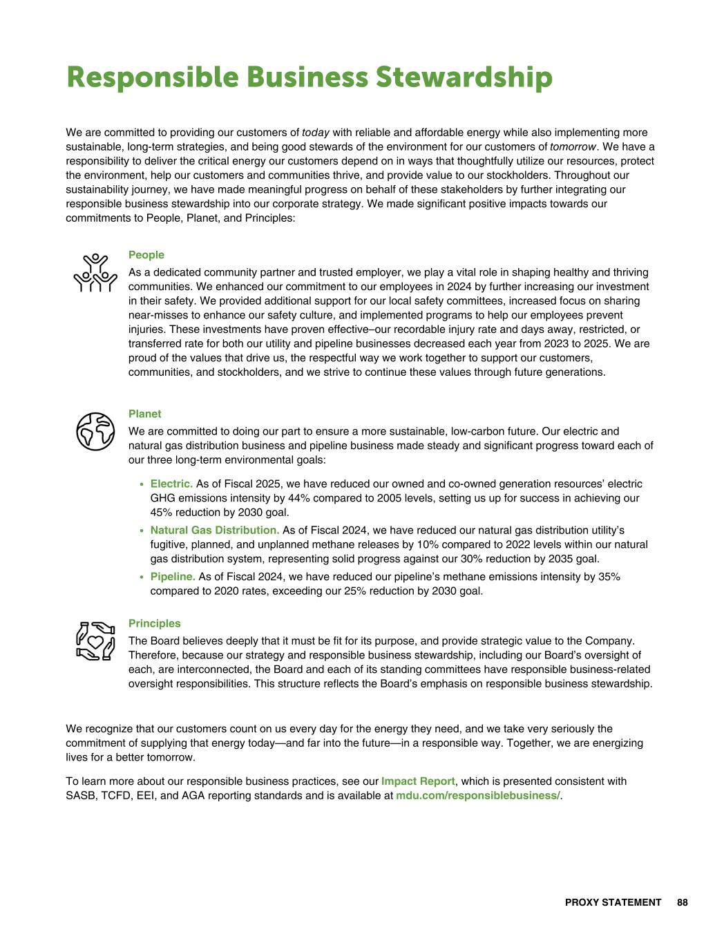 Responsible Business Stewardship We are committed to providing our customers of today with reliable and affordable energy while also implementing more sustainable, long-term strategies, and being good stewards of the environment for our customers of tomorrow. We have a responsibility to deliver the critical energy our customers depend on in ways that thoughtfully utilize our resources, protect the environment, help our customers and communities thrive, and provide value to our stockholders. Throughout our sustainability journey, we have made meaningful progress on behalf of these stakeholders by further integrating our responsible business stewardship into our corporate strategy. We made significant positive impacts towards our commitments to People, Planet, and Principles: People As a dedicated community partner and trusted employer, we play a vital role in shaping healthy and thriving communities. We enhanced our commitment to our employees in 2024 by further increasing our investment in their safety. We provided additional support for our local safety committees, increased focus on sharing near-misses to enhance our safety culture, and implemented programs to help our employees prevent injuries. These investments have proven effective–our recordable injury rate and days away, restricted, or transferred rate for both our utility and pipeline businesses decreased each year from 2023 to 2025. We are proud of the values that drive us, the respectful way we work together to support our customers, communities, and stockholders, and we strive to continue these values through future generations. Planet We are committed to doing our part to ensure a more sustainable, low-carbon future. Our electric and natural gas distribution business and pipeline business made steady and significant progress toward each of our three long-term environmental goals: • Electric. As of Fiscal 2025, we have reduced our owned and co-owned generation resources’ electric GHG emissions intensity by 44% compared to 2005 levels, setting us up for success in achieving our 45% reduction by 2030 goal. • Natural Gas Distribution. As of Fiscal 2024, we have reduced our natural gas distribution utility’s fugitive, planned, and unplanned methane releases by 10% compared to 2022 levels within our natural gas distribution system, representing solid progress against our 30% reduction by 2035 goal. • Pipeline. As of Fiscal 2024, we have reduced our pipeline’s methane emissions intensity by 35% compared to 2020 rates, exceeding our 25% reduction by 2030 goal. Principles The Board believes deeply that it must be fit for its purpose, and provide strategic value to the Company. Therefore, because our strategy and responsible business stewardship, including our Board’s oversight of each, are interconnected, the Board and each of its standing committees have responsible business-related oversight responsibilities. This structure reflects the Board’s emphasis on responsible business stewardship. We recognize that our customers count on us every day for the energy they need, and we take very seriously the commitment of supplying that energy today—and far into the future—in a responsible way. Together, we are energizing lives for a better tomorrow. To learn more about our responsible business practices, see our Impact Report, which is presented consistent with SASB, TCFD, EEI, and AGA reporting standards and is available at mdu.com/responsiblebusiness/. PROXY STATEMENT 88