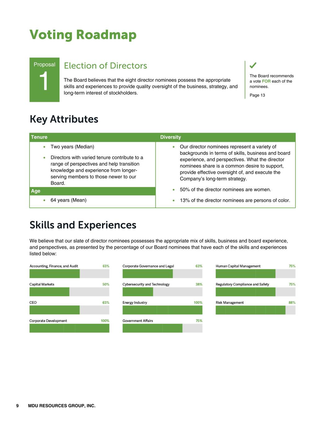 Director Nominees’ Skillset Matrix We believe the director nominees possess the appropriate mix of genders, ages, ethnicities, skills, business and board experience, and viewpoints. The Governance Committee regularly reviews the skills and experience that it believes are desirable to be represented on the Board. These key qualifications, including the nominees possessing these skills, are shown below. Strategy Corporate Development experience assessing potential organic and external growth opportunities l l l l l l l l Human Capital Management experience in enterprise-wide management and development of talent and corporate culture l l l l l l Energy Industry experience in our businesses and related industries, including the provision of safe, reliable, and affordable service by electric and natural gas utilities and pipelines l l l l l l l l Regulatory Compliance and Safety experience in governmental regulations affecting our businesses and the safety of employees, customers, and the public l l l l l l Governance Accounting, Finance, and Audit experience in the preparation and review of financial statements, financial reports, and audit reports l l l l l Capital Markets experience overseeing financings, investments, capital structures, and financial strategy l l l l CEO experience of a public company or substantial private company engaging with a variety of important stakeholders l l l l l Corporate Governance and Legal experience dealing with complex public company governance and legal issues l l l l l Cybersecurity and Technology experience overseeing information technology systems and data management, including AI, and the protection of Company and customer information l l l Government Affairs experience with public policy issues affecting our businesses and customers l l l l l l Risk Management experience in the identification, assessment, and mitigation of risks facing the Company l l l l l l l Skills, Experience, and Expertise Anderson Kivisto Dosch Durkin Jaeger Kelley Miller Patel Proposal 1: Election of Directors 21 MDU RESOURCES GROUP, INC.