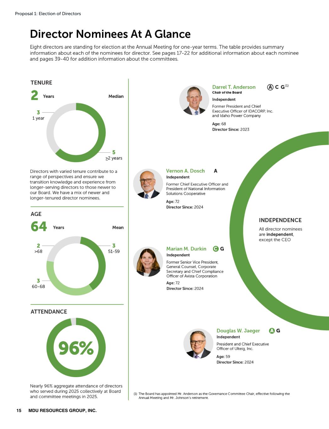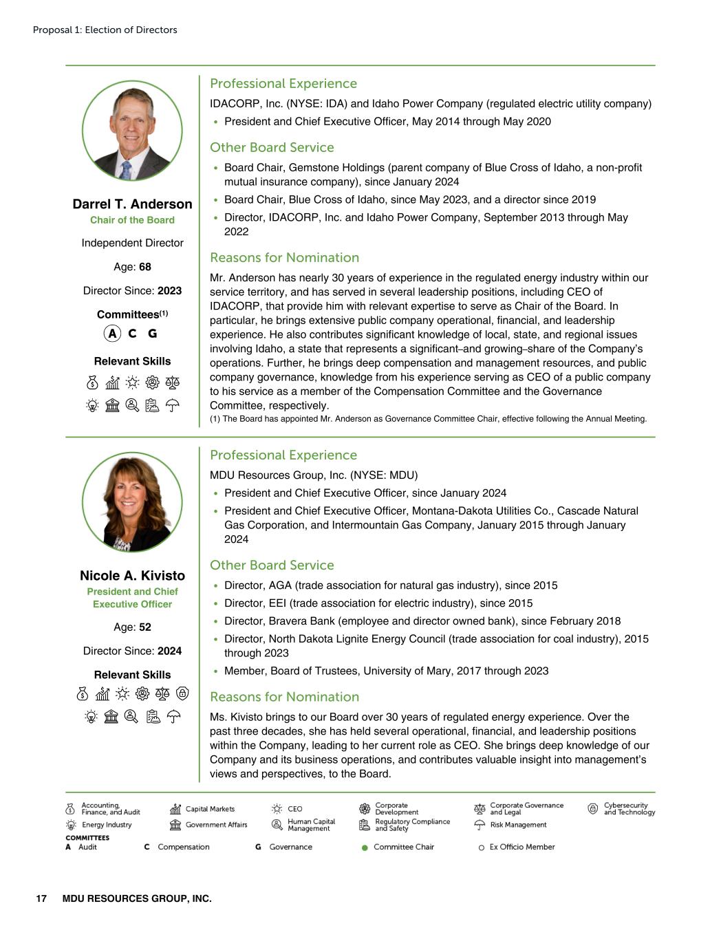 Darrel T. Anderson Chair of the Board Independent Director Age: 68 Director Since: 2023 Committees(1) Relevant Skills Professional Experience IDACORP, Inc. (NYSE: IDA) and Idaho Power Company (regulated electric utility company) • President and Chief Executive Officer, May 2014 through May 2020 Other Board Service • Board Chair, Gemstone Holdings (parent company of Blue Cross of Idaho, a non-profit mutual insurance company), since January 2024 • Board Chair, Blue Cross of Idaho, since May 2023, and a director since 2019 • Director, IDACORP, Inc. and Idaho Power Company, September 2013 through May 2022 Reasons for Nomination Mr. Anderson has nearly 30 years of experience in the regulated energy industry within our service territory, and has served in several leadership positions, including CEO of IDACORP, that provide him with relevant expertise to serve as Chair of the Board. In particular, he brings extensive public company operational, financial, and leadership experience. He also contributes significant knowledge of local, state, and regional issues involving Idaho, a state that represents a significant–and growing–share of the Company’s operations. Further, he brings deep compensation and management resources, and public company governance, knowledge from his experience serving as CEO of a public company to his service as a member of the Compensation Committee and the Governance Committee, respectively. (1) The Board has appointed Mr. Anderson as Governance Committee Chair, effective following the Annual Meeting. Nicole A. Kivisto President and Chief Executive Officer Age: 52 Director Since: 2024 Relevant Skills Professional Experience MDU Resources Group, Inc. (NYSE: MDU) • President and Chief Executive Officer, since January 2024 • President and Chief Executive Officer, Montana-Dakota Utilities Co., Cascade Natural Gas Corporation, and Intermountain Gas Company, January 2015 through January 2024 Other Board Service • Director, AGA (trade association for natural gas industry), since 2015 • Director, EEI (trade association for electric industry), since 2015 • Director, Bravera Bank (employee and director owned bank), since February 2018 • Director, North Dakota Lignite Energy Council (trade association for coal industry), 2015 through 2023 • Member, Board of Trustees, University of Mary, 2017 through 2023 Reasons for Nomination Ms. Kivisto brings to our Board over 30 years of regulated energy experience. Over the past three decades, she has held several operational, financial, and leadership positions within the Company, leading to her current role as CEO. She brings deep knowledge of our Company and its business operations, and contributes valuable insight into management’s views and perspectives, to the Board. Proposal 1: Election of Directors 17 MDU RESOURCES GROUP, INC.