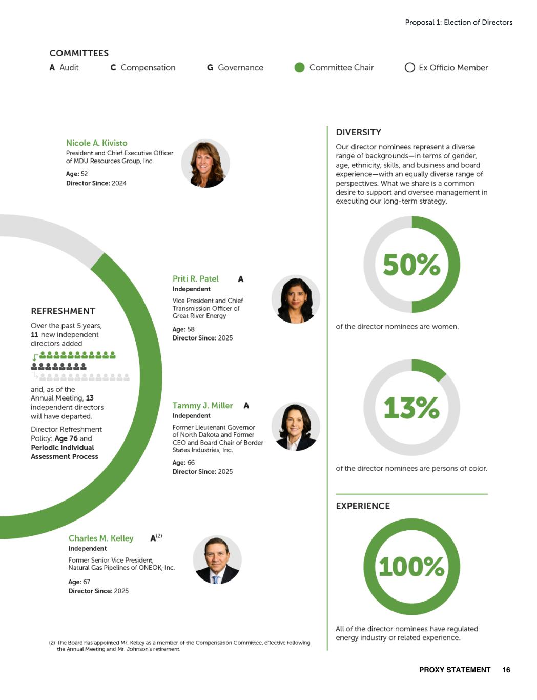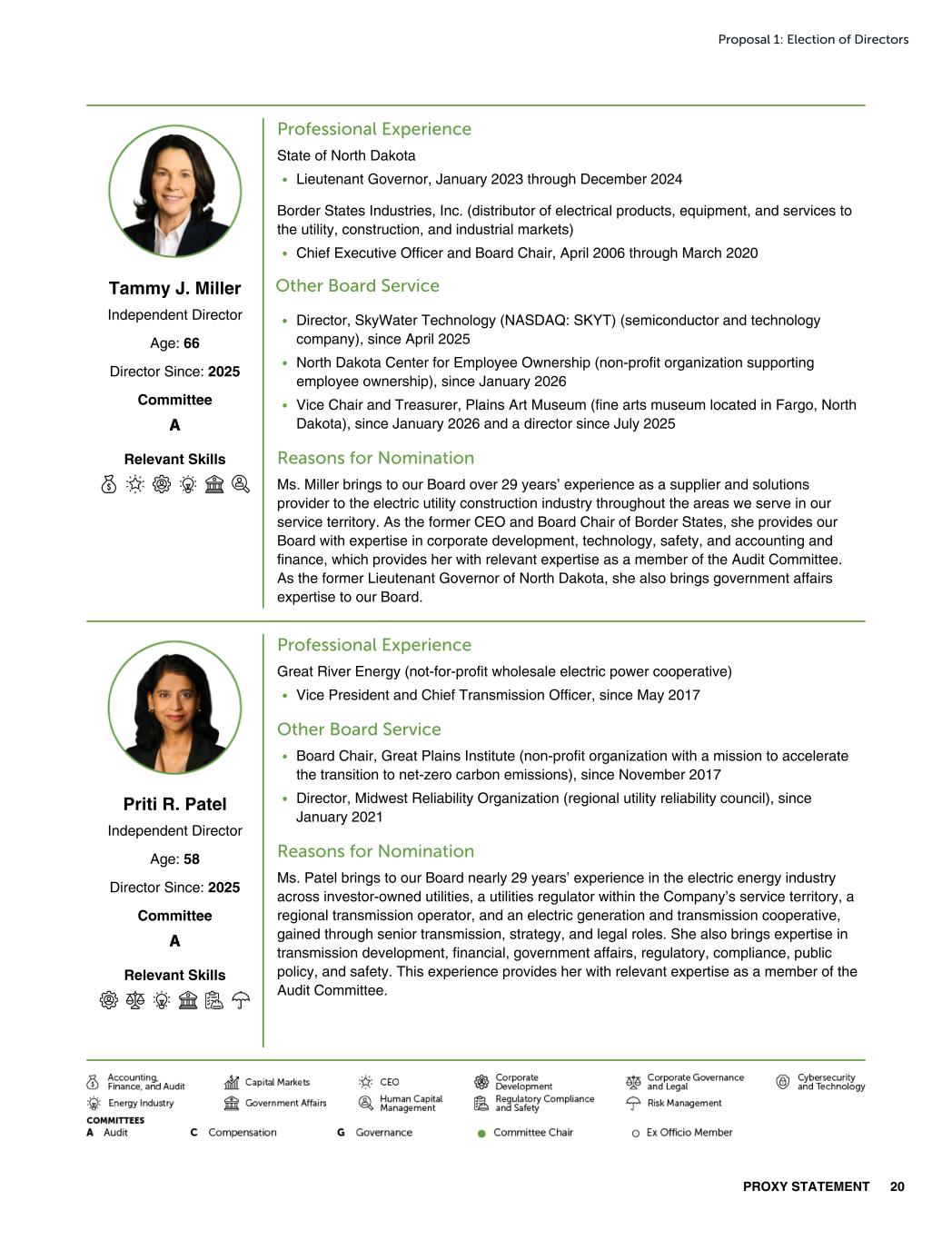 Tammy J. Miller Independent Director Age: 66 Director Since: 2025 Committee Relevant Skills Professional Experience State of North Dakota • Lieutenant Governor, January 2023 through December 2024 Border States Industries, Inc. (distributor of electrical products, equipment, and services to the utility, construction, and industrial markets) • Chief Executive Officer and Board Chair, April 2006 through March 2020 Other Board Service • Director, SkyWater Technology (NASDAQ: SKYT) (semiconductor and technology company), since April 2025 • North Dakota Center for Employee Ownership (non-profit organization supporting employee ownership), since January 2026 • Vice Chair and Treasurer, Plains Art Museum (fine arts museum located in Fargo, North Dakota), since January 2026 and a director since July 2025 Reasons for Nomination Ms. Miller brings to our Board over 29 years’ experience as a supplier and solutions provider to the electric utility construction industry throughout the areas we serve in our service territory. As the former CEO and Board Chair of Border States, she provides our Board with expertise in corporate development, technology, safety, and accounting and finance, which provides her with relevant expertise as a member of the Audit Committee. As the former Lieutenant Governor of North Dakota, she also brings government affairs expertise to our Board. Priti R. Patel Independent Director Age: 58 Director Since: 2025 Committee Relevant Skills Professional Experience Great River Energy (not-for-profit wholesale electric power cooperative) • Vice President and Chief Transmission Officer, since May 2017 Other Board Service • Board Chair, Great Plains Institute (non-profit organization with a mission to accelerate the transition to net-zero carbon emissions), since November 2017 • Director, Midwest Reliability Organization (regional utility reliability council), since January 2021 Reasons for Nomination Ms. Patel brings to our Board nearly 29 years’ experience in the electric energy industry across investor-owned utilities, a utilities regulator within the Company’s service territory, a regional transmission operator, and an electric generation and transmission cooperative, gained through senior transmission, strategy, and legal roles. She also brings expertise in transmission development, financial, government affairs, regulatory, compliance, public policy, and safety. This experience provides her with relevant expertise as a member of the Audit Committee. Proposal 1: Election of Directors PROXY STATEMENT 20