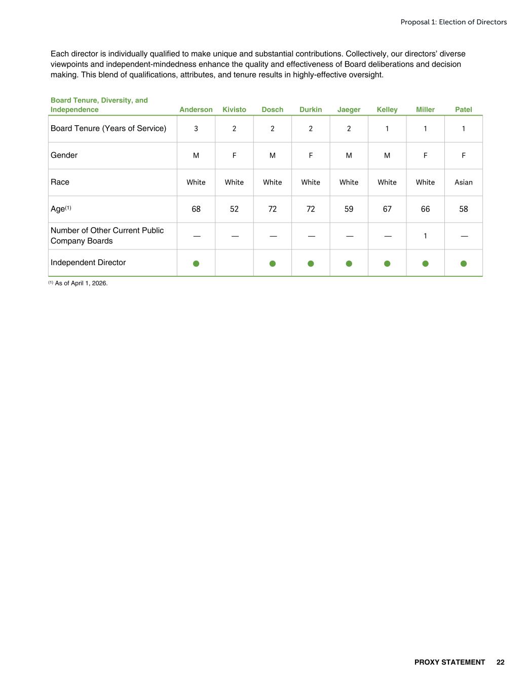 Each director is individually qualified to make unique and substantial contributions. Collectively, our directors’ diverse viewpoints and independent-mindedness enhance the quality and effectiveness of Board deliberations and decision making. This blend of qualifications, attributes, and tenure results in highly-effective oversight. Board Tenure, Diversity, and Independence Anderson Kivisto Dosch Durkin Jaeger Kelley Miller Patel Board Tenure (Years of Service) 3 2 2 2 2 1 1 1 Gender M F M F M M F F Race White White White White White White White Asian Age(1) 68 52 72 72 59 67 66 58 Number of Other Current Public Company Boards — — — — — — 1 — Independent Director l l l l l l l (1) As of April 1, 2026. Proposal 1: Election of Directors PROXY STATEMENT 22