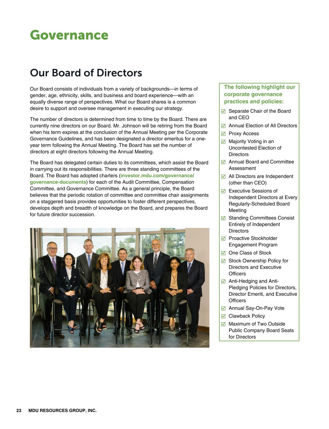 Governance Our Board of Directors Our Board consists of individuals from a variety of backgrounds—in terms of gender, age, ethnicity, skills, and business and board experience—with an equally diverse range of perspectives. What our Board shares is a common desire to support and oversee management in executing our strategy. The number of directors is determined from time to time by the Board. There are currently nine directors on our Board. Mr. Johnson will be retiring from the Board when his term expires at the conclusion of the Annual Meeting per the Corporate Governance Guidelines, and has been designated a director emeritus for a one- year term following the Annual Meeting. The Board has set the number of directors at eight directors following the Annual Meeting. The Board has delegated certain duties to its committees, which assist the Board in carrying out its responsibilities. There are three standing committees of the Board. The Board has adopted charters (investor.mdu.com/governance/ governance-documents) for each of the Audit Committee, Compensation Committee, and Governance Committee. As a general principle, the Board believes that the periodic rotation of committee and committee chair assignments on a staggered basis provides opportunities to foster different perspectives, develops depth and breadth of knowledge on the Board, and prepares the Board for future director succession. The following highlight our corporate governance practices and policies: þ Separate Chair of the Board and CEO þ Annual Election of All Directors þ Proxy Access þ Majority Voting in an Uncontested Election of Directors þ Annual Board and Committee Assessment þ All Directors are Independent (other than CEO) þ Executive Sessions of Independent Directors at Every Regularly-Scheduled Board Meeting þ Standing Committees Consist Entirely of Independent Directors þ Proactive Stockholder Engagement Program þ One Class of Stock þ Stock Ownership Policy for Directors and Executive Officers þ Anti-Hedging and Anti- Pledging Policies for Directors, Director Emeriti, and Executive Officers þ Annual Say-On-Pay Vote þ Clawback Policy þ Maximum of Two Outside Public Company Board Seats for Directors 23 MDU RESOURCES GROUP, INC.