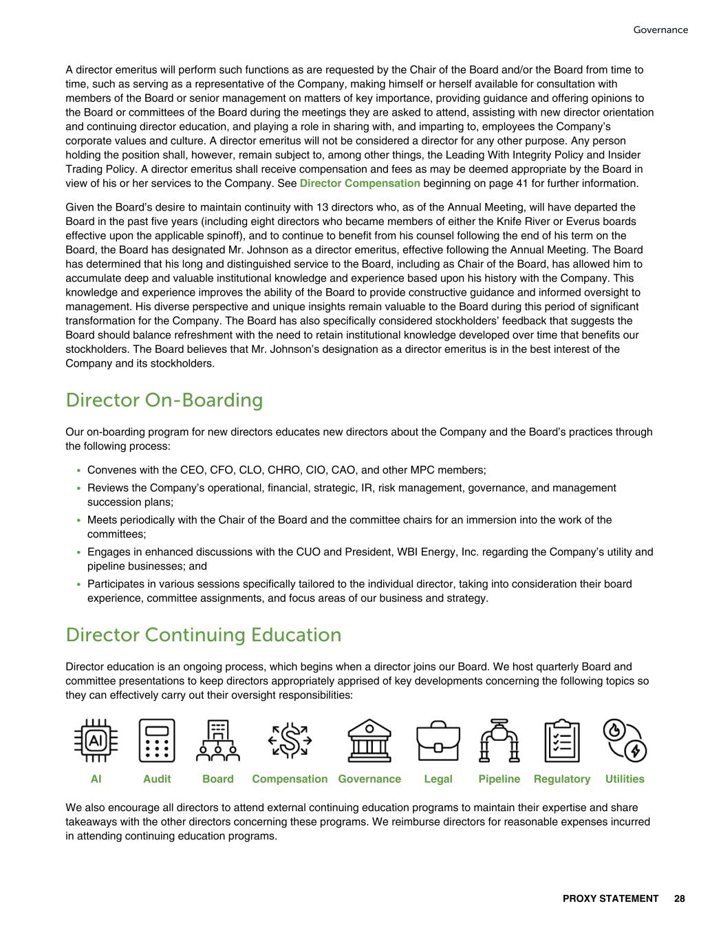 A director emeritus will perform such functions as are requested by the Chair of the Board and/or the Board from time to time, such as serving as a representative of the Company, making himself or herself available for consultation with members of the Board or senior management on matters of key importance, providing guidance and offering opinions to the Board or committees of the Board during the meetings they are asked to attend, assisting with new director orientation and continuing director education, and playing a role in sharing with, and imparting to, employees the Company’s corporate values and culture. A director emeritus will not be considered a director for any other purpose. Any person holding the position shall, however, remain subject to, among other things, the Leading With Integrity Policy and Insider Trading Policy. A director emeritus shall receive compensation and fees as may be deemed appropriate by the Board in view of his or her services to the Company. See Director Compensation beginning on page 41 for further information. Given the Board’s desire to maintain continuity with 13 directors who, as of the Annual Meeting, will have departed the Board in the past five years (including eight directors who became members of either the Knife River or Everus boards effective upon the applicable spinoff), and to continue to benefit from his counsel following the end of his term on the Board, the Board has designated Mr. Johnson as a director emeritus, effective following the Annual Meeting. The Board has determined that his long and distinguished service to the Board, including as Chair of the Board, has allowed him to accumulate deep and valuable institutional knowledge and experience based upon his history with the Company. This knowledge and experience improves the ability of the Board to provide constructive guidance and informed oversight to management. His diverse perspective and unique insights remain valuable to the Board during this period of significant transformation for the Company. The Board has also specifically considered stockholders’ feedback that suggests the Board should balance refreshment with the need to retain institutional knowledge developed over time that benefits our stockholders. The Board believes that Mr. Johnson’s designation as a director emeritus is in the best interest of the Company and its stockholders. Director On-Boarding Our on-boarding program for new directors educates new directors about the Company and the Board’s practices through the following process: • Convenes with the CEO, CFO, CLO, CHRO, CIO, CAO, and other MPC members; • Reviews the Company’s operational, financial, strategic, IR, risk management, governance, and management succession plans; • Meets periodically with the Chair of the Board and the committee chairs for an immersion into the work of the committees; • Engages in enhanced discussions with the CUO and President, WBI Energy, Inc. regarding the Company’s utility and pipeline businesses; and • Participates in various sessions specifically tailored to the individual director, taking into consideration their board experience, committee assignments, and focus areas of our business and strategy. Director Continuing Education Director education is an ongoing process, which begins when a director joins our Board. We host quarterly Board and committee presentations to keep directors appropriately apprised of key developments concerning the following topics so they can effectively carry out their oversight responsibilities: AI Audit Board Compensation Governance Legal Pipeline Regulatory Utilities We also encourage all directors to attend external continuing education programs to maintain their expertise and share takeaways with the other directors concerning these programs. We reimburse directors for reasonable expenses incurred in attending continuing education programs. Governance PROXY STATEMENT 28