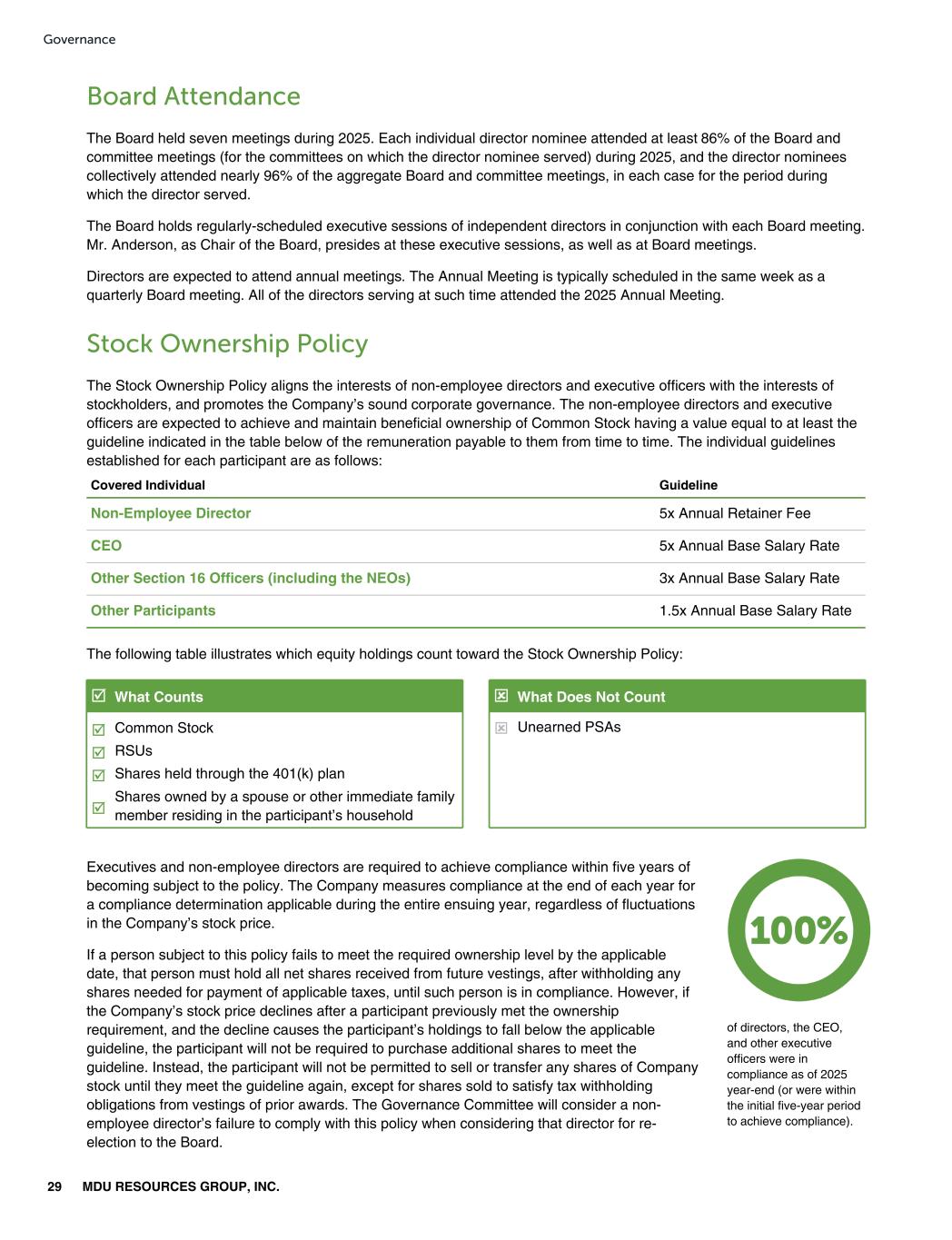 Board Attendance The Board held seven meetings during 2025. Each individual director nominee attended at least 86% of the Board and committee meetings (for the committees on which the director nominee served) during 2025, and the director nominees collectively attended nearly 96% of the aggregate Board and committee meetings, in each case for the period during which the director served. The Board holds regularly-scheduled executive sessions of independent directors in conjunction with each Board meeting. Mr. Anderson, as Chair of the Board, presides at these executive sessions, as well as at Board meetings. Directors are expected to attend annual meetings. The Annual Meeting is typically scheduled in the same week as a quarterly Board meeting. All of the directors serving at such time attended the 2025 Annual Meeting. Stock Ownership Policy The Stock Ownership Policy aligns the interests of non-employee directors and executive officers with the interests of stockholders, and promotes the Company’s sound corporate governance. The non-employee directors and executive officers are expected to achieve and maintain beneficial ownership of Common Stock having a value equal to at least the guideline indicated in the table below of the remuneration payable to them from time to time. The individual guidelines established for each participant are as follows: Covered Individual Guideline Non-Employee Director 5x Annual Retainer Fee CEO 5x Annual Base Salary Rate Other Section 16 Officers (including the NEOs) 3x Annual Base Salary Rate Other Participants 1.5x Annual Base Salary Rate The following table illustrates which equity holdings count toward the Stock Ownership Policy: þ What Counts ý What Does Not Count þ Common Stock ý Unearned PSAs þ RSUs þ Shares held through the 401(k) plan þ Shares owned by a spouse or other immediate family member residing in the participant’s household Executives and non-employee directors are required to achieve compliance within five years of becoming subject to the policy. The Company measures compliance at the end of each year for a compliance determination applicable during the entire ensuing year, regardless of fluctuations in the Company’s stock price. If a person subject to this policy fails to meet the required ownership level by the applicable date, that person must hold all net shares received from future vestings, after withholding any shares needed for payment of applicable taxes, until such person is in compliance. However, if the Company’s stock price declines after a participant previously met the ownership requirement, and the decline causes the participant’s holdings to fall below the applicable guideline, the participant will not be required to purchase additional shares to meet the guideline. Instead, the participant will not be permitted to sell or transfer any shares of Company stock until they meet the guideline again, except for shares sold to satisfy tax withholding obligations from vestings of prior awards. The Governance Committee will consider a non- employee director’s failure to comply with this policy when considering that director for re- election to the Board. of directors, the CEO, and other executive officers were in compliance as of 2025 year-end (or were within the initial five-year period to achieve compliance). Governance 29 MDU RESOURCES GROUP, INC.