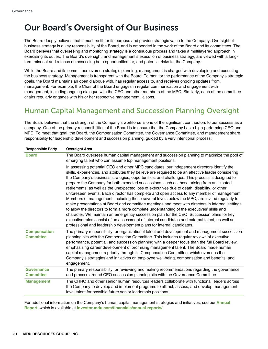 Our Board’s Oversight of Our Business The Board deeply believes that it must be fit for its purpose and provide strategic value to the Company. Oversight of business strategy is a key responsibility of the Board, and is embedded in the work of the Board and its committees. The Board believes that overseeing and monitoring strategy is a continuous process and takes a multilayered approach in exercising its duties. The Board’s oversight, and management’s execution of business strategy, are viewed with a long- term mindset and a focus on assessing both opportunities for, and potential risks to, the Company. While the Board and its committees oversee strategic planning, management is charged with developing and executing the business strategy. Management is transparent with the Board. To monitor the performance of the Company’s strategic goals, the Board maintains an open dialogue with, has regular access to, and receives ongoing updates from, management. For example, the Chair of the Board engages in regular communication and engagement with management, including ongoing dialogue with the CEO and other members of the MPC. Similarly, each of the committee chairs regularly engages with his or her respective management liaisons. Human Capital Management and Succession Planning Oversight The Board believes that the strength of the Company’s workforce is one of the significant contributors to our success as a company. One of the primary responsibilities of the Board is to ensure that the Company has a high-performing CEO and MPC. To meet that goal, the Board, the Compensation Committee, the Governance Committee, and management share responsibility for leadership development and succession planning, guided by a very intentional process: Responsible Party Oversight Area Board The Board oversees human capital management and succession planning to maximize the pool of emerging talent who can assume top management positions. In assessing potential CEO and other MPC candidates, our independent directors identify the skills, experiences, and attributes they believe are required to be an effective leader considering the Company’s business strategies, opportunities, and challenges. This process is designed to prepare the Company for both expected successions, such as those arising from anticipated retirements, as well as the unexpected loss of executives due to death, disability, or other unforeseen events. Each director has complete and open access to any member of management. Members of management, including those several levels below the MPC, are invited regularly to make presentations at Board and committee meetings and meet with directors in informal settings to allow the directors to form a more complete understanding of the executives’ skills and character. We maintain an emergency succession plan for the CEO. Succession plans for key executive roles consist of an assessment of internal candidates and external talent, as well as professional and leadership development plans for internal candidates. Compensation Committee The primary responsibility for organizational talent and development and management succession planning sits with the Compensation Committee. This includes regular reviews of executive performance, potential, and succession planning with a deeper focus than the full Board review, emphasizing career development of promising management talent. The Board made human capital management a priority through its Compensation Committee, which oversees the Company’s strategies and initiatives on employee well-being, compensation and benefits, and engagement. Governance Committee The primary responsibility for reviewing and making recommendations regarding the governance and process around CEO succession planning sits with the Governance Committee. Management The CHRO and other senior human resources leaders collaborate with functional leaders across the Company to develop and implement programs to attract, assess, and develop management- level talent for possible future senior leadership positions. For additional information on the Company’s human capital management strategies and initiatives, see our Annual Report, which is available at investor.mdu.com/financials/annual-reports/. Governance 31 MDU RESOURCES GROUP, INC.
