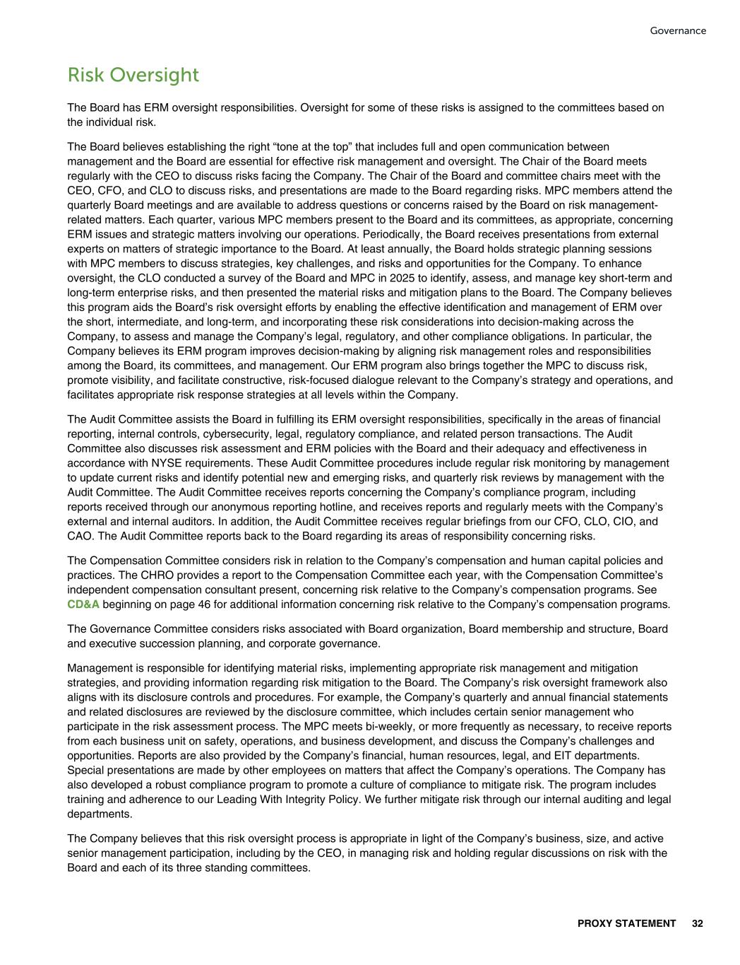 Risk Oversight The Board has ERM oversight responsibilities. Oversight for some of these risks is assigned to the committees based on the individual risk. The Board believes establishing the right “tone at the top” that includes full and open communication between management and the Board are essential for effective risk management and oversight. The Chair of the Board meets regularly with the CEO to discuss risks facing the Company. The Chair of the Board and committee chairs meet with the CEO, CFO, and CLO to discuss risks, and presentations are made to the Board regarding risks. MPC members attend the quarterly Board meetings and are available to address questions or concerns raised by the Board on risk management- related matters. Each quarter, various MPC members present to the Board and its committees, as appropriate, concerning ERM issues and strategic matters involving our operations. Periodically, the Board receives presentations from external experts on matters of strategic importance to the Board. At least annually, the Board holds strategic planning sessions with MPC members to discuss strategies, key challenges, and risks and opportunities for the Company. To enhance oversight, the CLO conducted a survey of the Board and MPC in 2025 to identify, assess, and manage key short-term and long-term enterprise risks, and then presented the material risks and mitigation plans to the Board. The Company believes this program aids the Board’s risk oversight efforts by enabling the effective identification and management of ERM over the short, intermediate, and long-term, and incorporating these risk considerations into decision-making across the Company, to assess and manage the Company’s legal, regulatory, and other compliance obligations. In particular, the Company believes its ERM program improves decision-making by aligning risk management roles and responsibilities among the Board, its committees, and management. Our ERM program also brings together the MPC to discuss risk, promote visibility, and facilitate constructive, risk-focused dialogue relevant to the Company’s strategy and operations, and facilitates appropriate risk response strategies at all levels within the Company. The Audit Committee assists the Board in fulfilling its ERM oversight responsibilities, specifically in the areas of financial reporting, internal controls, cybersecurity, legal, regulatory compliance, and related person transactions. The Audit Committee also discusses risk assessment and ERM policies with the Board and their adequacy and effectiveness in accordance with NYSE requirements. These Audit Committee procedures include regular risk monitoring by management to update current risks and identify potential new and emerging risks, and quarterly risk reviews by management with the Audit Committee. The Audit Committee receives reports concerning the Company’s compliance program, including reports received through our anonymous reporting hotline, and receives reports and regularly meets with the Company’s external and internal auditors. In addition, the Audit Committee receives regular briefings from our CFO, CLO, CIO, and CAO. The Audit Committee reports back to the Board regarding its areas of responsibility concerning risks. The Compensation Committee considers risk in relation to the Company’s compensation and human capital policies and practices. The CHRO provides a report to the Compensation Committee each year, with the Compensation Committee’s independent compensation consultant present, concerning risk relative to the Company’s compensation programs. See CD&A beginning on page 46 for additional information concerning risk relative to the Company’s compensation programs. The Governance Committee considers risks associated with Board organization, Board membership and structure, Board and executive succession planning, and corporate governance. Management is responsible for identifying material risks, implementing appropriate risk management and mitigation strategies, and providing information regarding risk mitigation to the Board. The Company’s risk oversight framework also aligns with its disclosure controls and procedures. For example, the Company’s quarterly and annual financial statements and related disclosures are reviewed by the disclosure committee, which includes certain senior management who participate in the risk assessment process. The MPC meets bi-weekly, or more frequently as necessary, to receive reports from each business unit on safety, operations, and business development, and discuss the Company’s challenges and opportunities. Reports are also provided by the Company’s financial, human resources, legal, and EIT departments. Special presentations are made by other employees on matters that affect the Company’s operations. The Company has also developed a robust compliance program to promote a culture of compliance to mitigate risk. The program includes training and adherence to our Leading With Integrity Policy. We further mitigate risk through our internal auditing and legal departments. The Company believes that this risk oversight process is appropriate in light of the Company’s business, size, and active senior management participation, including by the CEO, in managing risk and holding regular discussions on risk with the Board and each of its three standing committees. Governance PROXY STATEMENT 32