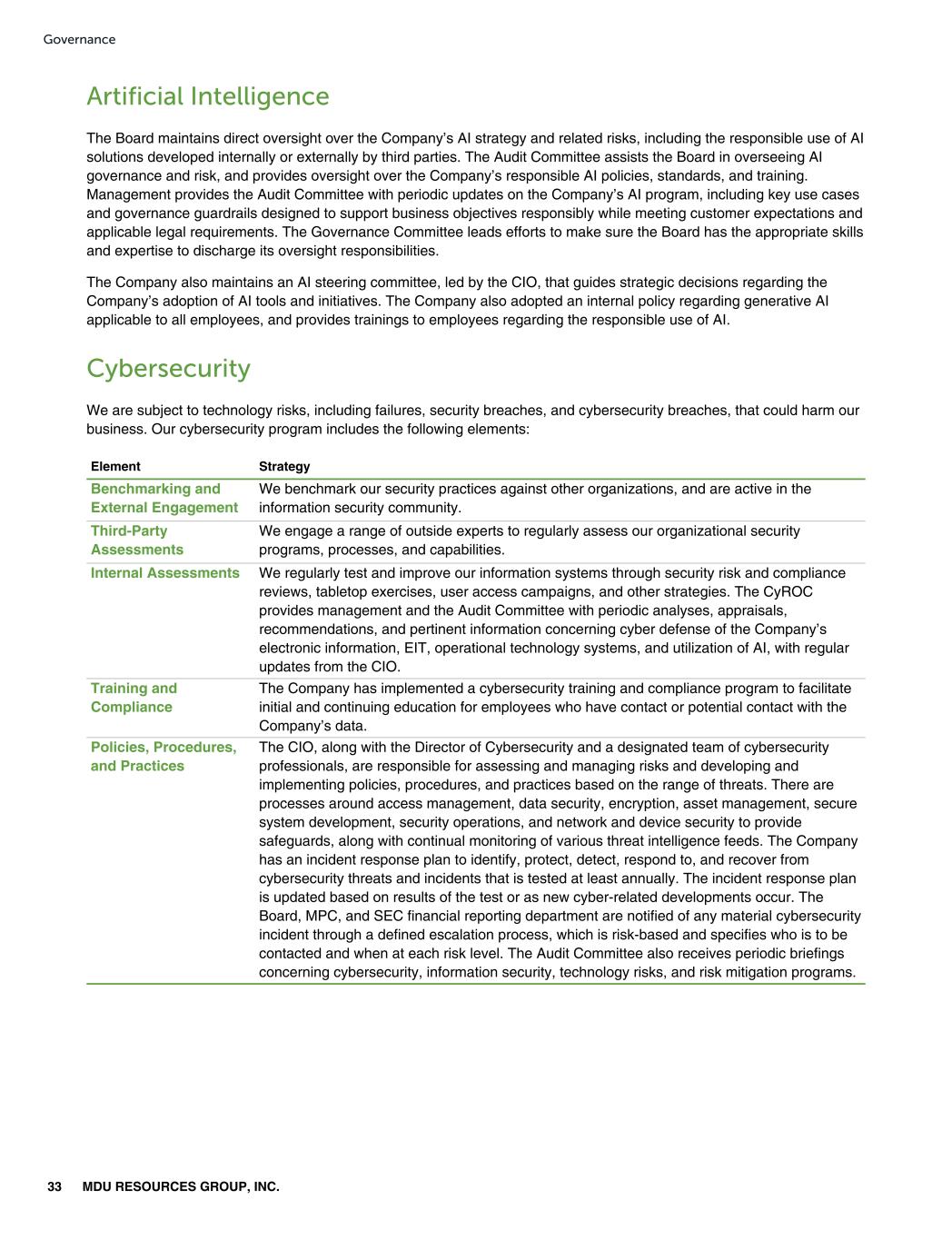 Artificial Intelligence The Board maintains direct oversight over the Company’s AI strategy and related risks, including the responsible use of AI solutions developed internally or externally by third parties. The Audit Committee assists the Board in overseeing AI governance and risk, and provides oversight over the Company’s responsible AI policies, standards, and training. Management provides the Audit Committee with periodic updates on the Company’s AI program, including key use cases and governance guardrails designed to support business objectives responsibly while meeting customer expectations and applicable legal requirements. The Governance Committee leads efforts to make sure the Board has the appropriate skills and expertise to discharge its oversight responsibilities. The Company also maintains an AI steering committee, led by the CIO, that guides strategic decisions regarding the Company’s adoption of AI tools and initiatives. The Company also adopted an internal policy regarding generative AI applicable to all employees, and provides trainings to employees regarding the responsible use of AI. Cybersecurity We are subject to technology risks, including failures, security breaches, and cybersecurity breaches, that could harm our business. Our cybersecurity program includes the following elements: Element Strategy Benchmarking and External Engagement We benchmark our security practices against other organizations, and are active in the information security community. Third-Party Assessments We engage a range of outside experts to regularly assess our organizational security programs, processes, and capabilities. Internal Assessments We regularly test and improve our information systems through security risk and compliance reviews, tabletop exercises, user access campaigns, and other strategies. The CyROC provides management and the Audit Committee with periodic analyses, appraisals, recommendations, and pertinent information concerning cyber defense of the Company’s electronic information, EIT, operational technology systems, and utilization of AI, with regular updates from the CIO. Training and Compliance The Company has implemented a cybersecurity training and compliance program to facilitate initial and continuing education for employees who have contact or potential contact with the Company’s data. Policies, Procedures, and Practices The CIO, along with the Director of Cybersecurity and a designated team of cybersecurity professionals, are responsible for assessing and managing risks and developing and implementing policies, procedures, and practices based on the range of threats. There are processes around access management, data security, encryption, asset management, secure system development, security operations, and network and device security to provide safeguards, along with continual monitoring of various threat intelligence feeds. The Company has an incident response plan to identify, protect, detect, respond to, and recover from cybersecurity threats and incidents that is tested at least annually. The incident response plan is updated based on results of the test or as new cyber-related developments occur. The Board, MPC, and SEC financial reporting department are notified of any material cybersecurity incident through a defined escalation process, which is risk-based and specifies who is to be contacted and when at each risk level. The Audit Committee also receives periodic briefings concerning cybersecurity, information security, technology risks, and risk mitigation programs. Governance 33 MDU RESOURCES GROUP, INC.
