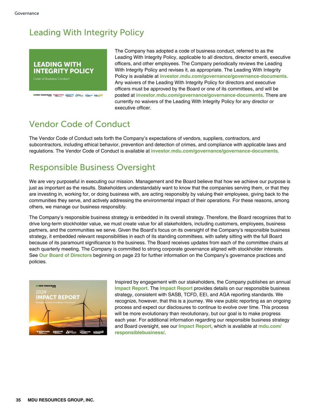 Leading With Integrity Policy The Company has adopted a code of business conduct, referred to as the Leading With Integrity Policy, applicable to all directors, director emeriti, executive officers, and other employees. The Company periodically reviews the Leading With Integrity Policy and revises it, as appropriate. The Leading With Integrity Policy is available at investor.mdu.com/governance/governance-documents. Any waivers of the Leading With Integrity Policy for directors and executive officers must be approved by the Board or one of its committees, and will be posted at investor.mdu.com/governance/governance-documents. There are currently no waivers of the Leading With Integrity Policy for any director or executive officer. Vendor Code of Conduct The Vendor Code of Conduct sets forth the Company’s expectations of vendors, suppliers, contractors, and subcontractors, including ethical behavior, prevention and detection of crimes, and compliance with applicable laws and regulations. The Vendor Code of Conduct is available at investor.mdu.com/governance/governance-documents. Responsible Business Oversight We are very purposeful in executing our mission. Management and the Board believe that how we achieve our purpose is just as important as the results. Stakeholders understandably want to know that the companies serving them, or that they are investing in, working for, or doing business with, are acting responsibly by valuing their employees, giving back to the communities they serve, and actively addressing the environmental impact of their operations. For these reasons, among others, we manage our business responsibly. The Company’s responsible business strategy is embedded in its overall strategy. Therefore, the Board recognizes that to drive long-term stockholder value, we must create value for all stakeholders, including customers, employees, business partners, and the communities we serve. Given the Board’s focus on its oversight of the Company’s responsible business strategy, it embedded relevant responsibilities in each of its standing committees, with safety sitting with the full Board because of its paramount significance to the business. The Board receives updates from each of the committee chairs at each quarterly meeting. The Company is committed to strong corporate governance aligned with stockholder interests. See Our Board of Directors beginning on page 23 for further information on the Company’s governance practices and policies. Inspired by engagement with our stakeholders, the Company publishes an annual Impact Report. The Impact Report provides details on our responsible business strategy, consistent with SASB, TCFD, EEI, and AGA reporting standards. We recognize, however, that this is a journey. We view public reporting as an ongoing process and expect our disclosures to continue to evolve over time. This process will be more evolutionary than revolutionary, but our goal is to make progress each year. For additional information regarding our responsible business strategy and Board oversight, see our Impact Report, which is available at mdu.com/ responsiblebusiness/. Governance 35 MDU RESOURCES GROUP, INC.