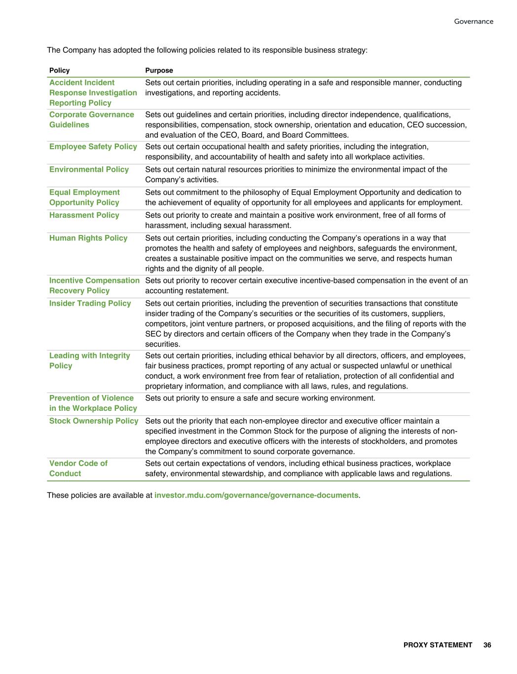 The Company has adopted the following policies related to its responsible business strategy: Policy Purpose Accident Incident Response Investigation Reporting Policy Sets out certain priorities, including operating in a safe and responsible manner, conducting investigations, and reporting accidents. Corporate Governance Guidelines Sets out guidelines and certain priorities, including director independence, qualifications, responsibilities, compensation, stock ownership, orientation and education, CEO succession, and evaluation of the CEO, Board, and Board Committees. Employee Safety Policy Sets out certain occupational health and safety priorities, including the integration, responsibility, and accountability of health and safety into all workplace activities. Environmental Policy Sets out certain natural resources priorities to minimize the environmental impact of the Company’s activities. Equal Employment Opportunity Policy Sets out commitment to the philosophy of Equal Employment Opportunity and dedication to the achievement of equality of opportunity for all employees and applicants for employment. Harassment Policy Sets out priority to create and maintain a positive work environment, free of all forms of harassment, including sexual harassment. Human Rights Policy Sets out certain priorities, including conducting the Company’s operations in a way that promotes the health and safety of employees and neighbors, safeguards the environment, creates a sustainable positive impact on the communities we serve, and respects human rights and the dignity of all people. Incentive Compensation Recovery Policy Sets out priority to recover certain executive incentive-based compensation in the event of an accounting restatement. Insider Trading Policy Sets out certain priorities, including the prevention of securities transactions that constitute insider trading of the Company’s securities or the securities of its customers, suppliers, competitors, joint venture partners, or proposed acquisitions, and the filing of reports with the SEC by directors and certain officers of the Company when they trade in the Company’s securities. Leading with Integrity Policy Sets out certain priorities, including ethical behavior by all directors, officers, and employees, fair business practices, prompt reporting of any actual or suspected unlawful or unethical conduct, a work environment free from fear of retaliation, protection of all confidential and proprietary information, and compliance with all laws, rules, and regulations. Prevention of Violence in the Workplace Policy Sets out priority to ensure a safe and secure working environment. Stock Ownership Policy Sets out the priority that each non-employee director and executive officer maintain a specified investment in the Common Stock for the purpose of aligning the interests of non- employee directors and executive officers with the interests of stockholders, and promotes the Company’s commitment to sound corporate governance. Vendor Code of Conduct Sets out certain expectations of vendors, including ethical business practices, workplace safety, environmental stewardship, and compliance with applicable laws and regulations. These policies are available at investor.mdu.com/governance/governance-documents. Governance PROXY STATEMENT 36