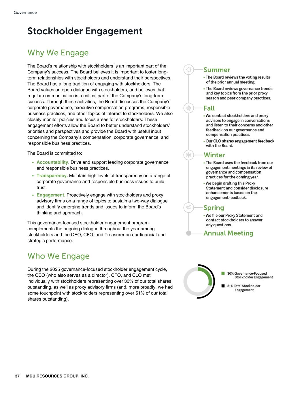 Stockholder Engagement Why We Engage The Board’s relationship with stockholders is an important part of the Company’s success. The Board believes it is important to foster long- term relationships with stockholders and understand their perspectives. The Board has a long tradition of engaging with stockholders. The Board values an open dialogue with stockholders, and believes that regular communication is a critical part of the Company’s long-term success. Through these activities, the Board discusses the Company’s corporate governance, executive compensation programs, responsible business practices, and other topics of interest to stockholders. We also closely monitor policies and focus areas for stockholders. These engagement efforts allow the Board to better understand stockholders’ priorities and perspectives and provide the Board with useful input concerning the Company’s compensation, corporate governance, and responsible business practices. The Board is committed to: • Accountability. Drive and support leading corporate governance and responsible business practices. • Transparency. Maintain high levels of transparency on a range of corporate governance and responsible business issues to build trust. • Engagement. Proactively engage with stockholders and proxy advisory firms on a range of topics to sustain a two-way dialogue and identify emerging trends and issues to inform the Board’s thinking and approach. This governance-focused stockholder engagement program complements the ongoing dialogue throughout the year among stockholders and the CEO, CFO, and Treasurer on our financial and strategic performance. Who We Engage During the 2025 governance-focused stockholder engagement cycle, the CEO (who also serves as a director), CFO, and CLO met individually with stockholders representing over 30% of our total shares outstanding, as well as proxy advisory firms (and, more broadly, we had some touchpoint with stockholders representing over 51% of our total shares outstanding). Governance 37 MDU RESOURCES GROUP, INC.
