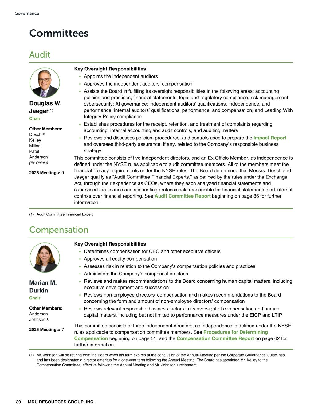 Committees Audit Douglas W. Jaeger(1) Chair Other Members: Dosch(1) Kelley Miller Patel Anderson (Ex Officio) 2025 Meetings: 9 Key Oversight Responsibilities • Appoints the independent auditors • Approves the independent auditors’ compensation • Assists the Board in fulfilling its oversight responsibilities in the following areas: accounting policies and practices; financial statements; legal and regulatory compliance; risk management; cybersecurity; AI governance; independent auditors’ qualifications, independence, and performance; internal auditors’ qualifications, performance, and compensation; and Leading With Integrity Policy compliance • Establishes procedures for the receipt, retention, and treatment of complaints regarding accounting, internal accounting and audit controls, and auditing matters • Reviews and discusses policies, procedures, and controls used to prepare the Impact Report and oversees third-party assurance, if any, related to the Company’s responsible business strategy This committee consists of five independent directors, and an Ex Officio Member, as independence is defined under the NYSE rules applicable to audit committee members. All of the members meet the financial literacy requirements under the NYSE rules. The Board determined that Messrs. Dosch and Jaeger qualify as “Audit Committee Financial Experts,” as defined by the rules under the Exchange Act, through their experience as CEOs, where they each analyzed financial statements and supervised the finance and accounting professionals responsible for financial statements and internal controls over financial reporting. See Audit Committee Report beginning on page 86 for further information. (1) Audit Committee Financial Expert Compensation Marian M. Durkin Chair Other Members: Anderson Johnson(1) 2025 Meetings: 7 Key Oversight Responsibilities • Determines compensation for CEO and other executive officers • Approves all equity compensation • Assesses risk in relation to the Company’s compensation policies and practices • Administers the Company’s compensation plans • Reviews and makes recommendations to the Board concerning human capital matters, including executive development and succession • Reviews non-employee directors’ compensation and makes recommendations to the Board concerning the form and amount of non-employee directors’ compensation • Reviews relevant responsible business factors in its oversight of compensation and human capital matters, including but not limited to performance measures under the EICP and LTIP This committee consists of three independent directors, as independence is defined under the NYSE rules applicable to compensation committee members. See Procedures for Determining Compensation beginning on page 51, and the Compensation Committee Report on page 62 for further information. (1) Mr. Johnson will be retiring from the Board when his term expires at the conclusion of the Annual Meeting per the Corporate Governance Guidelines, and has been designated a director emeritus for a one-year term following the Annual Meeting. The Board has appointed Mr. Kelley to the Compensation Committee, effective following the Annual Meeting and Mr. Johnson’s retirement. Governance 39 MDU RESOURCES GROUP, INC.