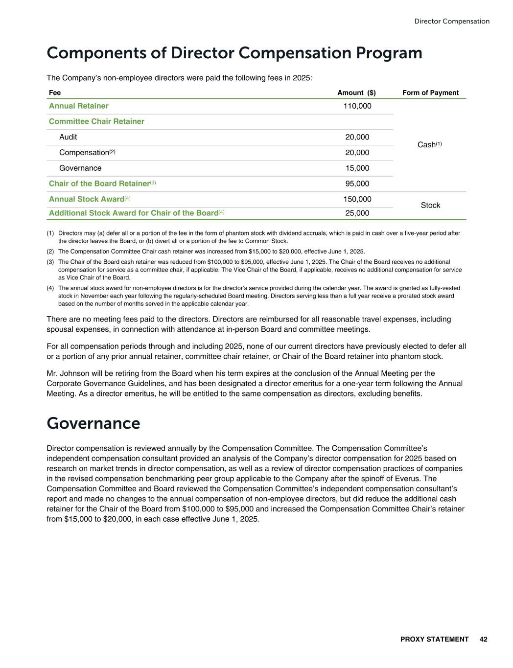 Components of Director Compensation Program The Company’s non-employee directors were paid the following fees in 2025: Fee Amount ($) Form of Payment Annual Retainer 110,000 Cash(1) Committee Chair Retainer Audit 20,000 Compensation(2) 20,000 Governance 15,000 Chair of the Board Retainer(3) 95,000 Annual Stock Award(4) 150,000 Stock Additional Stock Award for Chair of the Board(4) 25,000 (1) Directors may (a) defer all or a portion of the fee in the form of phantom stock with dividend accruals, which is paid in cash over a five-year period after the director leaves the Board, or (b) divert all or a portion of the fee to Common Stock. (2) The Compensation Committee Chair cash retainer was increased from $15,000 to $20,000, effective June 1, 2025. (3) The Chair of the Board cash retainer was reduced from $100,000 to $95,000, effective June 1, 2025. The Chair of the Board receives no additional compensation for service as a committee chair, if applicable. The Vice Chair of the Board, if applicable, receives no additional compensation for service as Vice Chair of the Board. (4) The annual stock award for non-employee directors is for the director’s service provided during the calendar year. The award is granted as fully-vested stock in November each year following the regularly-scheduled Board meeting. Directors serving less than a full year receive a prorated stock award based on the number of months served in the applicable calendar year. There are no meeting fees paid to the directors. Directors are reimbursed for all reasonable travel expenses, including spousal expenses, in connection with attendance at in-person Board and committee meetings. For all compensation periods through and including 2025, none of our current directors have previously elected to defer all or a portion of any prior annual retainer, committee chair retainer, or Chair of the Board retainer into phantom stock. Mr. Johnson will be retiring from the Board when his term expires at the conclusion of the Annual Meeting per the Corporate Governance Guidelines, and has been designated a director emeritus for a one-year term following the Annual Meeting. As a director emeritus, he will be entitled to the same compensation as directors, excluding benefits. Governance Director compensation is reviewed annually by the Compensation Committee. The Compensation Committee’s independent compensation consultant provided an analysis of the Company’s director compensation for 2025 based on research on market trends in director compensation, as well as a review of director compensation practices of companies in the revised compensation benchmarking peer group applicable to the Company after the spinoff of Everus. The Compensation Committee and Board reviewed the Compensation Committee’s independent compensation consultant’s report and made no changes to the annual compensation of non-employee directors, but did reduce the additional cash retainer for the Chair of the Board from $100,000 to $95,000 and increased the Compensation Committee Chair’s retainer from $15,000 to $20,000, in each case effective June 1, 2025. Director Compensation PROXY STATEMENT 42