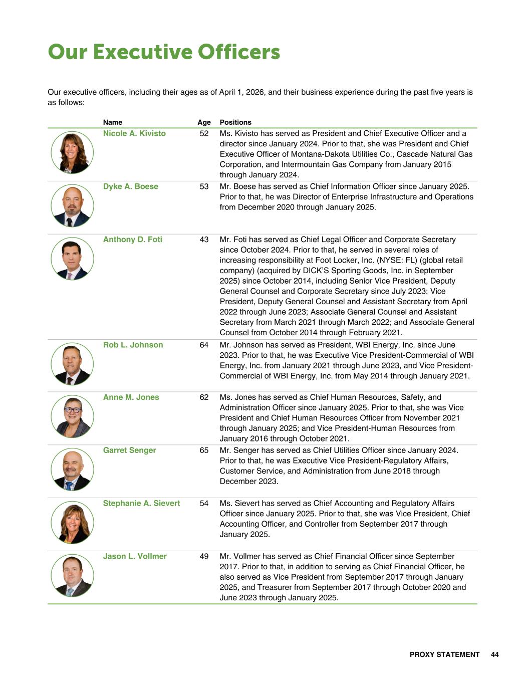 Our Executive Officers Our executive officers, including their ages as of April 1, 2026, and their business experience during the past five years is as follows: Name Age Positions Nicole A. Kivisto 52 Ms. Kivisto has served as President and Chief Executive Officer and a director since January 2024. Prior to that, she was President and Chief Executive Officer of Montana-Dakota Utilities Co., Cascade Natural Gas Corporation, and Intermountain Gas Company from January 2015 through January 2024. Dyke A. Boese 53 Mr. Boese has served as Chief Information Officer since January 2025. Prior to that, he was Director of Enterprise Infrastructure and Operations from December 2020 through January 2025. Anthony D. Foti 43 Mr. Foti has served as Chief Legal Officer and Corporate Secretary since October 2024. Prior to that, he served in several roles of increasing responsibility at Foot Locker, Inc. (NYSE: FL) (global retail company) (acquired by DICK’S Sporting Goods, Inc. in September 2025) since October 2014, including Senior Vice President, Deputy General Counsel and Corporate Secretary since July 2023; Vice President, Deputy General Counsel and Assistant Secretary from April 2022 through June 2023; Associate General Counsel and Assistant Secretary from March 2021 through March 2022; and Associate General Counsel from October 2014 through February 2021. Rob L. Johnson 64 Mr. Johnson has served as President, WBI Energy, Inc. since June 2023. Prior to that, he was Executive Vice President-Commercial of WBI Energy, Inc. from January 2021 through June 2023, and Vice President- Commercial of WBI Energy, Inc. from May 2014 through January 2021. Anne M. Jones 62 Ms. Jones has served as Chief Human Resources, Safety, and Administration Officer since January 2025. Prior to that, she was Vice President and Chief Human Resources Officer from November 2021 through January 2025; and Vice President-Human Resources from January 2016 through October 2021. Garret Senger 65 Mr. Senger has served as Chief Utilities Officer since January 2024. Prior to that, he was Executive Vice President-Regulatory Affairs, Customer Service, and Administration from June 2018 through December 2023. Stephanie A. Sievert 54 Ms. Sievert has served as Chief Accounting and Regulatory Affairs Officer since January 2025. Prior to that, she was Vice President, Chief Accounting Officer, and Controller from September 2017 through January 2025. Jason L. Vollmer 49 Mr. Vollmer has served as Chief Financial Officer since September 2017. Prior to that, in addition to serving as Chief Financial Officer, he also served as Vice President from September 2017 through January 2025, and Treasurer from September 2017 through October 2020 and June 2023 through January 2025. PROXY STATEMENT 44