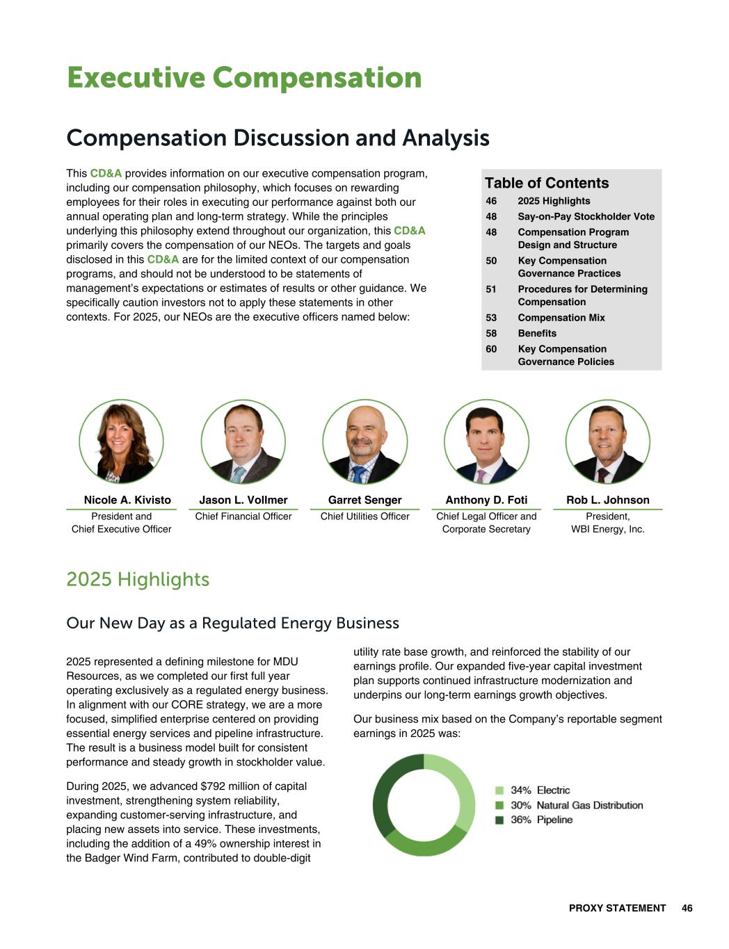 Executive Compensation Compensation Discussion and Analysis This CD&A provides information on our executive compensation program, including our compensation philosophy, which focuses on rewarding employees for their roles in executing our performance against both our annual operating plan and long-term strategy. While the principles underlying this philosophy extend throughout our organization, this CD&A primarily covers the compensation of our NEOs. The targets and goals disclosed in this CD&A are for the limited context of our compensation programs, and should not be understood to be statements of management’s expectations or estimates of results or other guidance. We specifically caution investors not to apply these statements in other contexts. For 2025, our NEOs are the executive officers named below: Table of Contents 46 2025 Highlights 48 Say-on-Pay Stockholder Vote 48 Compensation Program Design and Structure 50 Key Compensation Governance Practices 51 Procedures for Determining Compensation 53 Compensation Mix 58 Benefits 60 Key Compensation Governance Policies Nicole A. Kivisto Jason L. Vollmer Garret Senger Anthony D. Foti Rob L. Johnson President and Chief Executive Officer Chief Financial Officer Chief Utilities Officer Chief Legal Officer and Corporate Secretary President, WBI Energy, Inc. 2025 Highlights Our New Day as a Regulated Energy Business 2025 represented a defining milestone for MDU Resources, as we completed our first full year operating exclusively as a regulated energy business. In alignment with our CORE strategy, we are a more focused, simplified enterprise centered on providing essential energy services and pipeline infrastructure. The result is a business model built for consistent performance and steady growth in stockholder value. During 2025, we advanced $792 million of capital investment, strengthening system reliability, expanding customer-serving infrastructure, and placing new assets into service. These investments, including the addition of a 49% ownership interest in the Badger Wind Farm, contributed to double-digit utility rate base growth, and reinforced the stability of our earnings profile. Our expanded five-year capital investment plan supports continued infrastructure modernization and underpins our long-term earnings growth objectives. Our business mix based on the Company’s reportable segment earnings in 2025 was: PROXY STATEMENT 46