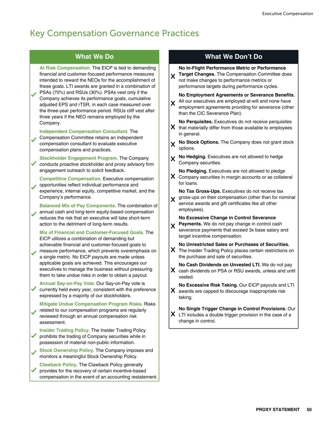 Key Compensation Governance Practices What We Do At Risk Compensation. The EICP is tied to demanding financial and customer-focused performance measures intended to reward the NEOs for the accomplishment of these goals. LTI awards are granted in a combination of PSAs (70%) and RSUs (30%). PSAs vest only if the Company achieves its performance goals, cumulative adjusted EPS and rTSR, in each case measured over the three-year performance period. RSUs cliff vest after three years if the NEO remains employed by the Company. Independent Compensation Consultant. The Compensation Committee retains an independent compensation consultant to evaluate executive compensation plans and practices. Stockholder Engagement Program. The Company conducts proactive stockholder and proxy advisory firm engagement outreach to solicit feedback. Competitive Compensation. Executive compensation opportunities reflect individual performance and experience, internal equity, competitive market, and the Company’s performance. Balanced Mix of Pay Components. The combination of annual cash and long-term equity-based compensation reduces the risk that an executive will take short-term action to the detriment of long-term results. Mix of Financial and Customer-Focused Goals. The EICP utilizes a combination of demanding but achievable financial and customer-focused goals to measure performance, which prevents overemphasis on a single metric. No EICP payouts are made unless applicable goals are achieved. This encourages our executives to manage the business without pressuring them to take undue risks in order to obtain a payout. Annual Say-on-Pay Vote. Our Say-on-Pay vote is currently held every year, consistent with the preference expressed by a majority of our stockholders. Mitigate Undue Compensation Program Risks. Risks related to our compensation programs are regularly reviewed through an annual compensation risk assessment. Insider Trading Policy. The Insider Trading Policy prohibits the trading of Company securities while in possession of material non-public information. Stock Ownership Policy. The Company imposes and monitors a meaningful Stock Ownership Policy. Clawback Policy. The Clawback Policy generally provides for the recovery of certain incentive-based compensation in the event of an accounting restatement. What We Don’t Do No In-Flight Performance Metric or Performance Target Changes. The Compensation Committee does not make changes to performance metrics or performance targets during performance cycles. No Employment Agreements or Severance Benefits. All our executives are employed at-will and none have employment agreements providing for severance (other than the CIC Severance Plan). No Perquisites. Executives do not receive perquisites that materially differ from those available to employees in general. No Stock Options. The Company does not grant stock options. No Hedging. Executives are not allowed to hedge Company securities. No Pledging. Executives are not allowed to pledge Company securities in margin accounts or as collateral for loans. No Tax Gross-Ups. Executives do not receive tax gross-ups on their compensation (other than for nominal service awards and gift certificates like all other employees). No Excessive Change in Control Severance Payments. We do not pay change in control cash severance payments that exceed 3x base salary and target incentive compensation. No Unrestricted Sales or Purchases of Securities. The Insider Trading Policy places certain restrictions on the purchase and sale of securities. No Cash Dividends on Unvested LTI. We do not pay cash dividends on PSA or RSU awards, unless and until vested. No Excessive Risk Taking. Our EICP payouts and LTI awards are capped to discourage inappropriate risk taking. No Single Trigger Change in Control Provisions. Our LTI includes a double trigger provision in the case of a change in control. Executive Compensation PROXY STATEMENT 50