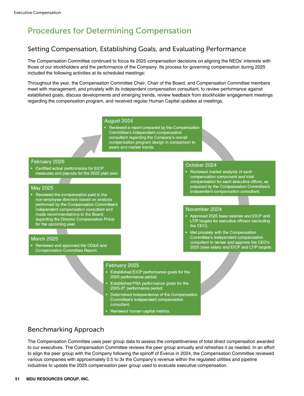 Procedures for Determining Compensation Setting Compensation, Establishing Goals, and Evaluating Performance The Compensation Committee continued to focus its 2025 compensation decisions on aligning the NEOs’ interests with those of our stockholders and the performance of the Company. Its process for governing compensation during 2025 included the following activities at its scheduled meetings: Throughout the year, the Compensation Committee Chair, Chair of the Board, and Compensation Committee members meet with management, and privately with its independent compensation consultant, to review performance against established goals, discuss developments and emerging trends, review feedback from stockholder engagement meetings regarding the compensation program, and received regular Human Capital updates at meetings. Benchmarking Approach The Compensation Committee uses peer group data to assess the competitiveness of total direct compensation awarded to our executives. The Compensation Committee reviews the peer group annually and refreshes it as needed. In an effort to align the peer group with the Company following the spinoff of Everus in 2024, the Compensation Committee reviewed various companies with approximately 0.5 to 3x the Company’s revenue within the regulated utilities and pipeline industries to update the 2025 compensation peer group used to evaluate executive compensation. Executive Compensation 51 MDU RESOURCES GROUP, INC.