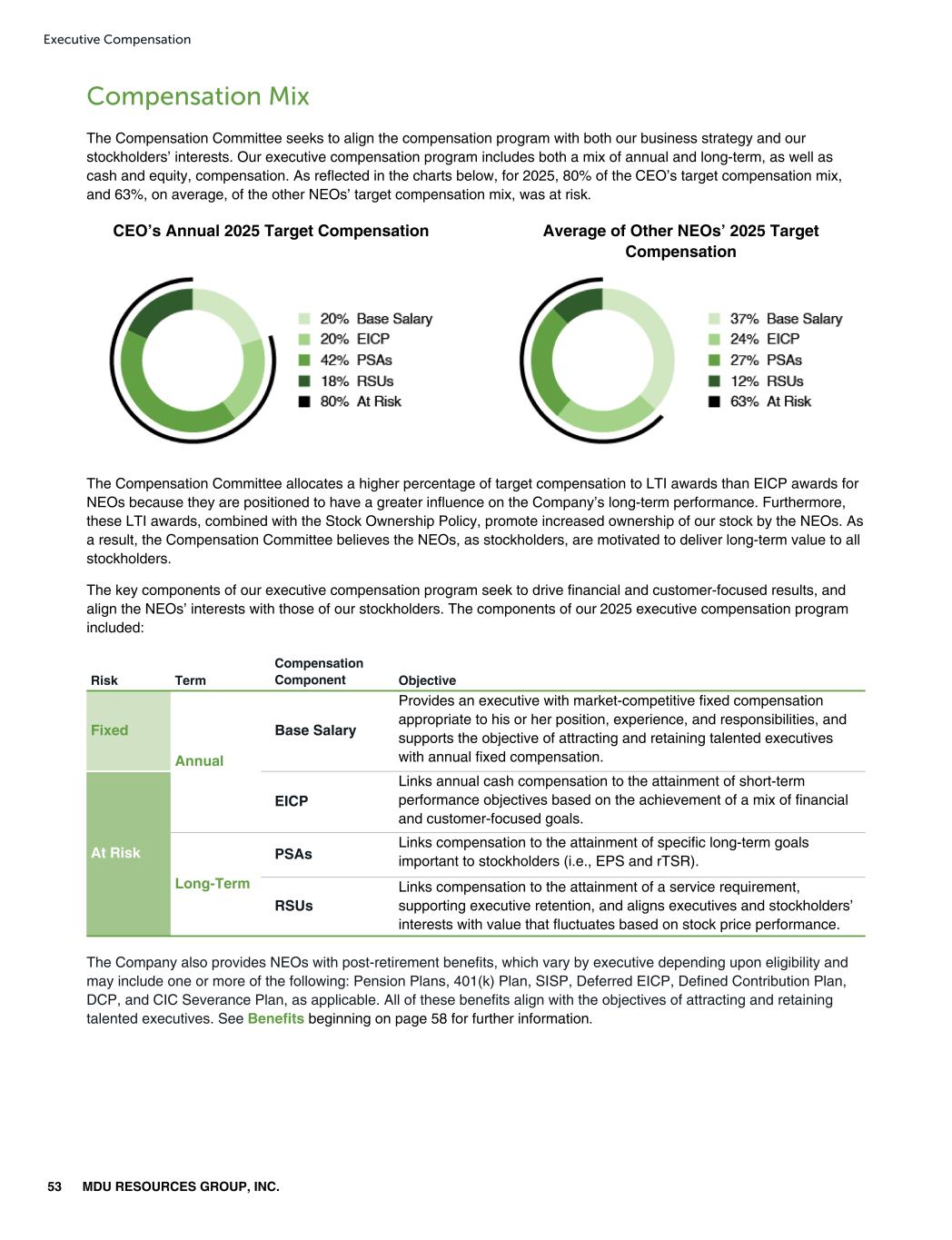 Compensation Mix The Compensation Committee seeks to align the compensation program with both our business strategy and our stockholders’ interests. Our executive compensation program includes both a mix of annual and long-term, as well as cash and equity, compensation. As reflected in the charts below, for 2025, 80% of the CEO’s target compensation mix, and 63%, on average, of the other NEOs’ target compensation mix, was at risk. CEO’s Annual 2025 Target Compensation Average of Other NEOs’ 2025 Target Compensation The Compensation Committee allocates a higher percentage of target compensation to LTI awards than EICP awards for NEOs because they are positioned to have a greater influence on the Company’s long-term performance. Furthermore, these LTI awards, combined with the Stock Ownership Policy, promote increased ownership of our stock by the NEOs. As a result, the Compensation Committee believes the NEOs, as stockholders, are motivated to deliver long-term value to all stockholders. The key components of our executive compensation program seek to drive financial and customer-focused results, and align the NEOs’ interests with those of our stockholders. The components of our 2025 executive compensation program included: Risk Term Compensation Component Objective Fixed Annual Base Salary Provides an executive with market-competitive fixed compensation appropriate to his or her position, experience, and responsibilities, and supports the objective of attracting and retaining talented executives with annual fixed compensation. At Risk EICP Links annual cash compensation to the attainment of short-term performance objectives based on the achievement of a mix of financial and customer-focused goals. Long-Term PSAs Links compensation to the attainment of specific long-term goals important to stockholders (i.e., EPS and rTSR). RSUs Links compensation to the attainment of a service requirement, supporting executive retention, and aligns executives and stockholders’ interests with value that fluctuates based on stock price performance. The Company also provides NEOs with post-retirement benefits, which vary by executive depending upon eligibility and may include one or more of the following: Pension Plans, 401(k) Plan, SISP, Deferred EICP, Defined Contribution Plan, DCP, and CIC Severance Plan, as applicable. All of these benefits align with the objectives of attracting and retaining talented executives. See Benefits beginning on page 58 for further information. Executive Compensation 53 MDU RESOURCES GROUP, INC.