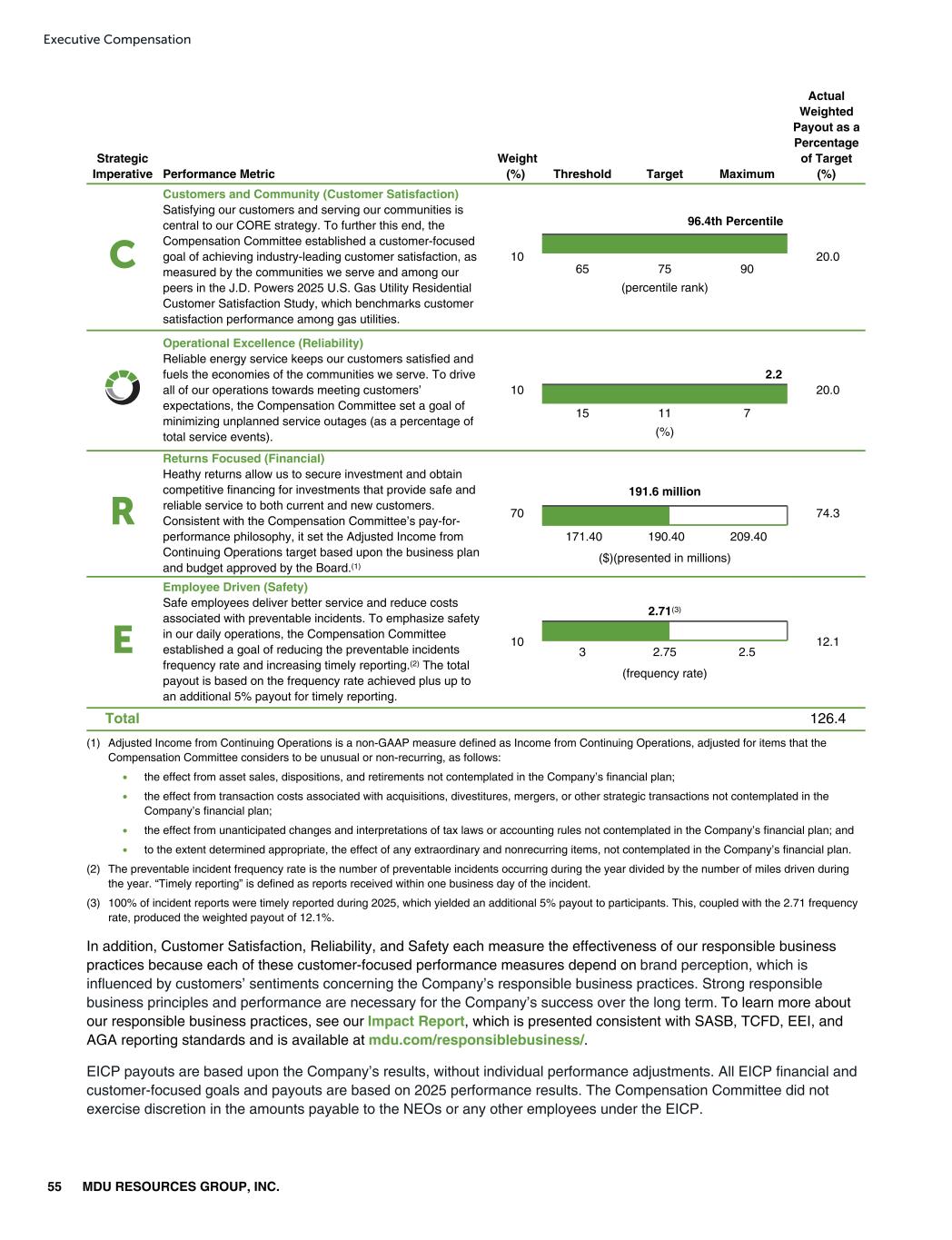 Strategic Imperative Performance Metric Weight (%) Threshold Target Maximum Actual Weighted Payout as a Percentage of Target (%) C Customers and Community (Customer Satisfaction) Satisfying our customers and serving our communities is central to our CORE strategy. To further this end, the Compensation Committee established a customer-focused goal of achieving industry-leading customer satisfaction, as measured by the communities we serve and among our peers in the J.D. Powers 2025 U.S. Gas Utility Residential Customer Satisfaction Study, which benchmarks customer satisfaction performance among gas utilities. 10 20.0 96.4th Percentile 65 75 90 (percentile rank) Operational Excellence (Reliability) Reliable energy service keeps our customers satisfied and fuels the economies of the communities we serve. To drive all of our operations towards meeting customers’ expectations, the Compensation Committee set a goal of minimizing unplanned service outages (as a percentage of total service events). 10 20.0 2.2 15 11 7 (%) R Returns Focused (Financial) Heathy returns allow us to secure investment and obtain competitive financing for investments that provide safe and reliable service to both current and new customers. Consistent with the Compensation Committee’s pay-for- performance philosophy, it set the Adjusted Income from Continuing Operations target based upon the business plan and budget approved by the Board.(1) 70 74.3 191.6 million 171.40 190.40 209.40 ($)(presented in millions) E Employee Driven (Safety) Safe employees deliver better service and reduce costs associated with preventable incidents. To emphasize safety in our daily operations, the Compensation Committee established a goal of reducing the preventable incidents frequency rate and increasing timely reporting.(2) The total payout is based on the frequency rate achieved plus up to an additional 5% payout for timely reporting. 10 12.1 2.71(3) 3 2.75 2.5 (frequency rate) Total 126.4 (1) Adjusted Income from Continuing Operations is a non-GAAP measure defined as Income from Continuing Operations, adjusted for items that the Compensation Committee considers to be unusual or non-recurring, as follows: • the effect from asset sales, dispositions, and retirements not contemplated in the Company’s financial plan; • the effect from transaction costs associated with acquisitions, divestitures, mergers, or other strategic transactions not contemplated in the Company’s financial plan; • the effect from unanticipated changes and interpretations of tax laws or accounting rules not contemplated in the Company’s financial plan; and • to the extent determined appropriate, the effect of any extraordinary and nonrecurring items, not contemplated in the Company’s financial plan. (2) The preventable incident frequency rate is the number of preventable incidents occurring during the year divided by the number of miles driven during the year. “Timely reporting” is defined as reports received within one business day of the incident. (3) 100% of incident reports were timely reported during 2025, which yielded an additional 5% payout to participants. This, coupled with the 2.71 frequency rate, produced the weighted payout of 12.1%. In addition, Customer Satisfaction, Reliability, and Safety each measure the effectiveness of our responsible business practices because each of these customer-focused performance measures depend on brand perception, which is influenced by customers’ sentiments concerning the Company’s responsible business practices. Strong responsible business principles and performance are necessary for the Company’s success over the long term. To learn more about our responsible business practices, see our Impact Report, which is presented consistent with SASB, TCFD, EEI, and AGA reporting standards and is available at mdu.com/responsiblebusiness/. EICP payouts are based upon the Company’s results, without individual performance adjustments. All EICP financial and customer-focused goals and payouts are based on 2025 performance results. The Compensation Committee did not exercise discretion in the amounts payable to the NEOs or any other employees under the EICP. Executive Compensation 55 MDU RESOURCES GROUP, INC.