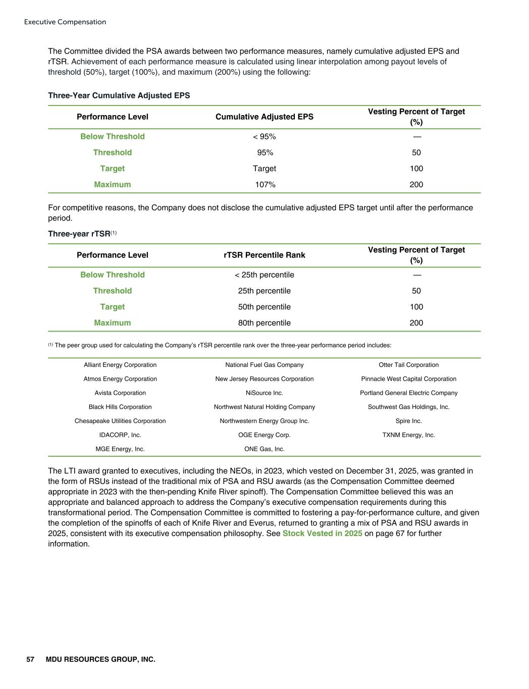 The Committee divided the PSA awards between two performance measures, namely cumulative adjusted EPS and rTSR. Achievement of each performance measure is calculated using linear interpolation among payout levels of threshold (50%), target (100%), and maximum (200%) using the following: Three-Year Cumulative Adjusted EPS Performance Level Cumulative Adjusted EPS Vesting Percent of Target (%) Below Threshold < 95% — Threshold 95% 50 Target Target 100 Maximum 107% 200 For competitive reasons, the Company does not disclose the cumulative adjusted EPS target until after the performance period. Three-year rTSR(1) Performance Level rTSR Percentile Rank Vesting Percent of Target (%) Below Threshold < 25th percentile — Threshold 25th percentile 50 Target 50th percentile 100 Maximum 80th percentile 200 (1) The peer group used for calculating the Company’s rTSR percentile rank over the three-year performance period includes: Alliant Energy Corporation National Fuel Gas Company Otter Tail Corporation Atmos Energy Corporation New Jersey Resources Corporation Pinnacle West Capital Corporation Avista Corporation NiSource Inc. Portland General Electric Company Black Hills Corporation Northwest Natural Holding Company Southwest Gas Holdings, Inc. Chesapeake Utilities Corporation Northwestern Energy Group Inc. Spire Inc. IDACORP, Inc. OGE Energy Corp. TXNM Energy, Inc. MGE Energy, Inc. ONE Gas, Inc. The LTI award granted to executives, including the NEOs, in 2023, which vested on December 31, 2025, was granted in the form of RSUs instead of the traditional mix of PSA and RSU awards (as the Compensation Committee deemed appropriate in 2023 with the then-pending Knife River spinoff). The Compensation Committee believed this was an appropriate and balanced approach to address the Company’s executive compensation requirements during this transformational period. The Compensation Committee is committed to fostering a pay-for-performance culture, and given the completion of the spinoffs of each of Knife River and Everus, returned to granting a mix of PSA and RSU awards in 2025, consistent with its executive compensation philosophy. See Stock Vested in 2025 on page 67 for further information. Executive Compensation 57 MDU RESOURCES GROUP, INC.