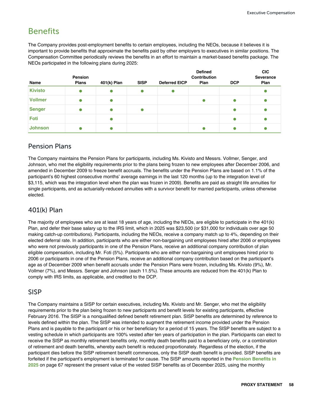 Benefits The Company provides post-employment benefits to certain employees, including the NEOs, because it believes it is important to provide benefits that approximate the benefits paid by other employers to executives in similar positions. The Compensation Committee periodically reviews the benefits in an effort to maintain a market-based benefits package. The NEOs participated in the following plans during 2025: Name Pension Plans 401(k) Plan SISP Deferred EICP Defined Contribution Plan DCP CIC Severance Plan Kivisto l l l l l Vollmer l l l l l Senger l l l l l Foti l l l Johnson l l l l l Pension Plans The Company maintains the Pension Plans for participants, including Ms. Kivisto and Messrs. Vollmer, Senger, and Johnson, who met the eligibility requirements prior to the plans being frozen to new employees after December 2006, and amended in December 2009 to freeze benefit accruals. The benefits under the Pension Plans are based on 1.1% of the participant’s 60 highest consecutive months’ average earnings in the last 120 months (up to the integration level of $3,115, which was the integration level when the plan was frozen in 2009). Benefits are paid as straight life annuities for single participants, and as actuarially-reduced annuities with a survivor benefit for married participants, unless otherwise elected. 401(k) Plan The majority of employees who are at least 18 years of age, including the NEOs, are eligible to participate in the 401(k) Plan, and defer their base salary up to the IRS limit, which in 2025 was $23,500 (or $31,000 for individuals over age 50 making catch-up contributions). Participants, including the NEOs, receive a company match up to 4%, depending on their elected deferral rate. In addition, participants who are either non-bargaining unit employees hired after 2006 or employees who were not previously participants in one of the Pension Plans, receive an additional company contribution of plan eligible compensation, including Mr. Foti (5%). Participants who are either non-bargaining unit employees hired prior to 2006 or participants in one of the Pension Plans, receive an additional company contribution based on the participant’s age as of December 2009 when benefit accruals under the Pension Plans were frozen, including Ms. Kivisto (9%), Mr. Vollmer (7%), and Messrs. Senger and Johnson (each 11.5%). These amounts are reduced from the 401(k) Plan to comply with IRS limits, as applicable, and credited to the DCP. SISP The Company maintains a SISP for certain executives, including Ms. Kivisto and Mr. Senger, who met the eligibility requirements prior to the plan being frozen to new participants and benefit levels for existing participants, effective February 2016. The SISP is a nonqualified defined benefit retirement plan. SISP benefits are determined by reference to levels defined within the plan. The SISP was intended to augment the retirement income provided under the Pension Plans and is payable to the participant or his or her beneficiary for a period of 15 years. The SISP benefits are subject to a vesting schedule in which participants are 100% vested after ten years of participation in the plan. Participants can elect to receive the SISP as monthly retirement benefits only, monthly death benefits paid to a beneficiary only, or a combination of retirement and death benefits, whereby each benefit is reduced proportionately. Regardless of the election, if the participant dies before the SISP retirement benefit commences, only the SISP death benefit is provided. SISP benefits are forfeited if the participant’s employment is terminated for cause. The SISP amounts reported in the Pension Benefits in 2025 on page 67 represent the present value of the vested SISP benefits as of December 2025, using the monthly Executive Compensation PROXY STATEMENT 58