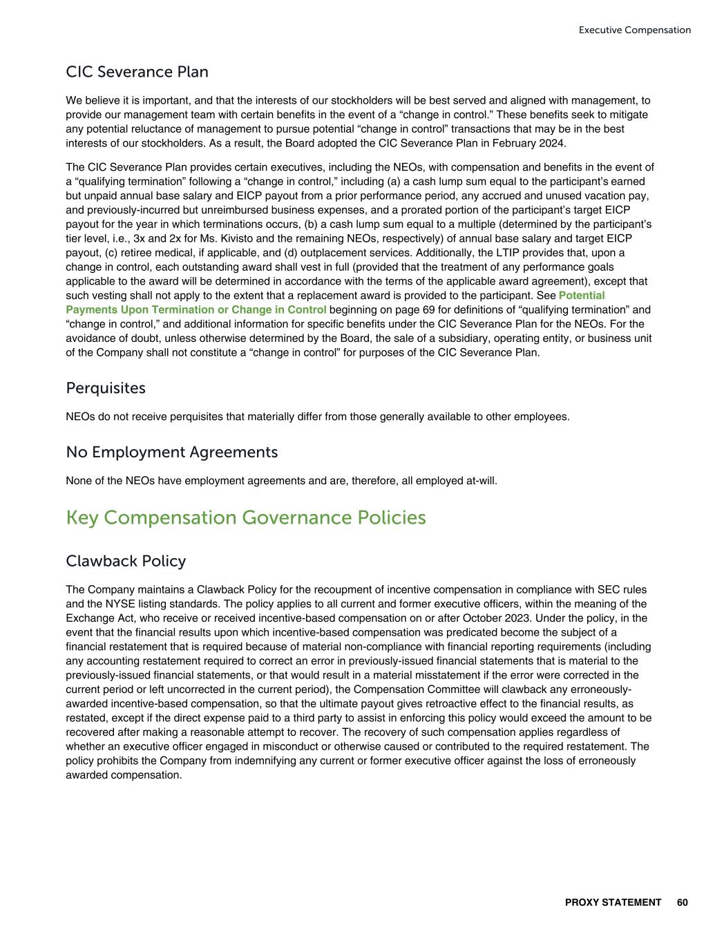 CIC Severance Plan We believe it is important, and that the interests of our stockholders will be best served and aligned with management, to provide our management team with certain benefits in the event of a “change in control.” These benefits seek to mitigate any potential reluctance of management to pursue potential “change in control” transactions that may be in the best interests of our stockholders. As a result, the Board adopted the CIC Severance Plan in February 2024. The CIC Severance Plan provides certain executives, including the NEOs, with compensation and benefits in the event of a “qualifying termination” following a “change in control,” including (a) a cash lump sum equal to the participant’s earned but unpaid annual base salary and EICP payout from a prior performance period, any accrued and unused vacation pay, and previously-incurred but unreimbursed business expenses, and a prorated portion of the participant’s target EICP payout for the year in which terminations occurs, (b) a cash lump sum equal to a multiple (determined by the participant’s tier level, i.e., 3x and 2x for Ms. Kivisto and the remaining NEOs, respectively) of annual base salary and target EICP payout, (c) retiree medical, if applicable, and (d) outplacement services. Additionally, the LTIP provides that, upon a change in control, each outstanding award shall vest in full (provided that the treatment of any performance goals applicable to the award will be determined in accordance with the terms of the applicable award agreement), except that such vesting shall not apply to the extent that a replacement award is provided to the participant. See Potential Payments Upon Termination or Change in Control beginning on page 69 for definitions of “qualifying termination” and “change in control,” and additional information for specific benefits under the CIC Severance Plan for the NEOs. For the avoidance of doubt, unless otherwise determined by the Board, the sale of a subsidiary, operating entity, or business unit of the Company shall not constitute a “change in control” for purposes of the CIC Severance Plan. Perquisites NEOs do not receive perquisites that materially differ from those generally available to other employees. No Employment Agreements None of the NEOs have employment agreements and are, therefore, all employed at-will. Key Compensation Governance Policies Clawback Policy The Company maintains a Clawback Policy for the recoupment of incentive compensation in compliance with SEC rules and the NYSE listing standards. The policy applies to all current and former executive officers, within the meaning of the Exchange Act, who receive or received incentive-based compensation on or after October 2023. Under the policy, in the event that the financial results upon which incentive-based compensation was predicated become the subject of a financial restatement that is required because of material non-compliance with financial reporting requirements (including any accounting restatement required to correct an error in previously-issued financial statements that is material to the previously-issued financial statements, or that would result in a material misstatement if the error were corrected in the current period or left uncorrected in the current period), the Compensation Committee will clawback any erroneously- awarded incentive-based compensation, so that the ultimate payout gives retroactive effect to the financial results, as restated, except if the direct expense paid to a third party to assist in enforcing this policy would exceed the amount to be recovered after making a reasonable attempt to recover. The recovery of such compensation applies regardless of whether an executive officer engaged in misconduct or otherwise caused or contributed to the required restatement. The policy prohibits the Company from indemnifying any current or former executive officer against the loss of erroneously awarded compensation. Executive Compensation PROXY STATEMENT 60