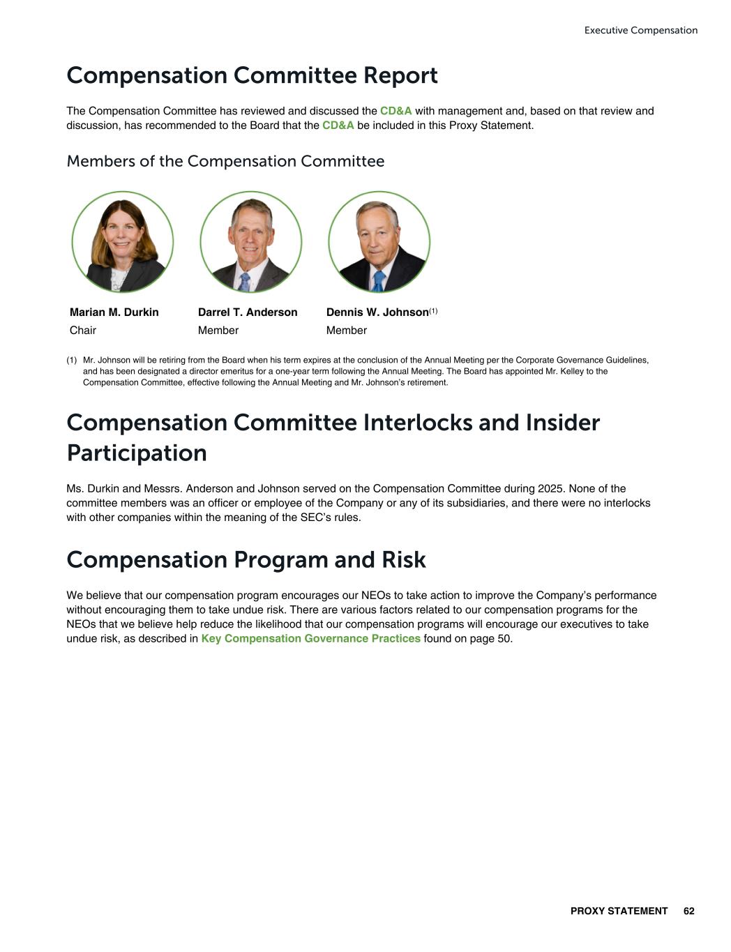 Compensation Committee Report The Compensation Committee has reviewed and discussed the CD&A with management and, based on that review and discussion, has recommended to the Board that the CD&A be included in this Proxy Statement. Members of the Compensation Committee Marian M. Durkin Chair Darrel T. Anderson Member Dennis W. Johnson(1) Member (1) Mr. Johnson will be retiring from the Board when his term expires at the conclusion of the Annual Meeting per the Corporate Governance Guidelines, and has been designated a director emeritus for a one-year term following the Annual Meeting. The Board has appointed Mr. Kelley to the Compensation Committee, effective following the Annual Meeting and Mr. Johnson’s retirement. Compensation Committee Interlocks and Insider Participation Ms. Durkin and Messrs. Anderson and Johnson served on the Compensation Committee during 2025. None of the committee members was an officer or employee of the Company or any of its subsidiaries, and there were no interlocks with other companies within the meaning of the SEC’s rules. Compensation Program and Risk We believe that our compensation program encourages our NEOs to take action to improve the Company’s performance without encouraging them to take undue risk. There are various factors related to our compensation programs for the NEOs that we believe help reduce the likelihood that our compensation programs will encourage our executives to take undue risk, as described in Key Compensation Governance Practices found on page 50. Executive Compensation PROXY STATEMENT 62