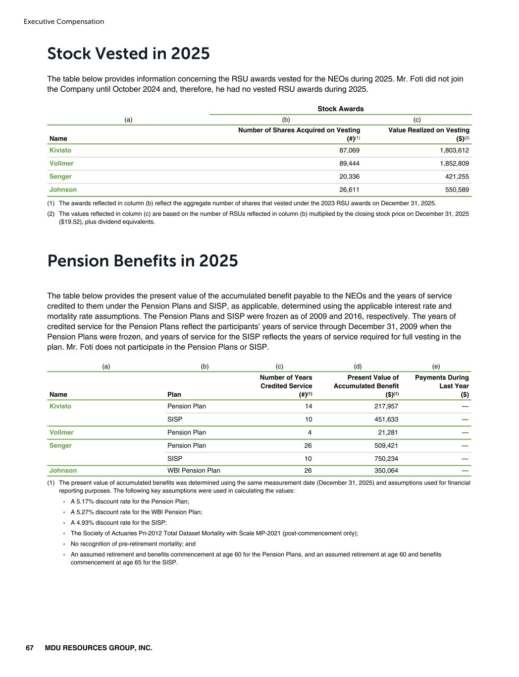 Stock Vested in 2025 The table below provides information concerning the RSU awards vested for the NEOs during 2025. Mr. Foti did not join the Company until October 2024 and, therefore, he had no vested RSU awards during 2025. Stock Awards (a) (b) (c) Name Number of Shares Acquired on Vesting (#)(1) Value Realized on Vesting ($)(2) Kivisto 87,069 1,803,612 Vollmer 89,444 1,852,809 Senger 20,336 421,255 Johnson 26,611 550,589 (1) The awards reflected in column (b) reflect the aggregate number of shares that vested under the 2023 RSU awards on December 31, 2025. (2) The values reflected in column (c) are based on the number of RSUs reflected in column (b) multiplied by the closing stock price on December 31, 2025 ($19.52), plus dividend equivalents. Pension Benefits in 2025 The table below provides the present value of the accumulated benefit payable to the NEOs and the years of service credited to them under the Pension Plans and SISP, as applicable, determined using the applicable interest rate and mortality rate assumptions. The Pension Plans and SISP were frozen as of 2009 and 2016, respectively. The years of credited service for the Pension Plans reflect the participants’ years of service through December 31, 2009 when the Pension Plans were frozen, and years of service for the SISP reflects the years of service required for full vesting in the plan. Mr. Foti does not participate in the Pension Plans or SISP. (a) (b) (c) (d) (e) Name Plan Number of Years Credited Service (#)(1) Present Value of Accumulated Benefit ($)(1) Payments During Last Year ($) Kivisto Pension Plan 14 217,957 — SISP 10 451,633 — Vollmer Pension Plan 4 21,281 — Senger Pension Plan 26 509,421 — SISP 10 750,234 — Johnson WBI Pension Plan 26 350,064 — (1) The present value of accumulated benefits was determined using the same measurement date (December 31, 2025) and assumptions used for financial reporting purposes. The following key assumptions were used in calculating the values: • A 5.17% discount rate for the Pension Plan; • A 5.27% discount rate for the WBI Pension Plan; • A 4.93% discount rate for the SISP; • The Society of Actuaries Pri-2012 Total Dataset Mortality with Scale MP-2021 (post-commencement only); • No recognition of pre-retirement mortality; and • An assumed retirement and benefits commencement at age 60 for the Pension Plans, and an assumed retirement at age 60 and benefits commencement at age 65 for the SISP. Executive Compensation 67 MDU RESOURCES GROUP, INC.