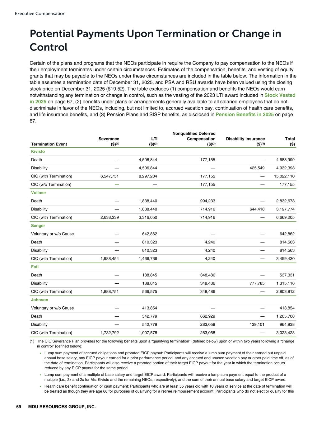Potential Payments Upon Termination or Change in Control Certain of the plans and programs that the NEOs participate in require the Company to pay compensation to the NEOs if their employment terminates under certain circumstances. Estimates of the compensation, benefits, and vesting of equity grants that may be payable to the NEOs under these circumstances are included in the table below. The information in the table assumes a termination date of December 31, 2025, and PSA and RSU awards have been valued using the closing stock price on December 31, 2025 ($19.52). The table excludes (1) compensation and benefits the NEOs would earn notwithstanding any termination or change in control, such as the vesting of the 2023 LTI award included in Stock Vested in 2025 on page 67, (2) benefits under plans or arrangements generally available to all salaried employees that do not discriminate in favor of the NEOs, including, but not limited to, accrued vacation pay, continuation of health care benefits, and life insurance benefits, and (3) Pension Plans and SISP benefits, as disclosed in Pension Benefits in 2025 on page 67. Kivisto Death — 4,506,844 177,155 — 4,683,999 Disability — 4,506,844 — 425,549 4,932,393 CIC (with Termination) 6,547,751 8,297,204 177,155 — 15,022,110 CIC (w/o Termination) — — 177,155 — 177,155 Vollmer Death — 1,838,440 994,233 — 2,832,673 Disability — 1,838,440 714,916 644,418 3,197,774 CIC (with Termination) 2,638,239 3,316,050 714,916 — 6,669,205 Senger Voluntary or w/o Cause — 642,862 — — 642,862 Death — 810,323 4,240 — 814,563 Disability — 810,323 4,240 — 814,563 CIC (with Termination) 1,988,454 1,466,736 4,240 — 3,459,430 Foti Death — 188,845 348,486 — 537,331 Disability — 188,845 348,486 777,785 1,315,116 CIC (with Termination) 1,888,751 566,575 348,486 — 2,803,812 Johnson Voluntary or w/o Cause — 413,854 — — 413,854 Death — 542,779 662,929 — 1,205,708 Disability — 542,779 283,058 139,101 964,938 CIC (with Termination) 1,732,792 1,007,578 283,058 — 3,023,428 Termination Event Severance ($)(1) LTI ($)(2) Nonqualified Deferred Compensation ($)(3) Disability Insurance ($)(4) Total ($) (1) The CIC Severance Plan provides for the following benefits upon a “qualifying termination” (defined below) upon or within two years following a “change in control” (defined below): • Lump sum payment of accrued obligations and prorated EICP payout: Participants will receive a lump sum payment of their earned but unpaid annual base salary, any EICP payout earned for a prior performance period, and any accrued and unused vacation pay or other paid time off, as of the date of termination. Participants will also receive a prorated portion of their target EICP payout for the year in which the termination occurs reduced by any EICP payout for the same period. • Lump sum payment of a multiple of base salary and target EICP award: Participants will receive a lump sum payment equal to the product of a multiple (i.e., 3x and 2x for Ms. Kivisto and the remaining NEOs, respectively), and the sum of their annual base salary and target EICP award. • Health care benefit continuation or cash payment: Participants who are at least 55 years old with 10 years of service at the date of termination will be treated as though they are age 60 for purposes of qualifying for a retiree reimbursement account. Participants who do not elect or qualify for this Executive Compensation 69 MDU RESOURCES GROUP, INC.
