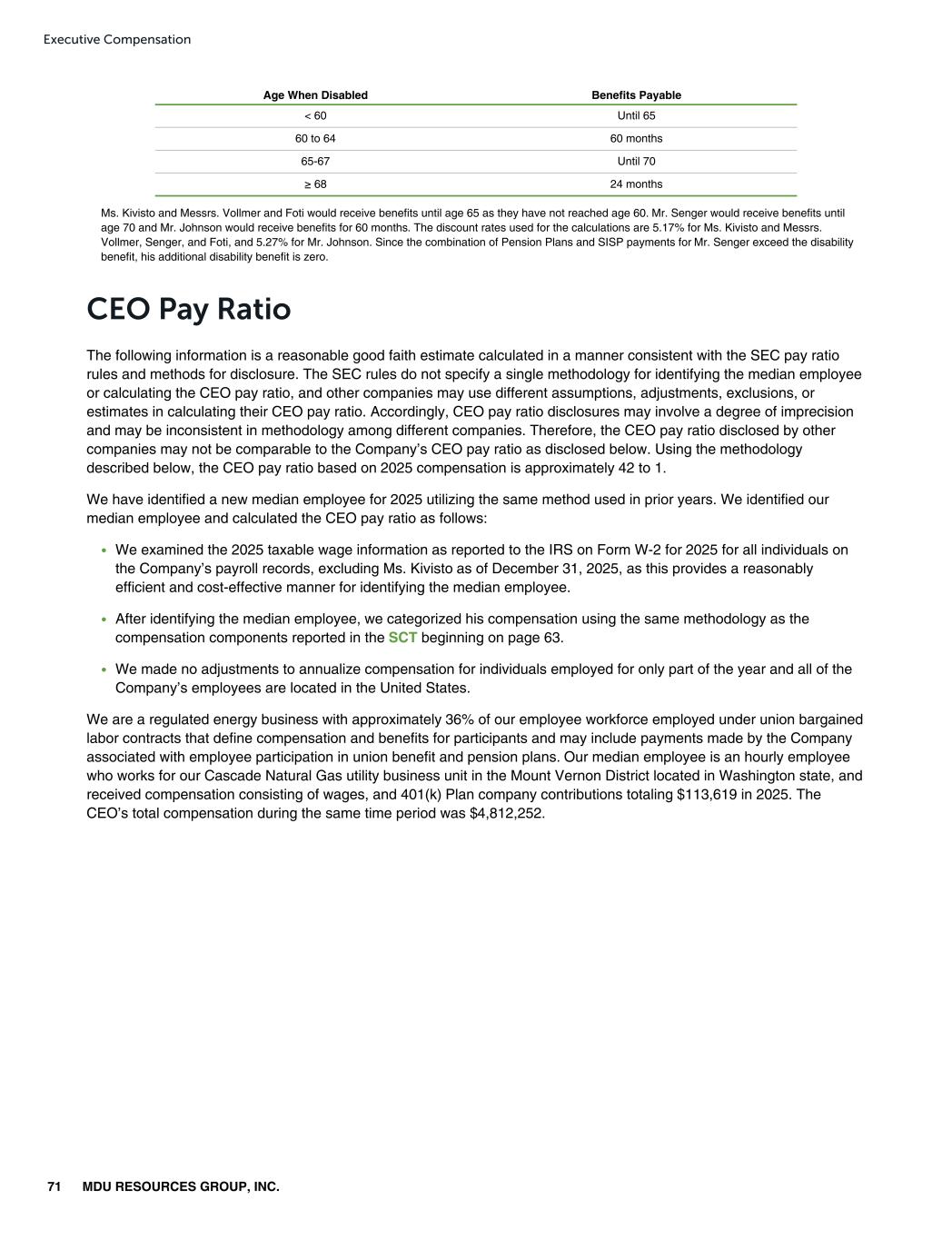 Age When Disabled Benefits Payable < 60 Until 65 60 to 64 60 months 65-67 Until 70 ≥ 68 24 months Ms. Kivisto and Messrs. Vollmer and Foti would receive benefits until age 65 as they have not reached age 60. Mr. Senger would receive benefits until age 70 and Mr. Johnson would receive benefits for 60 months. The discount rates used for the calculations are 5.17% for Ms. Kivisto and Messrs. Vollmer, Senger, and Foti, and 5.27% for Mr. Johnson. Since the combination of Pension Plans and SISP payments for Mr. Senger exceed the disability benefit, his additional disability benefit is zero. CEO Pay Ratio The following information is a reasonable good faith estimate calculated in a manner consistent with the SEC pay ratio rules and methods for disclosure. The SEC rules do not specify a single methodology for identifying the median employee or calculating the CEO pay ratio, and other companies may use different assumptions, adjustments, exclusions, or estimates in calculating their CEO pay ratio. Accordingly, CEO pay ratio disclosures may involve a degree of imprecision and may be inconsistent in methodology among different companies. Therefore, the CEO pay ratio disclosed by other companies may not be comparable to the Company’s CEO pay ratio as disclosed below. Using the methodology described below, the CEO pay ratio based on 2025 compensation is approximately 42 to 1. We have identified a new median employee for 2025 utilizing the same method used in prior years. We identified our median employee and calculated the CEO pay ratio as follows: • We examined the 2025 taxable wage information as reported to the IRS on Form W-2 for 2025 for all individuals on the Company’s payroll records, excluding Ms. Kivisto as of December 31, 2025, as this provides a reasonably efficient and cost-effective manner for identifying the median employee. • After identifying the median employee, we categorized his compensation using the same methodology as the compensation components reported in the SCT beginning on page 63. • We made no adjustments to annualize compensation for individuals employed for only part of the year and all of the Company’s employees are located in the United States. We are a regulated energy business with approximately 36% of our employee workforce employed under union bargained labor contracts that define compensation and benefits for participants and may include payments made by the Company associated with employee participation in union benefit and pension plans. Our median employee is an hourly employee who works for our Cascade Natural Gas utility business unit in the Mount Vernon District located in Washington state, and received compensation consisting of wages, and 401(k) Plan company contributions totaling $113,619 in 2025. The CEO’s total compensation during the same time period was $4,812,252. Executive Compensation 71 MDU RESOURCES GROUP, INC.