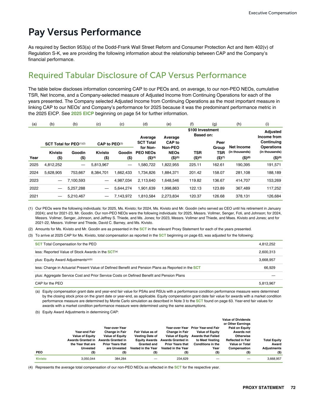 Pay Versus Performance As required by Section 953(a) of the Dodd-Frank Wall Street Reform and Consumer Protection Act and Item 402(v) of Regulation S-K, we are providing the following information about the relationship between CAP and the Company’s financial performance. Required Tabular Disclosure of CAP Versus Performance The table below discloses information concerning CAP to our PEOs and, on average, to our non-PEO NEOs, cumulative TSR, Net Income, and a Company-selected measure of Adjusted Income from Continuing Operations for each of the years presented. The Company selected Adjusted Income from Continuing Operations as the most important measure in linking CAP to our NEOs’ and Company’s performance for 2025 because it was the predominant performance metric in the 2025 EICP. See 2025 EICP beginning on page 54 for further information. (a) (b) (b) (c) (c) (d) (e) (f) (g) (h) (i) Year Average SCT Total for Non- PEO NEOs ($)(4) Average CAP to Non-PEO NEOs ($)(5) Value of Initial Fixed $100 Investment Based on: Net Income (in thousands) ($)(8) Adjusted Income from Continuing Operations (in thousands) ($)(9) SCT Total for PEO(1)(2) CAP to PEO(3) TSR ($)(6) Peer Group TSR ($)(7) Kivisto ($) Goodin ($) Kivisto ($) Goodin ($) 2025 4,812,252 — 5,813,967 — 1,580,722 1,822,955 225.11 162.61 190,395 191,571 2024 5,628,905 753,667 8,384,701 1,662,433 1,734,826 1,884,371 201.42 158.07 281,108 188,189 2023 — 7,100,593 — 4,987,034 2,113,640 1,648,546 119.82 136.67 414,707 153,269 2022 — 5,257,288 — 5,644,274 1,901,639 1,998,863 122.13 123.89 367,489 117,252 2021 — 5,210,467 — 7,143,972 1,810,584 2,273,834 120.37 126.68 378,131 126,684 (1) Our PEOs were the following individuals: for 2025, Ms. Kivisto; for 2024, Ms. Kivisto and Mr. Goodin (who served as CEO until his retirement in January 2024); and for 2021-23, Mr. Goodin. Our non-PEO NEOs were the following individuals: for 2025, Messrs. Vollmer, Senger, Foti, and Johnson; for 2024, Messrs. Vollmer, Senger, Johnson, and Jeffrey S. Thiede, and Ms. Jones; for 2023, Messrs. Vollmer and Thiede, and Mses. Kivisto and Jones; and for 2021-22, Messrs. Vollmer and Thiede, David C. Barney, and Ms. Kivisto. (2) Amounts for Ms. Kivisto and Mr. Goodin are as presented in the SCT in the relevant Proxy Statement for each of the years presented. (3) To arrive at 2025 CAP for Ms. Kivisto, total compensation as reported in the SCT beginning on page 63, was adjusted for the following: SCT Total Compensation for the PEO $ 4,812,252 less: Reported Value of Stock Awards in the SCT(a) $ 2,600,313 plus: Equity Award Adjustments(a)(b) $ 3,668,957 less: Change in Actuarial Present Value of Defined Benefit and Pension Plans as Reported in the SCT $ 66,929 plus: Aggregate Service Cost and Prior Service Costs on Defined Benefit and Pension Plans $ — CAP for the PEO $ 5,813,967 (a) Equity compensation grant date and year-end fair value for PSAs and RSUs with a performance condition performance measure were determined by the closing stock price on the grant date or year-end, as applicable. Equity compensation grant date fair value for awards with a market condition performance measure are determined by Monte Carlo simulation as described in Note 3 to the SCT found on page 63. Year-end fair values for awards with a market condition performance measure were determined using the same assumptions. (b) Equity Award Adjustments in determining CAP: PEO Year-end Fair Value of Equity Awards Granted in the Year that are Unvested ($) Year-over-Year Change in Fair Value of Equity Awards Granted in Prior Years that are Unvested ($) Fair Value as of Vesting Date of Equity Awards Granted and Vested in the Year ($) Year-over-Year Change in Fair Value of Equity Awards Granted in Prior Years that Vested in the Year ($) Prior Year-end Fair Value of Equity Awards that Failed to Meet Vesting Conditions in the Year ($) Value of Dividends or Other Earnings Paid on Equity Awards not Otherwise Reflected in Fair Value or Total Compensation ($) Total Equity Award Adjustments ($) Kivisto 3,050,044 384,284 — 234,629 — — 3,668,957 (4) Represents the average total compensation of our non-PEO NEOs as reflected in the SCT for the respective year. Executive Compensation PROXY STATEMENT 72