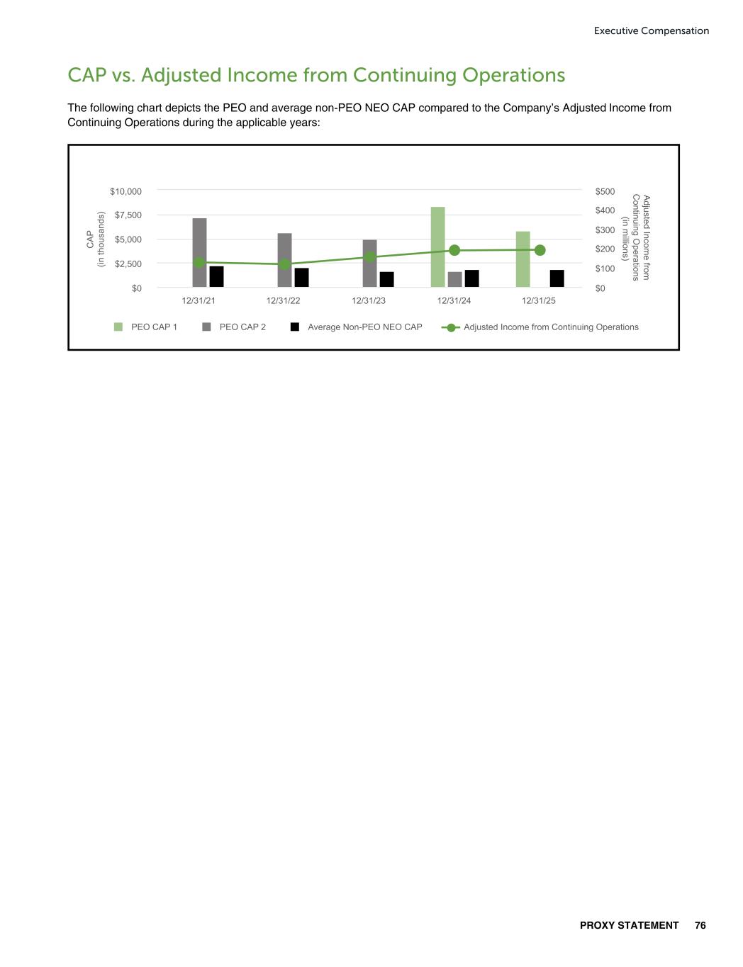 CAP vs. Adjusted Income from Continuing Operations The following chart depicts the PEO and average non-PEO NEO CAP compared to the Company’s Adjusted Income from Continuing Operations during the applicable years: C A P (in th ou sa nd s) A djusted Incom e from C ontinuing O perations (in m illions) PEO CAP 1 PEO CAP 2 Average Non-PEO NEO CAP Adjusted Income from Continuing Operations 12/31/21 12/31/22 12/31/23 12/31/24 12/31/25 $0 $2,500 $5,000 $7,500 $10,000 $0 $100 $200 $300 $400 $500 Executive Compensation PROXY STATEMENT 76