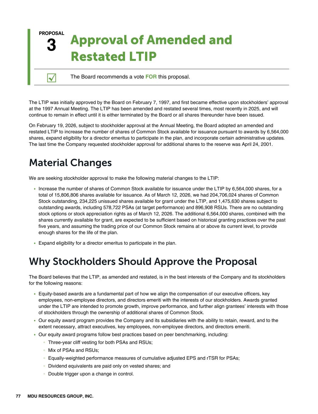 PROPOSAL Approval of Amended and Restated LTIP 3 ☑ The Board recommends a vote FOR this proposal. The LTIP was initially approved by the Board on February 7, 1997, and first became effective upon stockholders’ approval at the 1997 Annual Meeting. The LTIP has been amended and restated several times, most recently in 2025, and will continue to remain in effect until it is either terminated by the Board or all shares thereunder have been issued. On February 19, 2026, subject to stockholder approval at the Annual Meeting, the Board adopted an amended and restated LTIP to increase the number of shares of Common Stock available for issuance pursuant to awards by 6,564,000 shares, expand eligibility for a director emeritus to participate in the plan, and incorporate certain administrative updates. The last time the Company requested stockholder approval for additional shares to the reserve was April 24, 2001. Material Changes We are seeking stockholder approval to make the following material changes to the LTIP: • Increase the number of shares of Common Stock available for issuance under the LTIP by 6,564,000 shares, for a total of 15,806,806 shares available for issuance. As of March 12, 2026, we had 204,706,024 shares of Common Stock outstanding, 234,225 unissued shares available for grant under the LTIP, and 1,475,630 shares subject to outstanding awards, including 578,722 PSAs (at target performance) and 896,908 RSUs. There are no outstanding stock options or stock appreciation rights as of March 12, 2026. The additional 6,564,000 shares, combined with the shares currently available for grant, are expected to be sufficient based on historical granting practices over the past five years, and assuming the trading price of our Common Stock remains at or above its current level, to provide enough shares for the life of the plan. • Expand eligibility for a director emeritus to participate in the plan. Why Stockholders Should Approve the Proposal The Board believes that the LTIP, as amended and restated, is in the best interests of the Company and its stockholders for the following reasons: • Equity-based awards are a fundamental part of how we align the compensation of our executive officers, key employees, non-employee directors, and directors emeriti with the interests of our stockholders. Awards granted under the LTIP are intended to promote growth, improve performance, and further align grantees’ interests with those of stockholders through the ownership of additional shares of Common Stock. • Our equity award program provides the Company and its subsidiaries with the ability to retain, reward, and to the extent necessary, attract executives, key employees, non-employee directors, and directors emeriti. • Our equity award programs follow best practices based on peer benchmarking, including: ◦ Three-year cliff vesting for both PSAs and RSUs; ◦ Mix of PSAs and RSUs; ◦ Equally-weighted performance measures of cumulative adjusted EPS and rTSR for PSAs; ◦ Dividend equivalents are paid only on vested shares; and ◦ Double trigger upon a change in control. 77 MDU RESOURCES GROUP, INC.